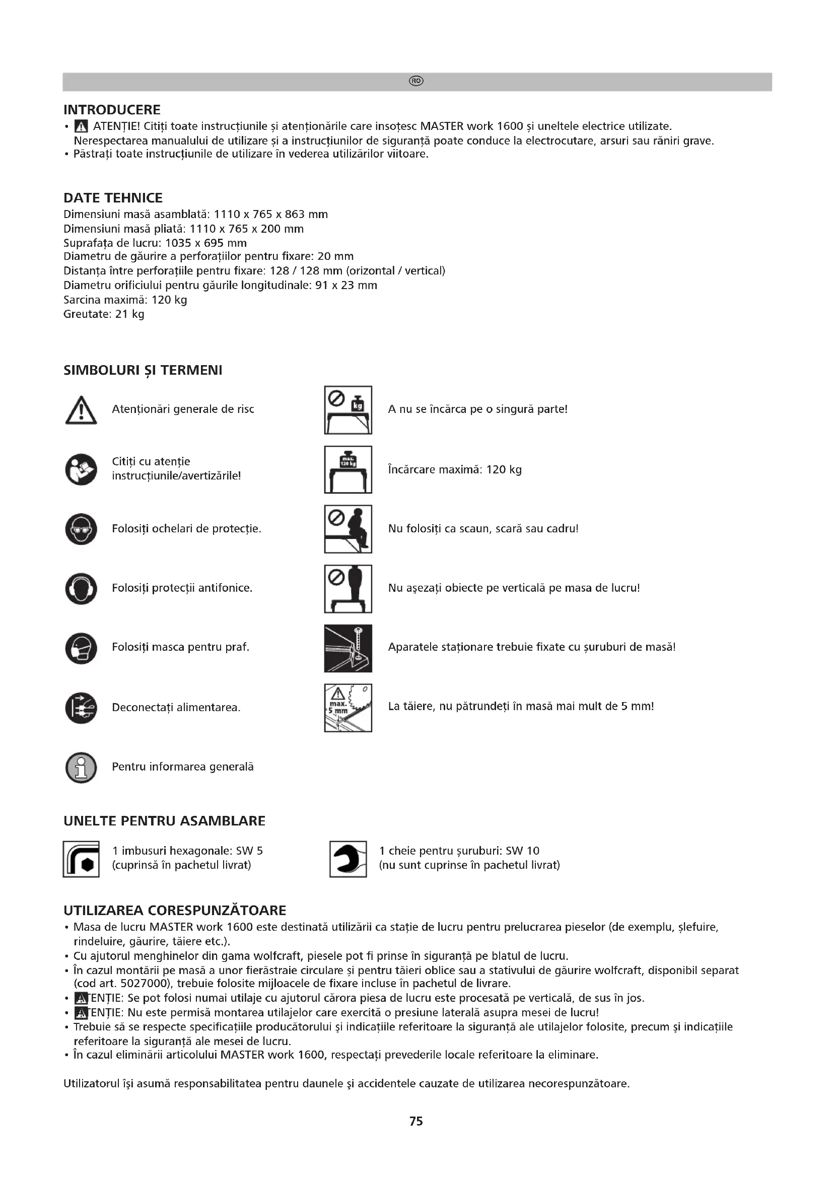 - ATENŢIE! Citiţi toate instrucţiunile și atenţionările care insoţesc MASTER work 1600 și uneltele electrice utilizate. Nerespectarea manualului de utilizare și a instrucţiunilor de siguranţă poate conduce la electrocutare, arsuri sau răniri grave.