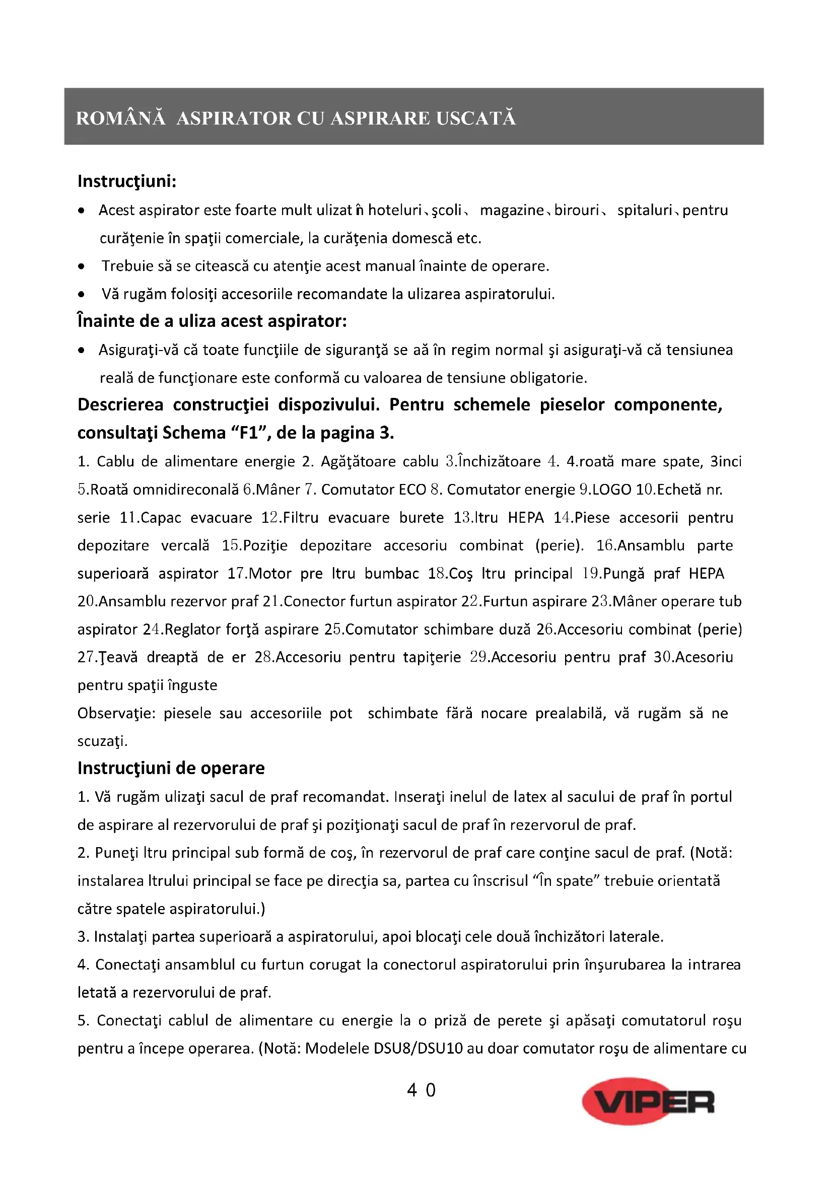 Instrucţiuni: Acest aspirator este foarte mult utilizat în hoteluri、şcoli、 magazine、birouri、 spitaluri、pentru curăţenie în spaţii comerciale, la curăţenia domestică etc. Trebuie să se citească cu atenţie acest manual înainte de operare. Vă rugăm folosiţi accesoriile recomandate la utilizarea aspiratorului. Înainte de a utiliza acest aspirator: Asiguraţi-vă că toate funcţiile de siguranţă se află în regim normal şi asiguraţi-vă că tensiunea reală de funcţionare este conformă cu valoarea de tensiune obligatorie. Descrierea construcţiei dispozitivului. Pentru schemele pieselor componente, consultaţi Schema “F1”, de la pagina 3.