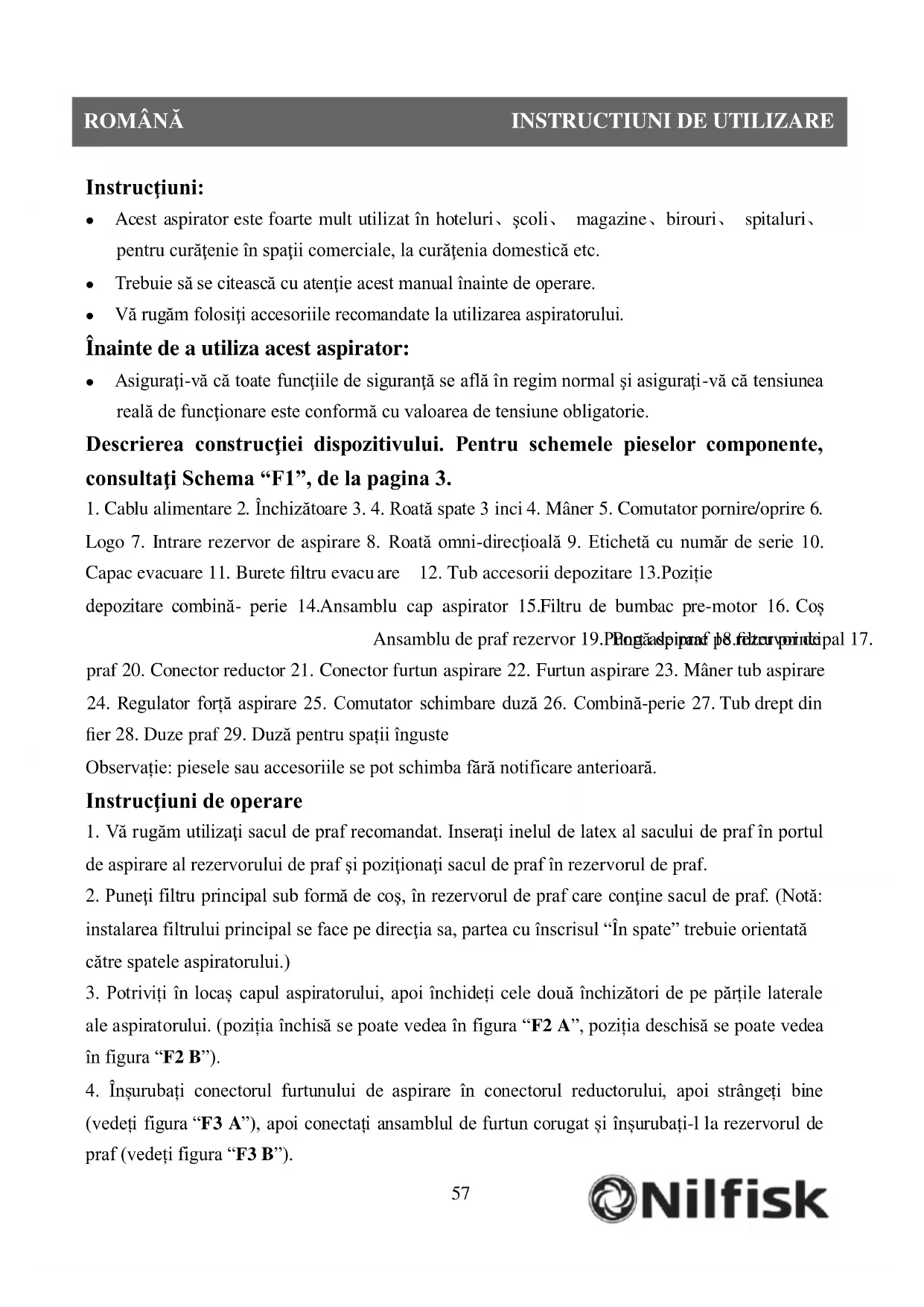 Instrucţiuni: Acest aspirator este foarte mult utilizat în hoteluri、şcoli、 magazine、birouri、 spitaluri、 pentru curăţenie în spaţii comerciale, la curăţenia domestică etc. Trebuie să se citească cu atenţie acest manual înainte de operare. Vă rugăm folosiţi accesoriile recomandate la utilizarea aspiratorului. Înainte de a utiliza acest aspirator: Asiguraţi-vă că toate funcţiile de siguranţă se află în regim normal şi asiguraţi-vă că tensiunea reală de funcţionare este conformă cu valoarea de tensiune obligatorie. Descrierea construcţiei dispozitivului. Pentru schemele pieselor componente, consultaţi Schema “F1”, de la pagina 3.