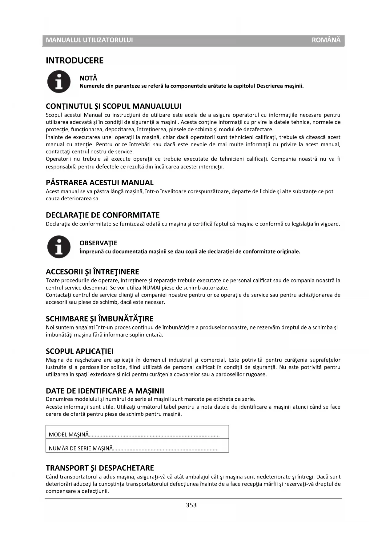 Atenţionările specifice pentru a se aduce la cunoştinţă riscul de defectare a maşinii sau de rănire a persoanelor. PERICOL! Această maşină trebuie operată de personal autorizat şi instruit în conformitate cu instrucţiunile din manual. Înainte de a executa o operaţie de curăţenie, întreţinere, reparaţie sau înlocuire, citiţi toate instrucţiunile cu atenţie; asiguraţi-vă că aţi oprit maşina (OFF) şi că aţi deconectat bateria. Nu operaţi maşina în apropierea lichidelor, prafurilor sau vaporilor toxici, periculoşi, inflamabili /sau explozivi. Această maşină nu este potrivită pentru strângerea pudrelor periculoase. Nu purtaţi bijuterii când lucraţi în vecinătatea componentelor electrice. Nu lucraţi sub maşinile ridicate fără ca acestea să fie sprijinite pe standuri de protecţie. Dacă folosiţi baterii cu plumb (WET), acestea pot emite gaze inflamabile în condiţii normale de lucru şi trebuie ferite de scântei, flăcări deschise, materiale fumigene, iradiante, iluminante şi arzătoare. La încărcarea bateriilor cu plumb (WET) acestea pot emite gaz de hidrogen ceea ce poate cauza explozie. Trebuie să se asigure faptul că mediul este bine ventilat şi ferit de flăcări deschise. ATENŢIE! 354MANUALUL UTILIZATORULUI ROMÂNĂ Verificaţi cu atenţie maşina înainte de utilizare. Asiguraţi-vă că toate componentele au fost bine asamblate înainte de utilizare. În caz contrar, pot fi cauzate avarieri ale maşinii şi rănirea persoanelor. Înainte de utilizarea încărăctorului, asiguraţi-vă că valorile frecvenţei şi tensiunea indicată pe eticheta cu numărul de serie al maşinii sunt corespunzătoare cu cele ale prizei de alimentare. Nu deplasaţi niciodată maşina trăgând de cablul încărcătorului bateriei. Nu lăsaţi cablul să treacă printr-o uşă închisă şi nici nu îl înfăşuraţi pe margini ascuţite, nici nu îl îndoiţi în unghiuri ascuţite. Nu treceţi cu maşina peste cablul de încărcare al bateriei. Feriţi cablul încărcătorului de suprafeţe încălzite. Nu încărcaţi bateriile dacă ştecherul sau cablul încărcătorului sunt defecte. Pentru reducerea riscului de incendiu, de electrocutare sau rănire, asiguraţi-vă că maşina este oprită înainte de plecare. Utilizaţi şi depozitaţi maşina în spaţii închise, pe suprafeţe uscate; este interzisă utilizarea ei în exterior. Temperatura de lucru şi de depozitare a maşinii trebuie să fie între 0 °C şi +40 °C, umiditatea aerului trebuie să fie de 30% - 95%. Nu utilizaţi maşina pe suprafeţe în pantă cu unghi mai mare decât în specificaţia dată. Când utilizaţi şi manipulaţi detergenţi pentru curăţare, urmaţi instrucţiunile de pe etichetele ambalajelor de detergent şi purtaţi mănuşi corespunzătoare şi echipament de protecţie. Utilizaţi periile şi materialele textile furnizate cu maşina sau aşa cum se prevede în manual. Utilizarea altor tipuri de perie sau materiale textile pot duce la diminuarea protecţiei. În caz de funcţionare defectuosă a maşinii, asiguraţi-vă că aceasta nu se datorează lipsei operaţiilor de întreţinere. Dacă este necesar, solicitaţi asistenţă din partea personalului autorizat sau de la un centru service autorizat. Luaţi toate măsurile de precauţie pentru a preveni prinderea părului, a bijuteriilor, a hainelor largi, în piesele aflate în mişcare ale maşinii. Nu utilizaţi maşina în zone cu foarte mult praf. Nu spălaţi maşina cu jet direct de apă sau cu apă sub presiune şi nici cu substanţe corozive. Nu tamponaţi maşina de rafturi sau de schele, mai ales dacă există riscul de cădere a diferitelor obiecte. Nu puneţi pe maşină recipiente cu lichid, utilizaţi suportul dedicat pentru acestea. Pentru evitarea degradării podelei, nu lăsaţi peria în funcţionare în timp ce maşina staţionează. În caz de incendiu, utilizaţi un extinctor cu praf. A nu se utiliza extinctoare cu lichid. A nu se scoate sau modifica etichetele de pe maşină. Elementele de protecţie ale maşinii să fie menţinute în bună stare de funcţionare, iar instrucţiunile de mentenanţă să fie aplicate temeinic şi în detaliu. Transportul maşinii când temperaturile sunt sub punctul de îngheţ se va face cu atenţie. Apa din rezervorul de recuperare şi din furtune poate îngheţa şi cauza defecţiuni grave ale maşinii. Dacă trebuie înlocuite piesele de schimb, comandaţi piese de schimb ORIGINALE de la reprezentanţi comerciali autorizaţi. Returnaţi maşina la centrul de service dacă aceasta nu funcţionează în mod normal sau este în stare de avariere, a fost ţinută în spaţii exterioare sau a căzut în apă. Pentru a vă asigura de funcţionarea în condiţii de siguranţă a maşinii, operaţiile de întreţinere programată indicate în capitolul relevant trebuie să se execute de personal autorizat sau de un centru service. Maşina se va dezafecta în mod corespunzător întrucât conţine substanţe dăunătoare (baterii, etc.), ce se supun prevederilor standardelor ce impun dezafectarea în centre speciale (vedeţi capitolul Dezafectare). A se utiliza această maşină numai ca unealtă de curăţare, nu în alt scop. A se menţine întotdeauna orificiile neînfundate cu păr, praf sau alte corpuri străine, care ar putea reduce debitul de aer. A nu se utiliza maşina dacă orificiile ei sunt înfundate. A se utiliza maşina numai în locuri iluminate în mod corespunzător. Această maşină nu se va folosi de către persoane cu capacităţi mintale, senzoriale sau fizice reduse, sau de către persoane fără experienţă şi cunoştinţe adecvate, decât dacă sunt supravegheate sau instruite cu privire la utilizarea maşinii de către o persoană responsabilă cu protecţia muncii. Se va da atenţie deosebită când maşina este folosită în preajma copiilor. Copiii vor fi supravegheaţi să nu se joace cu maşina. În timpul funcţion