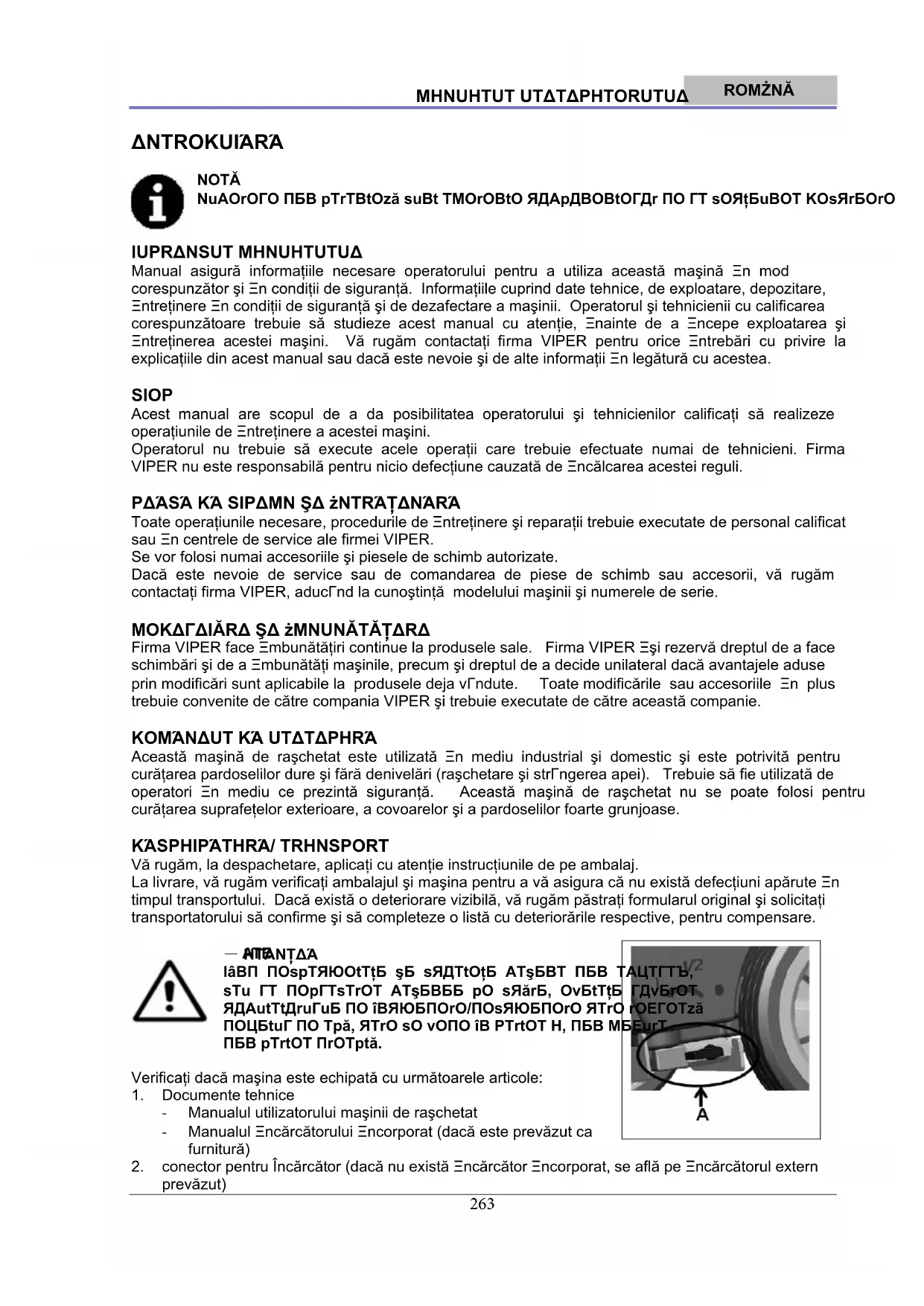 CUPRINSUL MANUALULUI Manual asigură informaţiile necesare operatorului pentru a utiliza această maşină în mod corespunzător şi în condiţii de siguranţă. Informaţiile cuprind date tehnice, de exploatare, depozitare, întreţinere în condiţii de siguranţă şi de dezafectare a maşinii. Operatorul şi tehnicienii cu calificarea corespunzătoare trebuie să studieze acest manual cu atenţie, înainte de a începe exploatarea şi întreţinerea acestei maşini. Vă rugăm contactaţi firma VIPER pentru orice întrebări cu privire la explicaţiile din acest manual sau dacă este nevoie şi de alte informaţii în legătură cu acestea. SCOP Acest manual are scopul de a da posibilitatea operatorului şi tehnicienilor calificaţi să realizeze operaţiunile de întreţinere a acestei maşini. Operatorul nu trebuie să execute acele operaţii care trebuie efectuate numai de tehnicieni. Firma VIPER nu este responsabilă pentru nicio defecţiune cauzată de încălcarea acestei reguli.