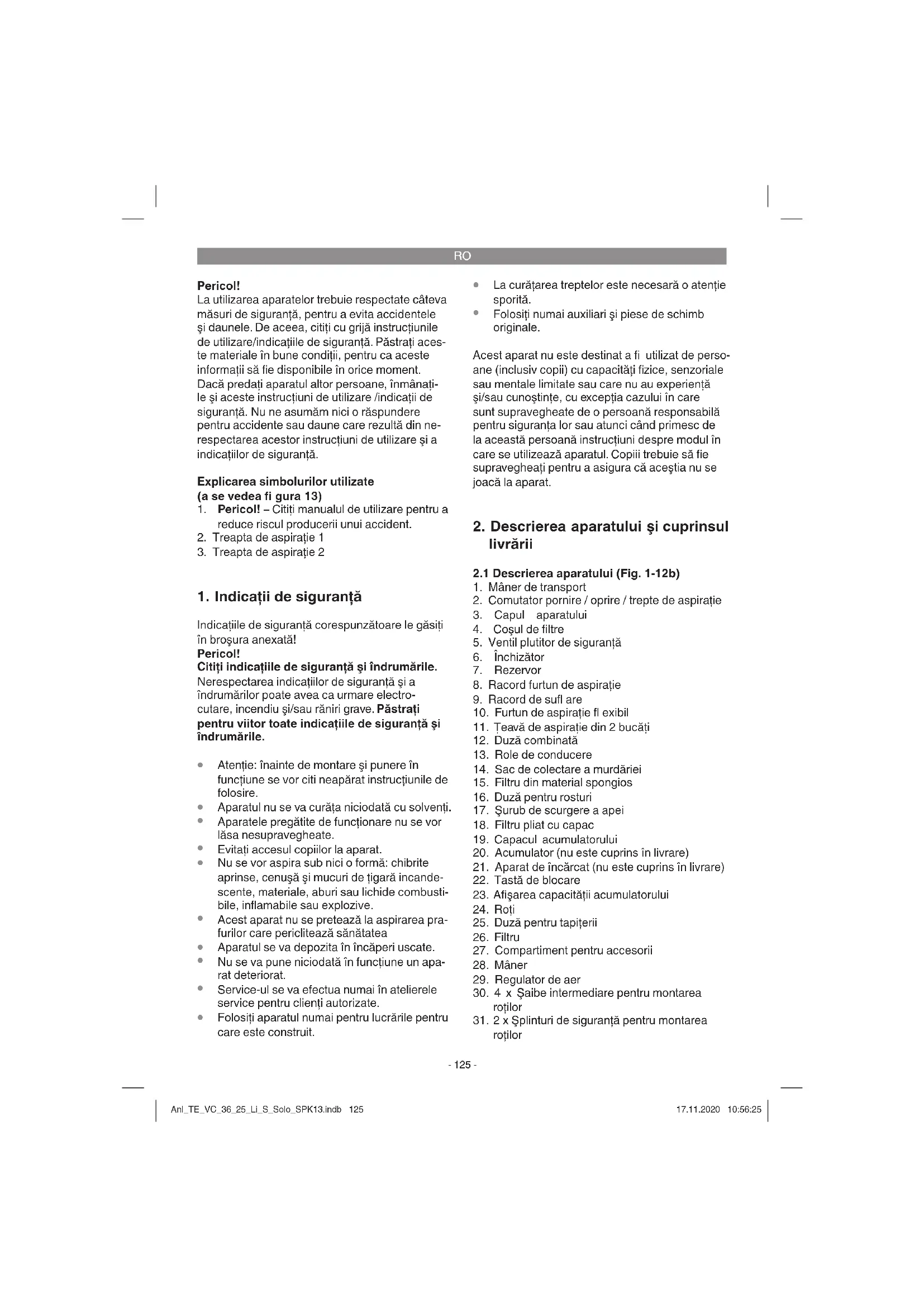 şi pachetul de acumulatori la service-ul nostru pentru clienţi. În scopul unei expedieri corespunzătoare, vă rugăm să contactaţi serviciul nostru pentru clienţi sau magazinul la care aţi achiziţionat aparatul. Ţineţi cont la expedierea sau eliminarea acu- mulatorilor resp. a aparatelor cu acumulator, ca acestea să fi e ambalate separat în pungi din material plastic, pentru a evita un scurt- circuit sau incendiu! În interesul unei durate îndelungate de utilizare a pachetului de acumulatori trebuie să asiguraţi încărcarea la timp a pachetului de acumulatori. Acest lucru este necesar în orice caz atunci Anl_TE_VC_36_25_Li_S_Solo_SPK13.indb 127Anl_TE_VC_36_25_Li_S_Solo_SPK13.indb 127 17.11.2020 10:56:2517.11.2020 10:56:25RO