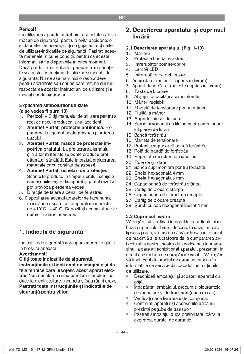 Indicaţie! Asiguraţi-vă că distribuţia dinţilor benzii ferăstrăului utilizat este adecvată pentru materialul care trebuie tăiat. În cazul unor materiale extrem de dure sau a unor rezistenţe extrem de mari la intruziune a ben- zii ferăstrăului, trebuie înlocuită și distribuţia dinţilor și astfel și banda ferăstrăului. Anl_TE_MB_18_127_Li_SPK13.indb 146Anl_TE_MB_18_127_Li_SPK13.indb 146 20.02.2024 09:07:2420.02.2024 09:07:24RO