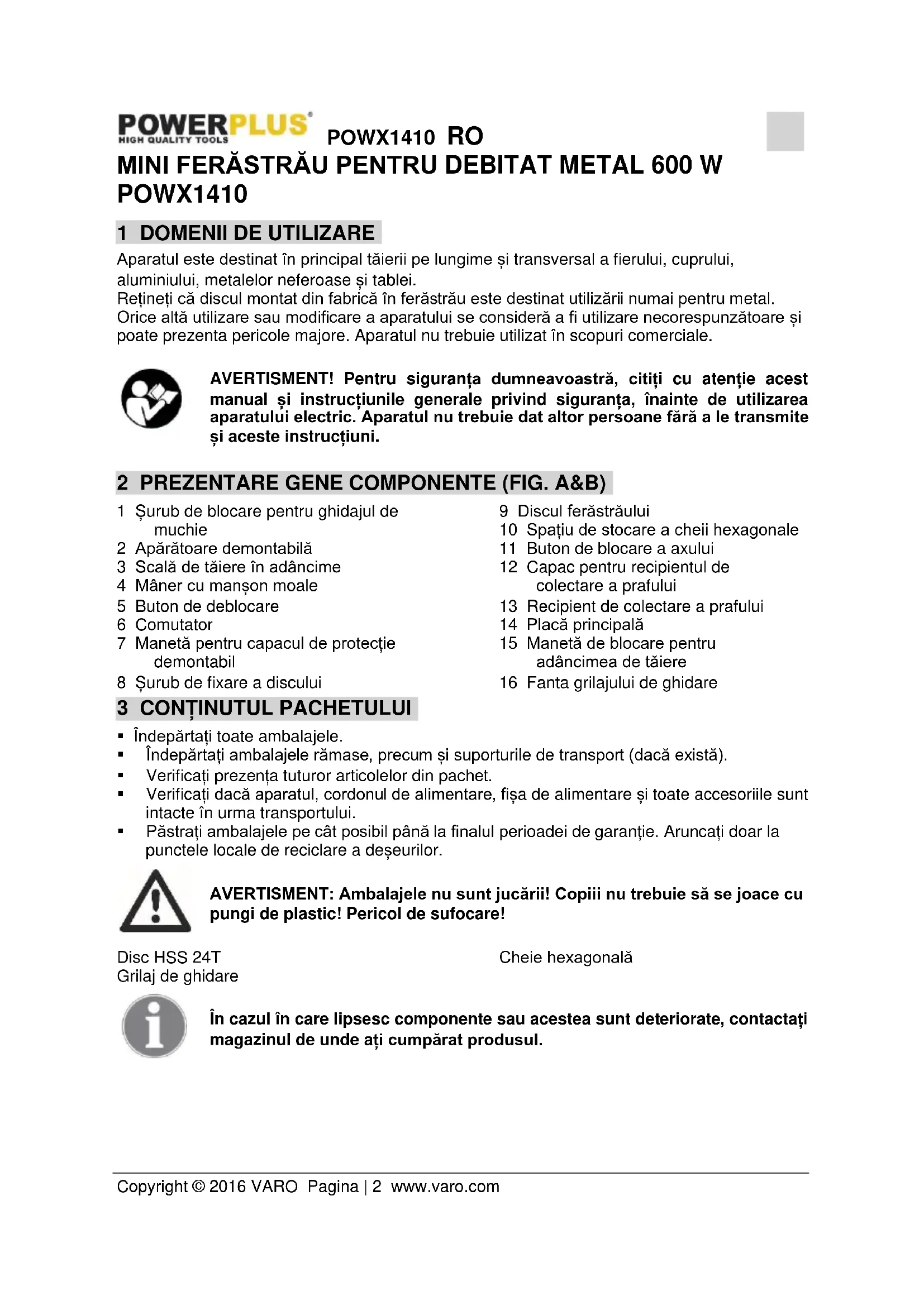 VARO N.V. - Joseph Van Instraat 9 - BE2500 Lier - BELGIA, declară că Produsul: Mini Ferăstrău Pentru Debitat Metal 600 W Marcă de comerț: POWERplus Model: POWX1410 este în conformitate cu specificațiile esențiale și alte prevederi relevante ale Directivelor Europene aplicabile, pe baza aplicării standardelor europene armonizate. Orice modificare neautorizată a aparatelor atrage după sine anularea acestei declarații. Directivele europene (inclusiv, dacă este cazul, amendamentele lor, până la data semnăturii): 2011/65/EU 2006/42/EC 2014/30/EU Standardele europene armonizate (inclusiv, dacă este cazul, amendamentele lor, până la data semnăturii): EN60745-1 : 2009 EN60745-2-5 : 2010 EN55014-1 : 2006 EN55014-2 : 1997 EN61000-3-2 : 2014 EN61000-3-3 : 2013 Persoana care păstrează documentația tehnică: Philippe Vankerkhove, VARO – Vic. Van Rompuy N.V. Subsemnatul acționează în numele Directorului general executiv al societății, Philippe Vankerkhove Divizia de reglementare – Director de conformitate 28/04/2016POWX1410 HU Copyright © 2016 VARO с т р а н и ц а | 1 www.varo.com 1 ALKALMAZÁS ................................................................................... 2 2 ALKATRÉSZEK ÁTTEKINTÉSE (A ÉS B ÁBRA) ............................ 2
