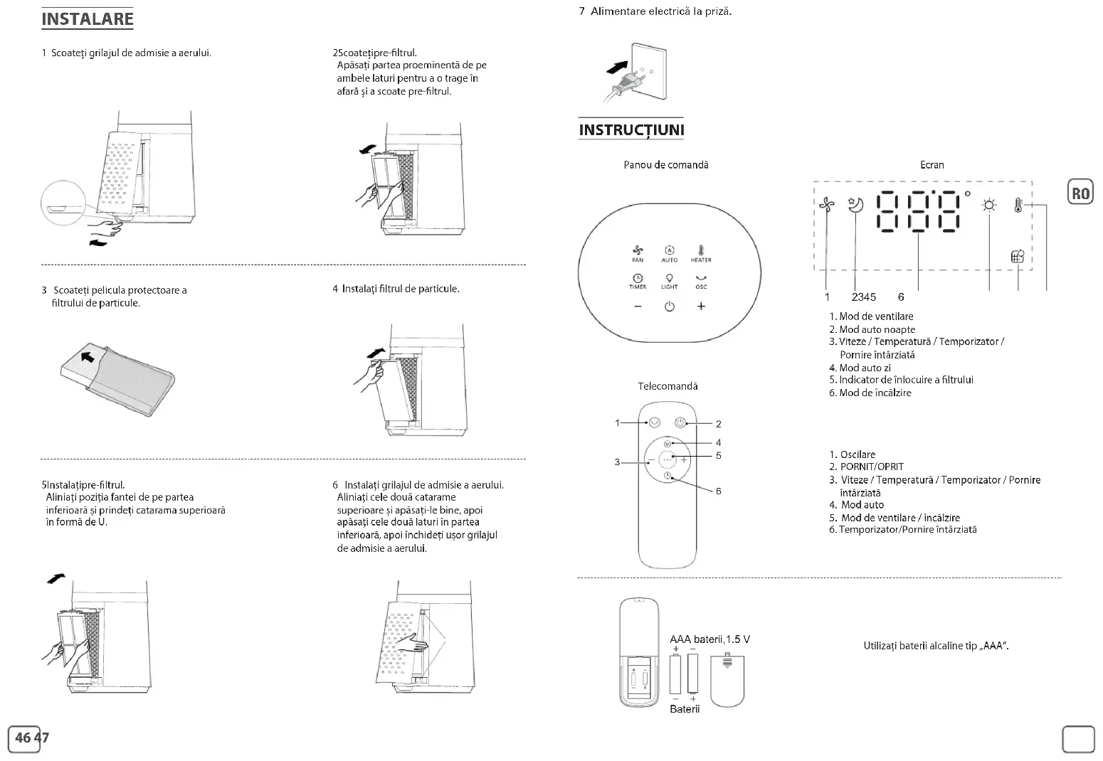INSTALARE 1 Scoateți grilajul de admisie a aerului. 3 Scoateți pelicula protectoare a ltrului de particule. 5 Instalați pre-ltrul. Aliniați poziția fantei de pe partea inferioară și prindeți catarama superioară în formă de U. 6 Instalați grilajul de admisie a aerului. Aliniați cele două catarame superioare și apăsați-le bine, apoi apăsați cele două laturi în partea inferioară, apoi închideți ușor grilajul de admisie a aerului. 4 Instalați ltrul de particule. 2 Scoateți pre-ltrul. Apăsați partea proeminentă de pe ambele laturi pentru a o trage în afară și a scoate pre-ltrul. 7 Alimentare electrică la priză. INSTRUCȚIUNI Panou de comandă Telecomandă Ecran