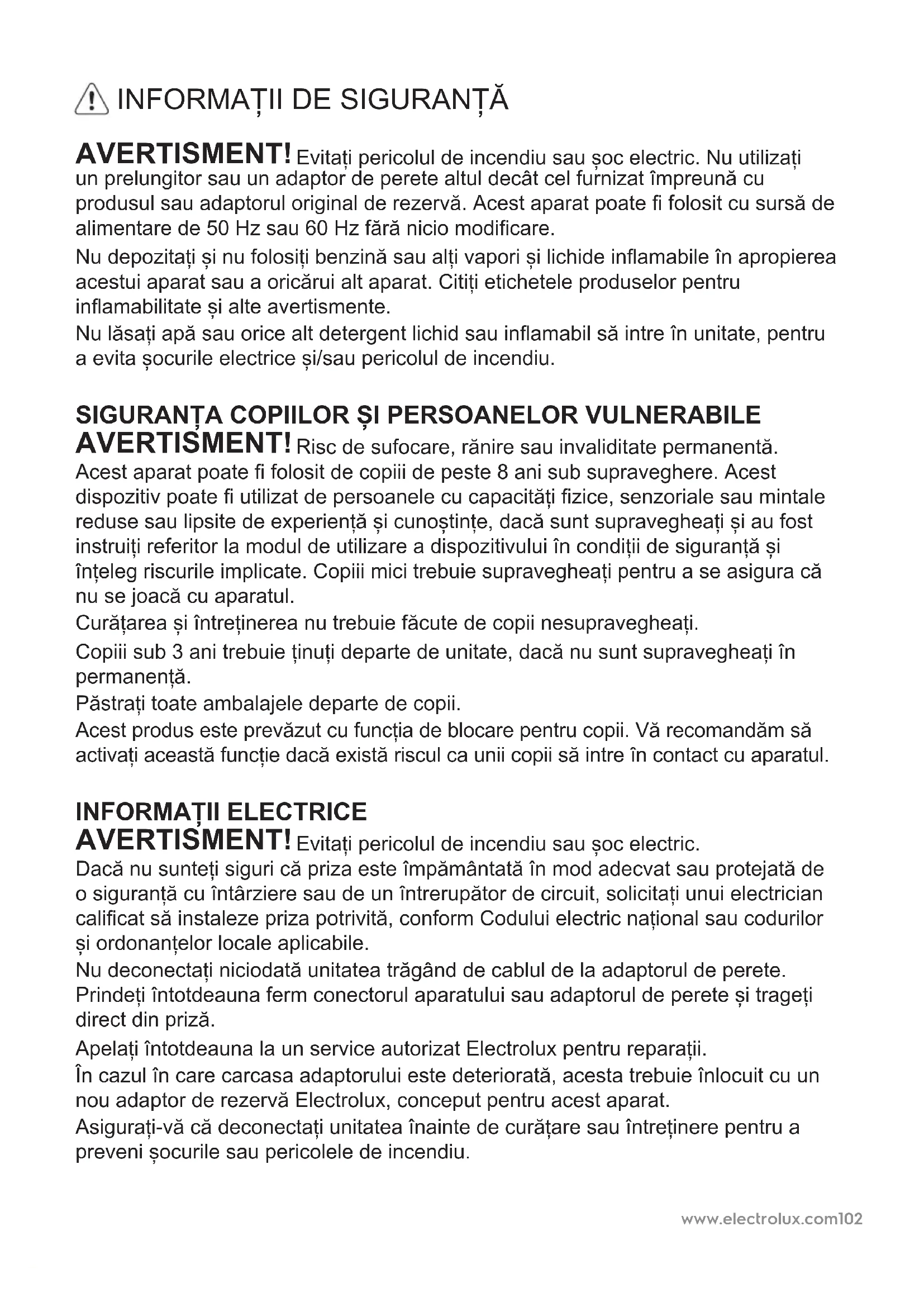 AVERTISMENT! Evitați pericolul de incendiu sau șoc electric. Dacă nu sunteți siguri că priza este împământată în mod adecvat sau protejată de o siguranță cu întârziere sau de un întrerupător de circuit, solicitați unui electrician calicat să instaleze priza potrivită, conform Codului electric național sau codurilor și ordonanțelor locale aplicabile. Nu deconectați niciodată unitatea trăgând de cablul de la adaptorul de perete. Prindeți întotdeauna ferm conectorul aparatului sau adaptorul de perete și trageți direct din priză. Apelați întotdeauna la un service autorizat Electrolux pentru reparații. În cazul în care carcasa adaptorului este deteriorată, acesta trebuie înlocuit cu un nou adaptor de rezervă Electrolux, conceput pentru acest aparat. Asigurați-vă că deconectați unitatea înainte de curățare sau întreținere pentru a preveni șocurile sau pericolele de incendiu.www.electrolux.com 103