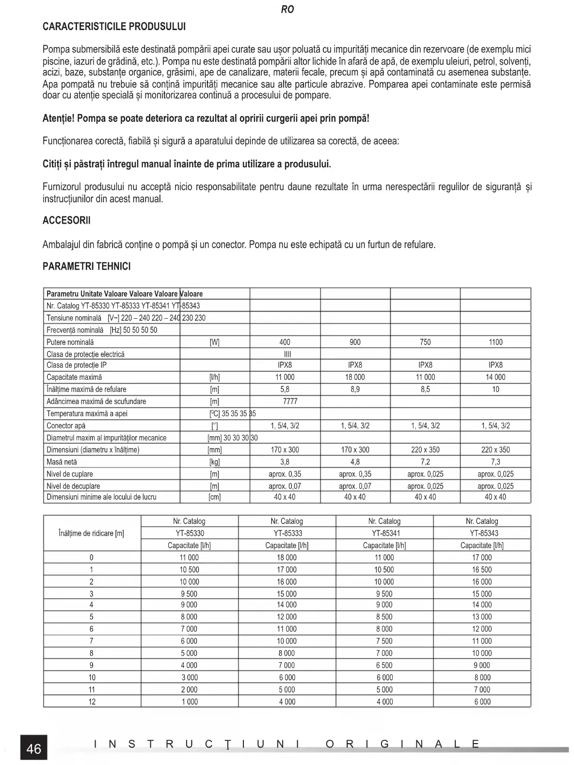 instrucțiunilor din acest manual. ACCESORII Ambalajul din fabrică conține o pompă și un conector. Pompa nu este echipată cu un furtun de refulare. PARAMETRI TEHNICI Parametru Unitate Valoare Valoare Valoare Valoare Nr. Catalog YT-85330 YT-85333 YT-85341 YT-85343 Tensiune nominală [V~] 220 – 240 220 – 240 230 230 Frecvență nominală [Hz] 50 50 50 50 Putere nominală [W] 400 900 750 1100 Clasa de protecție electrică IIII Clasa de protecție IP IPX8 IPX8 IPX8 IPX8 Capacitate maximă [l/h] 11 000 18 000 11 000 14 000 Înălțime maximă de refulare [m] 5,8 8,9 8,5 10 Adâncimea maximă de scufundare [m] 7777 Temperatura maximă a apei [