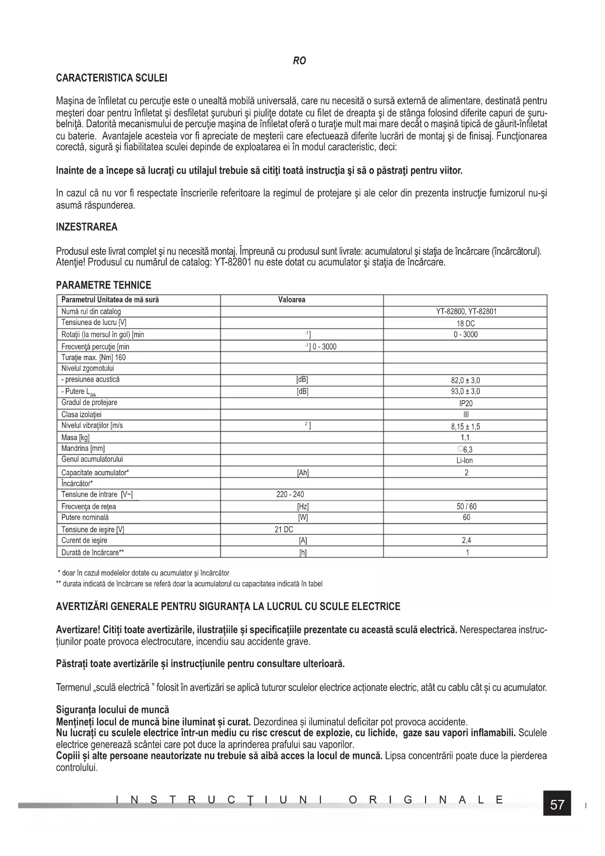 CARACTERISTICA SCULEI Maşina de înfi letat cu percuţie este o unealtă mobilă universală, care nu necesită o sursă externă de alimentare, destinată pentru meşteri doar pentru înfi letat şi desfi letat şuruburi şi piuliţe dotate cu fi let de dreapta şi de stânga folosind diferite capuri de şuru- belniţă. Datorită mecanismului de percuţie maşina de înfi letat oferă o turaţie mult mai mare decât o maşină tipică de găurit-înfi letat cu baterie. Avantajele acesteia vor fi apreciate de meşterii care efectuează diferite lucrări de montaj şi de fi nisaj. Funcţionarea corectă, sigură şi fi abilitatea sculei depinde de exploatarea ei în modul caracteristic, deci: Inainte de a începe să lucraţi cu utilajul trebuie să citiţ i toată instrucţia şi să o păstraţi pentru viitor. In cazul că nu vor fi respectate înscrierile referitoare la regimul de protejare şi ale celor din prezenta instrucţie furnizorul nu-şi asumă răspunderea. INZESTRAREA Produsul este livrat complet şi nu necesită montaj. Împreună cu produsul sunt livrate: acumulatorul şi staţia de încărcare (încărcătorul). Atenţie! Produsul cu numărul de catalog: YT-82801 nu este dotat cu acumulator şi staţia de încărcare. PARAMETRE TEHNICE Parametrul Unitatea de mă sură Valoarea Numă rul din catalog YT-82800, YT-82801 Tensiunea de lucru [V] 18 DC Rotaţii (la mersul în gol) [min