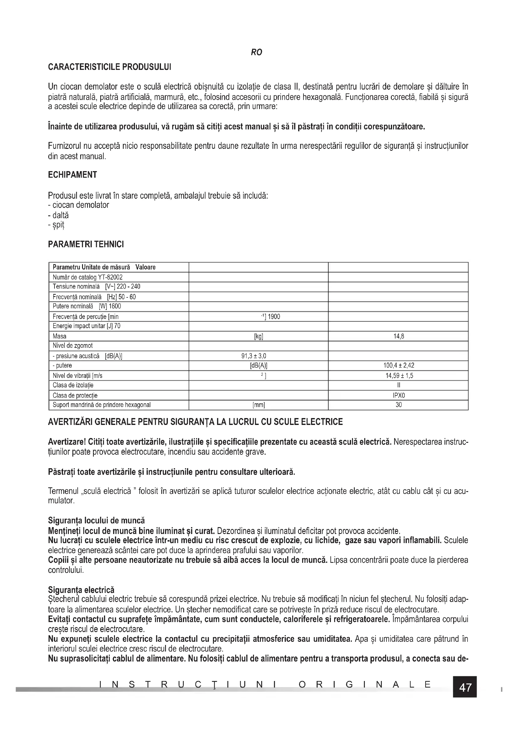 CARACTERISTICILE PRODUSULUI Un ciocan demolator este o sculă electrică obișnuită cu izolație de clasa II, destinată pentru lucrări de demolare și dăltuire în piatră naturală, piatră artifi cială, marmură, etc., folosind accesorii cu prindere hexagonală. Funcționarea corectă, fi abilă și sigură a acestei scule electrice depinde de utilizarea sa corectă, prin urmare: Înainte de utilizarea produsului, vă rugăm să citiți acest manual și să îl păstrați în condiții corespunzătoare. Furnizorul nu acceptă nicio responsabilitate pentru daune rezultate în urma nerespectării regulilor de siguranță și instrucțiunilor din acest manual. ECHIPAMENT Produsul este livrat în stare completă, ambalajul trebuie să includă: - ciocan demolator - daltă - șpiț PARAMETRI TEHNICI Parametru Unitate de măsură Valoare Număr de catalog YT-82002 Tensiune nominală [V~] 220 - 240 Frecvență nominală [Hz] 50 - 60 Putere nominală [W] 1600 Frecvență de percuție [min