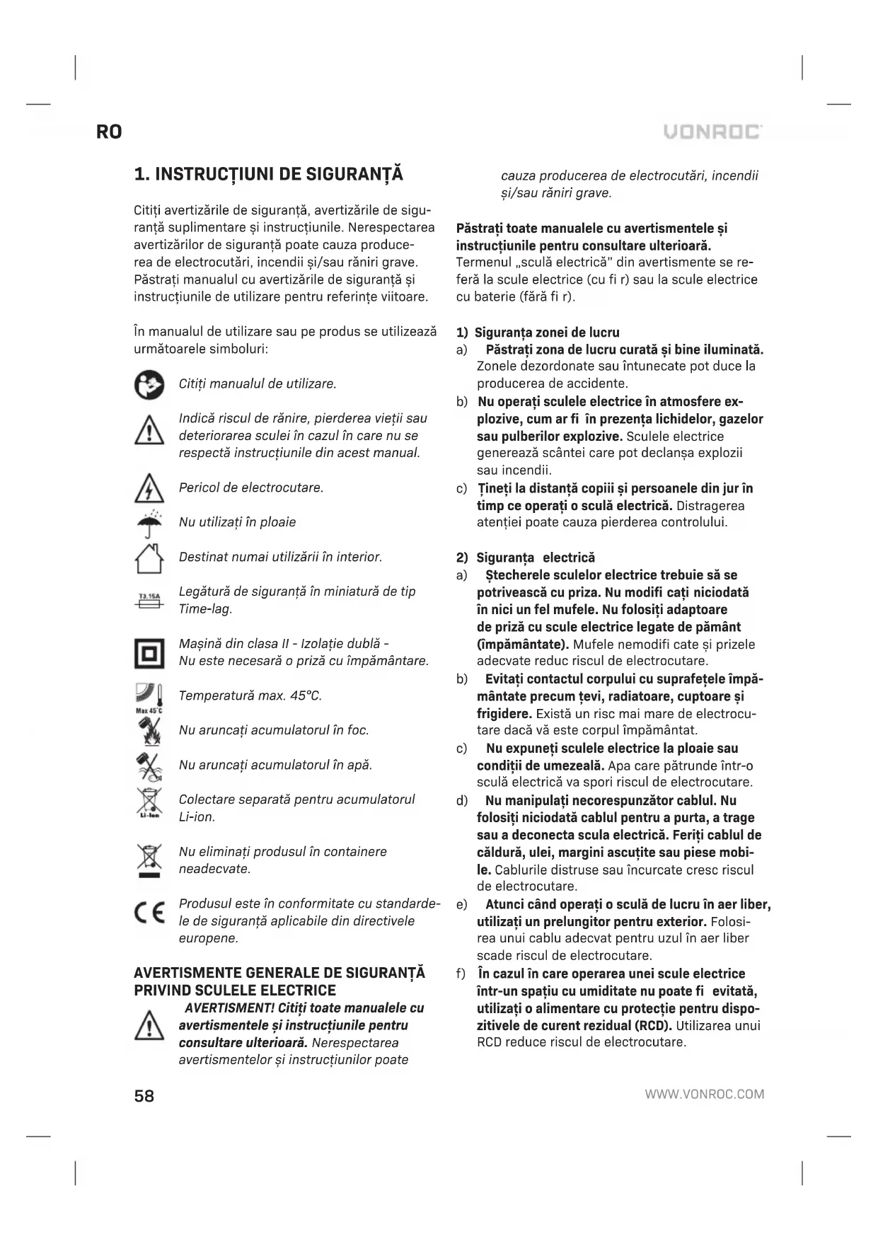 - Folosirea unor piese de schimbe neoriginale. Aceasta acoperă garanția companiei, explicită sau implicită. Nu există alte garanții explicite sau impli- cite care să se extindă dincolo de cele indicate aici, incluzând garanțiile, vandabilitatea sau adecvarea pentru un anumit scop. În nicio situație, VONROC nu este responsabil pentru daunele accidentale sau subsecvente. Reparațiile efectuate de reprezentant trebuie să fi e limitate la reparațiile sau la înlocuirea unităților sau a pieselor neconforme. Produsul și manualul de utilizare pot suferi modi- fi cări. Specifi cațiile se pot modifi ca fără notifi care prealabilă.64