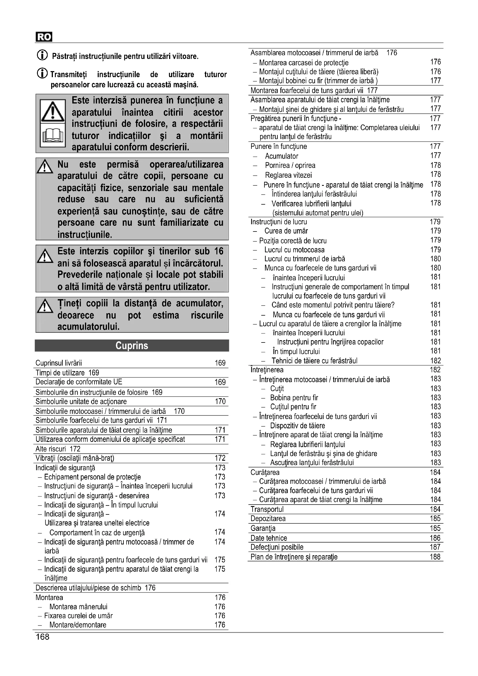 Păstraţi instrucţiunile pentru utilizări viitoare. Transmiteţi instrucţiunile de utilizare tuturor persoanelor care lucrează cu această maşină. Este interzisă punerea în funcţiune a aparatului înaintea citirii acestor instrucţiuni de folosire, a respectării tuturor indicaţiilor şi a montării aparatului conform descrierii. Nu este permisă operarea/utilizarea aparatului de către copii, persoane cu capacități fizice, senzoriale sau mentale reduse sau care nu au suficientă experiență sau cunoștințe, sau de către persoane care nu sunt familiarizate cu instrucțiunile. Este interzis copiilor şi tinerilor sub 16 ani să folosească aparatul și încărcătorul. Prevederile naționale și locale pot stabili o altă limită de vârstă pentru utilizator. Țineți copiii la distanță de acumulator, deoarece nu pot estima riscurile acumulatorului. Cuprins Cuprinsul livrării 169 Timpi de utilizare 169 Declaraţie de conformitate UE Simbolurile din instrucţiunile de folosire 169 Simbolurile unitate de acţionare 170Simbolurile motocoasei / trimmerului de iarbă 170Simbolurile foarfecelui de tuns garduri vii 171 Simbolurile aparatului de tăiat crengi la înălţime 171 Utilizarea conform domeniului de aplicaţie specificat 171 Alte riscuri 172 Vibraţii (oscilaţii mână-braţ) 172 Indicaţii de siguranţă 173 Echipament personal de protecţie