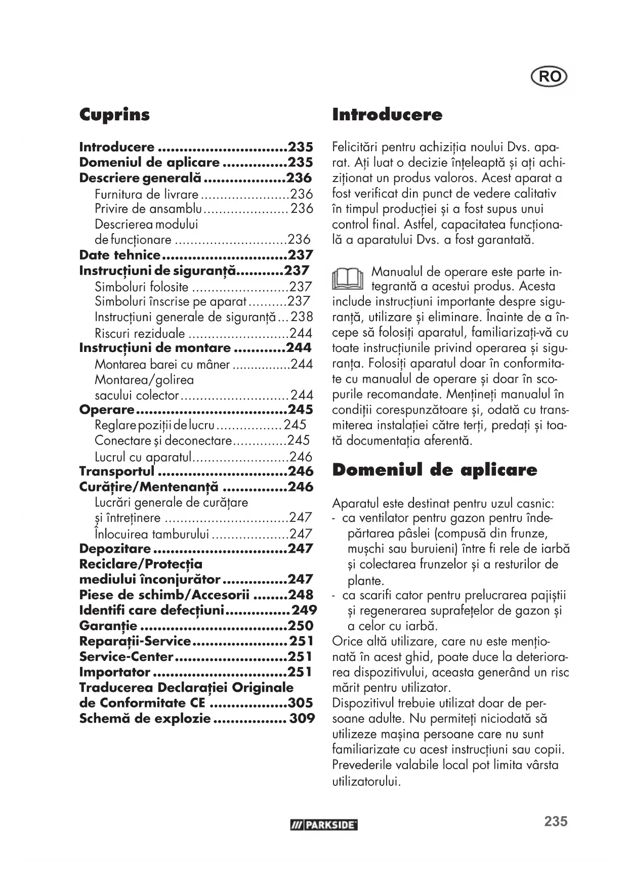 - Introducere Felicitări pentru achiziţia noului Dvs. apa- rat. Aţi luat o decizie înţeleaptă și aţi achi- ziţionat un produs valoros. Acest aparat a fost veri cat din punct de vedere calitativ în timpul producţiei și a fost supus unui control nal. Astfel, capacitatea funcţiona- lă a aparatului Dvs. a fost garantată. Manualul de operare este parte in- tegrantă a acestui produs. Acesta include instrucţiuni importante despre sigu- ranţă, utilizare și eliminare. Înainte de a în- cepe să folosiţi aparatul, familiarizaţi-vă cu toate instrucţiunile privind operarea și sigu- ranţa. Folosiţi aparatul doar în conformita- te cu manualul de operare și doar în sco- purile recomandate. Menţineţi manualul în condiţii corespunzătoare și, odată cu trans- miterea instalaţiei către terţi, predaţi și toa- tă documentaţia aferentă. Domeniul de aplicare Aparatul este destinat pentru uzul casnic: - ca ventilator pentru gazon pentru înde- părtarea pâslei (compusă din frunze, mușchi sau buruieni) între rele de iarbă şi colectarea frunzelor și a resturilor de plante. - ca scari cator pentru prelucrarea pajiștii și regenerarea suprafețelor de gazon și a celor cu iarbă. Orice altă utilizare, care nu este menţio- nată în acest ghid, poate duce la deteriora- rea dispozitivului, aceasta generând un risc mărit pentru utilizator. Dispozitivul trebuie utilizat doar de per- soane adulte. Nu permiteți niciodată să utilizeze mașina persoane care nu sunt familiarizate cu acest instrucțiuni sau copii. Prevederile valabile local pot limita vârsta utilizatorului. Traducerea Declaraţiei Originale de Conformitate CE p. 305