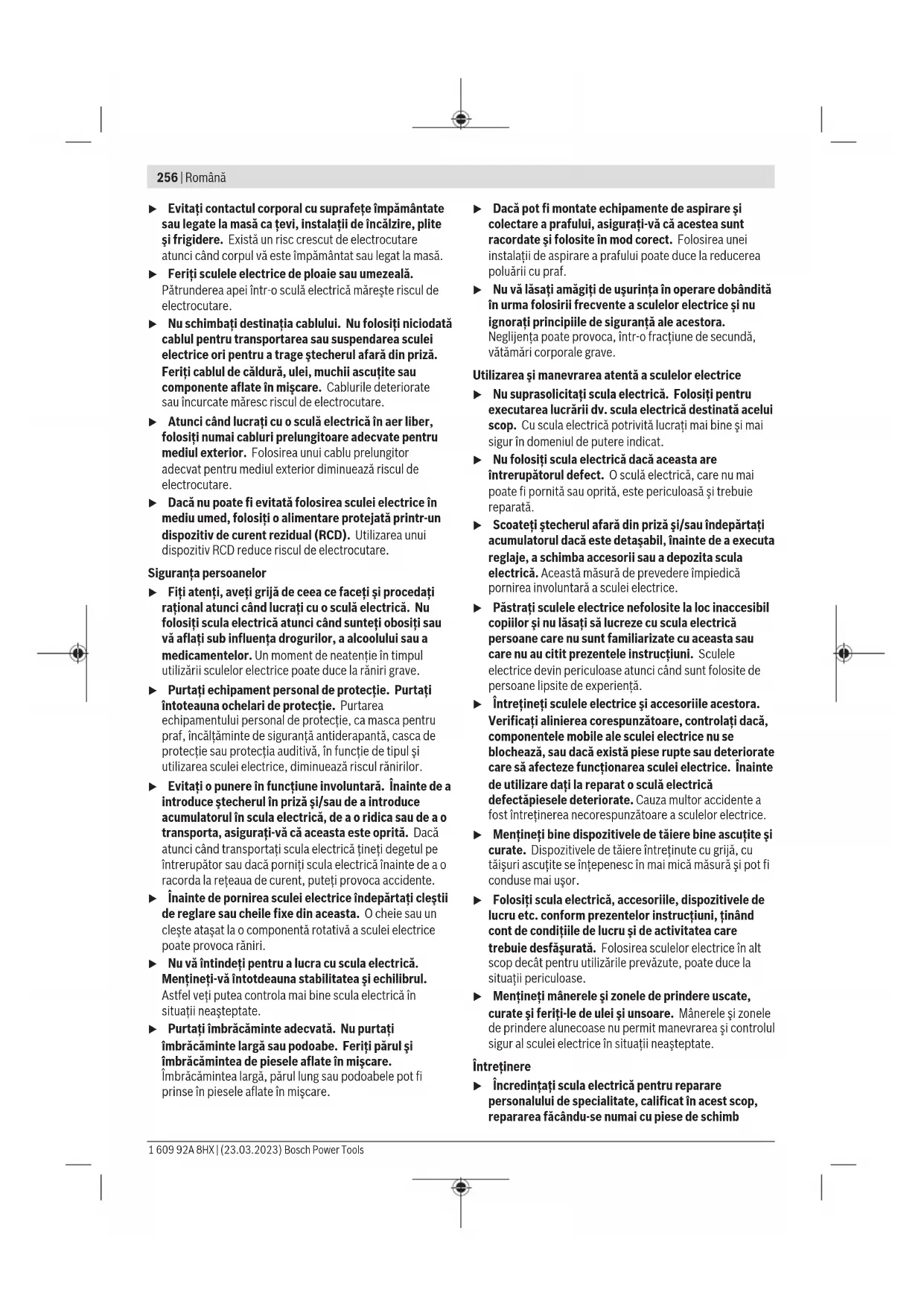 – электр құралына артық жүктеме түскеннен орын алған ақаулар. (Құралға артық жүктеме түсудің шартсыз белгілеріне мыналар жатады: құбылу түсінің пайда болуы немесе электр құралы бөліктері мен түйіндерінің деформациясы немесе қорытылуы, жоғары температура әсерінен электр қозғалтқышындағы сымдар оқшаулағышының қараюы немесе көмірленуі.) Кәдеге жарату Электр құралдар, жабдықтар және бумаларын айналаны қорғайтын кәдеге жаратуға апару қажет. Электр құралдарды үй қоқысына тастамаңыз! Тек қана ЕО елдері үшін: Электр және электрондық ескі құралдар бойынша Еуропа 2012/19/EU ережесі және ұлттық заңдарға сайкес пайдалануға жарамсыз электр құралдары бөлек жиналып, кәдеге жаратылуы қажет. Қате жолмен кәдеге жаратылған ескі электрлік және электрондық құрылғылар қауіпті заттардың болу мүмкіндігіне байланысты қоршаған ортаға және адам денсаулығына зиянды әсер тигізуі мүмкін. Română Instrucţiuni de siguranţă Indicaţii generale de avertizare pentru scule electrice AVERTIS- MENT Citiţi toate avertizările, instrucţiunile, ilustraţiile şi specificaţiile puse la dispoziţie împreună cu această sculă electrică. Nerespectarea instrucţiunilor menţionate mai jos poate duce la electrocutare, incendiu şi/sau vătămări corporale grave. Păstraţi toate indicaţiile de avertizare şi instrucţiunile în vederea utilizărilor viitoare. Termenul "sculă electrică" folosit în indicaţiile de avertizare se referă la sculele electrice alimentate de la reţea (cu cablu de alimentare) sau la sculele electrice cu acumulator (fără cablu de alimentare). Siguranţa la locul de muncă u Menţineţi‑vă sectorul de lucru curat şi bine iluminat. Dezordinea sau sectoarele de lucru neluminate pot duce la accidente. u Nu lucraţi cu sculele electrice în mediu cu pericol de explozie, în care există lichide, gaze sau pulberi inflamabile. Sculele electrice generează scântei care pot aprinde praful sau vaporii. u Nu permiteţi accesul copiilor şi al spectatorilor în timpul utilizării sculei electrice. Dacă vă este distrasă atenţia puteţi pierde controlul. Siguranţă electrică u Ştecherul sculei electrice trebuie să fie potrivit prizei electrice. Nu modificaţi niciodată ştecherul. Nu folosiţi fişe adaptoare la sculele electrice cu împământare (legate la masă). Ştecherele nemodificate şi prizele corespunzătoare diminuează riscul de electrocutare. Bosch Power Tools 1 609 92A 8HX | (23.03.2023)256 | Română u Evitaţi contactul corporal cu suprafeţe împământate sau legate la masă ca ţevi, instalaţii de încălzire, plite şi frigidere. Există un risc crescut de electrocutare atunci când corpul vă este împământat sau legat la masă. u Feriţi sculele electrice de ploaie sau umezeală. Pătrunderea apei într‑o sculă electrică măreşte riscul de electrocutare. u Nu schimbaţi destinaţia cablului. Nu folosiţi niciodată cablul pentru transportarea sau suspendarea sculei electrice ori pentru a trage ştecherul afară din priză. Feriţi cablul de căldură, ulei, muchii ascuţite sau componente aflate în mişcare. Cablurile deteriorate sau încurcate măresc riscul de electrocutare. u Atunci când lucraţi cu o sculă electrică în aer liber, folosiţi numai cabluri prelungitoare adecvate pentru mediul exterior. Folosirea unui cablu prelungitor adecvat pentru mediul exterior diminuează riscul de electrocutare. u Dacă nu poate fi evitată folosirea sculei electrice în mediu umed, folosiţi o alimentare protejată printr-un dispozitiv de curent rezidual (RCD). Utilizarea unui dispozitiv RCD reduce riscul de electrocutare. Siguranţa persoanelor u Fiţi atenţi, aveţi grijă de ceea ce faceţi şi procedaţi raţional atunci când lucraţi cu o sculă electrică. Nu folosiţi scula electrică atunci când sunteţi obosiţi sau vă aflaţi sub influenţa drogurilor, a alcoolului sau a medicamentelor. Un moment de neatenţie în timpul utilizării sculelor electrice poate duce la răniri grave. u Purtaţi echipament personal de protecţie. Purtaţi întoteauna ochelari de protecţie. Purtarea echipamentului personal de protecţie, ca masca pentru praf, încălţăminte de siguranţă antiderapantă, casca de protecţie sau protecţia auditivă, în funcţie de tipul şi utilizarea sculei electrice, diminuează riscul rănirilor. u Evitaţi o punere în funcţiune involuntară. Înainte de a introduce ştecherul în priză şi/sau de a introduce acumulatorul în scula electrică, de a o ridica sau de a o transporta, asiguraţi‑vă că aceasta este oprită. Dacă atunci când transportaţi scula electrică ţineţi degetul pe întrerupător sau dacă porniţi scula electrică înainte de a o racorda la reţeaua de curent, puteţi provoca accidente. u Înainte de pornirea sculei electrice îndepărtaţi cleştii de reglare sau cheile fixe din aceasta. O cheie sau un cleşte ataşat la o componentă rotativă a sculei electrice poate provoca răniri. u Nu vă întindeţi pentru a lucra cu scula electrică. Menţineţi-vă întotdeauna stabilitatea şi echilibrul. Astfel veţi putea controla mai bine scula electrică în situaţii neaşteptate. u Purtaţi îmbrăcăminte adecvată. Nu purtaţi îmbrăcăminte largă sau podoabe. Feriţi păru