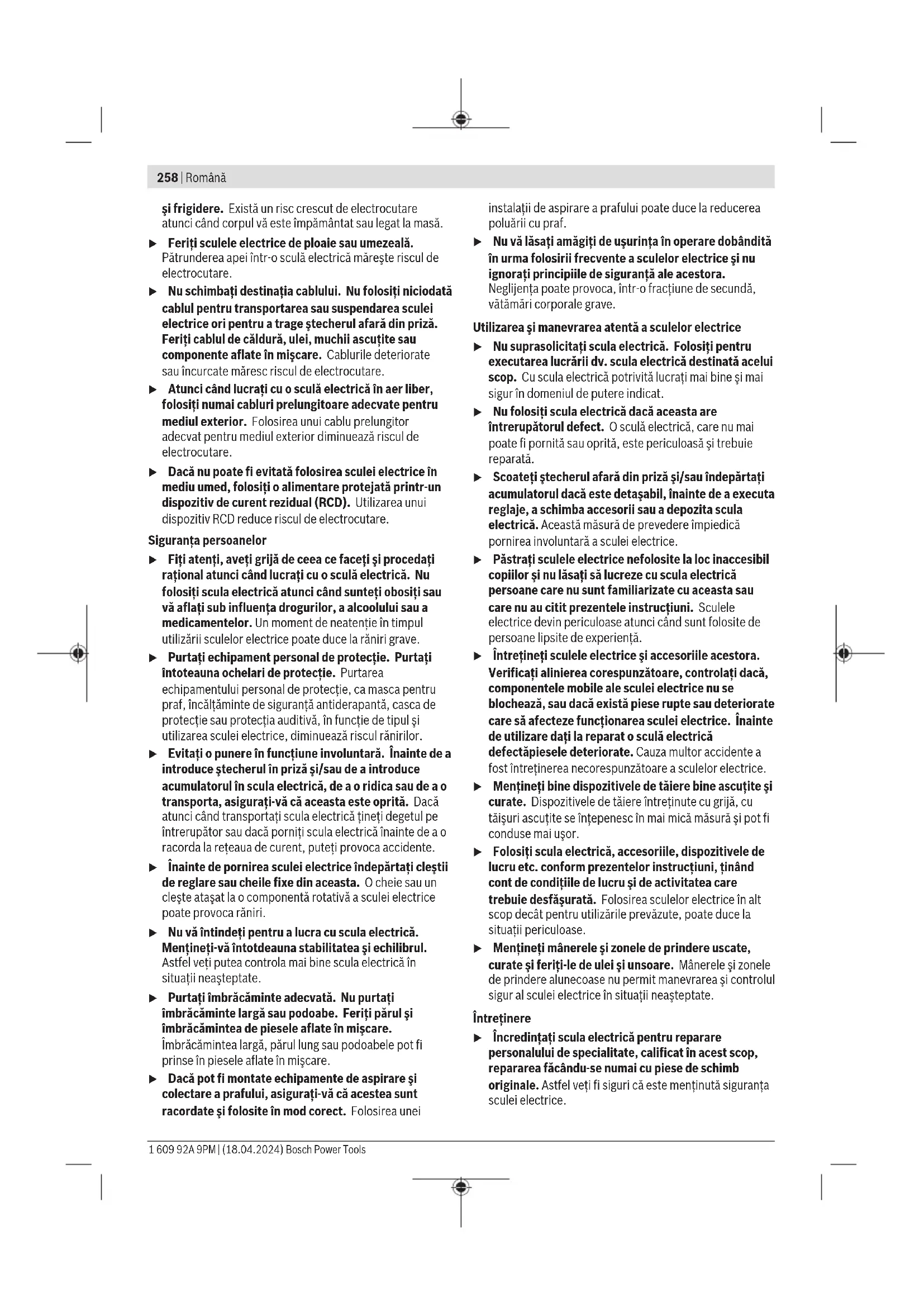 – электр құралына артық жүктеме түскеннен орын алған ақаулар. (Құралға артық жүктеме түсудің шартсыз белгілеріне мыналар жатады: құбылу түсінің пайда болуы немесе электр құралы бөліктері мен түйіндерінің деформациясы немесе қорытылуы, жоғары температура әсерінен электр қозғалтқышындағы сымдар оқшаулағышының қараюы немесе көмірленуі.) Кәдеге жарату Электр құралдар, жабдықтар және бумаларын айналаны қорғайтын кәдеге жаратуға апару қажет. Электр құралдарды үй қоқысына тастамаңыз! Тек қана ЕО елдері үшін: Әрі қарай пайдалануға жарамайтын электр құралдарын бөлек кәдеге жарату керек. Арнайы қоқыс жинау жүйелерін пайдаланыңыз. Қате жолмен кәдеге жаратылған ескі электрлік және электрондық құрылғылар қауіпті заттардың болу мүмкіндігіне байланысты қоршаған ортаға және адам денсаулығына зиянды әсер тигізуі мүмкін. Română Instrucţiuni de siguranţă Indicaţii generale de avertizare pentru scule electrice AVERTIS- MENT Citiţi toate avertizările, instrucţiunile, ilustraţiile şi specificaţiile puse la dispoziţie împreună cu această sculă electrică. Nerespectarea instrucţiunilor menţionate mai jos poate duce la electrocutare, incendiu şi/sau vătămări corporale grave. Păstraţi toate indicaţiile de avertizare şi instrucţiunile în vederea utilizărilor viitoare. Termenul "sculă electrică" folosit în indicaţiile de avertizare se referă la sculele electrice alimentate de la reţea (cu cablu de alimentare) sau la sculele electrice cu acumulator (fără cablu de alimentare). Siguranţa la locul de muncă u Menţineţi‑vă sectorul de lucru curat şi bine iluminat. Dezordinea sau sectoarele de lucru neluminate pot duce la accidente. u Nu lucraţi cu sculele electrice în mediu cu pericol de explozie, în care există lichide, gaze sau pulberi inflamabile. Sculele electrice generează scântei care pot aprinde praful sau vaporii. u Nu permiteţi accesul copiilor şi al spectatorilor în timpul utilizării sculei electrice. Dacă vă este distrasă atenţia puteţi pierde controlul. Siguranţă electrică u Ştecherul sculei electrice trebuie să fie potrivit prizei electrice. Nu modificaţi niciodată ştecherul. Nu folosiţi fişe adaptoare la sculele electrice cu împământare (legate la masă). Ştecherele nemodificate şi prizele corespunzătoare diminuează riscul de electrocutare. u Evitaţi contactul corporal cu suprafeţe împământate sau legate la masă ca ţevi, instalaţii de încălzire, plite Bosch Power Tools 1 609 92A 9PM | (18.04.2024)258 | Română şi frigidere. Există un risc crescut de electrocutare atunci când corpul vă este împământat sau legat la masă. u Feriţi sculele electrice de ploaie sau umezeală. Pătrunderea apei într‑o sculă electrică măreşte riscul de electrocutare. u Nu schimbaţi destinaţia cablului. Nu folosiţi niciodată cablul pentru transportarea sau suspendarea sculei electrice ori pentru a trage ştecherul afară din priză. Feriţi cablul de căldură, ulei, muchii ascuţite sau componente aflate în mişcare. Cablurile deteriorate sau încurcate măresc riscul de electrocutare. u Atunci când lucraţi cu o sculă electrică în aer liber, folosiţi numai cabluri prelungitoare adecvate pentru mediul exterior. Folosirea unui cablu prelungitor adecvat pentru mediul exterior diminuează riscul de electrocutare. u Dacă nu poate fi evitată folosirea sculei electrice în mediu umed, folosiţi o alimentare protejată printr-un dispozitiv de curent rezidual (RCD). Utilizarea unui dispozitiv RCD reduce riscul de electrocutare. Siguranţa persoanelor u Fiţi atenţi, aveţi grijă de ceea ce faceţi şi procedaţi raţional atunci când lucraţi cu o sculă electrică. Nu folosiţi scula electrică atunci când sunteţi obosiţi sau vă aflaţi sub influenţa drogurilor, a alcoolului sau a medicamentelor. Un moment de neatenţie în timpul utilizării sculelor electrice poate duce la răniri grave. u Purtaţi echipament personal de protecţie. Purtaţi întoteauna ochelari de protecţie. Purtarea echipamentului personal de protecţie, ca masca pentru praf, încălţăminte de siguranţă antiderapantă, casca de protecţie sau protecţia auditivă, în funcţie de tipul şi utilizarea sculei electrice, diminuează riscul rănirilor. u Evitaţi o punere în funcţiune involuntară. Înainte de a introduce ştecherul în priză şi/sau de a introduce acumulatorul în scula electrică, de a o ridica sau de a o transporta, asiguraţi‑vă că aceasta este oprită. Dacă atunci când transportaţi scula electrică ţineţi degetul pe întrerupător sau dacă porniţi scula electrică înainte de a o racorda la reţeaua de curent, puteţi provoca accidente. u Înainte de pornirea sculei electrice îndepărtaţi cleştii de reglare sau cheile fixe din aceasta. O cheie sau un cleşte ataşat la o componentă rotativă a sculei electrice poate provoca răniri. u Nu vă întindeţi pentru a lucra cu scula electrică. Menţineţi-vă întotdeauna stabilitatea şi echilibrul. Astfel veţi putea controla mai bine scula electrică în situaţii neaşteptate. u Purtaţi îmbrăcăminte adecvată. Nu purtaţi îmbrăcăminte largă sau podoabe. Feriţi părul şi îmbrăcămintea de piesele aflate în mişcare. Îmbrăcămintea largă, părul lung sau