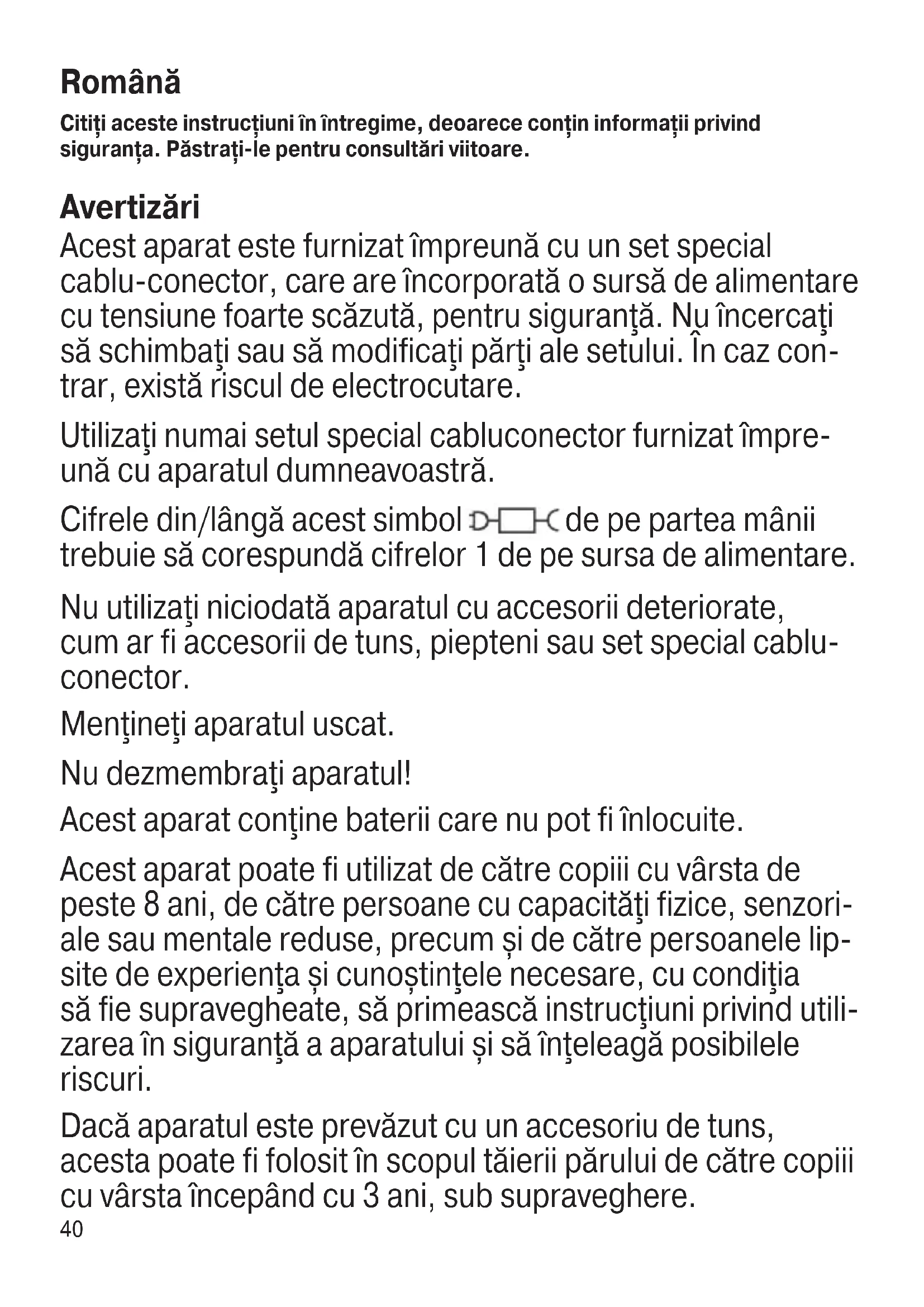 Unvan: Adres: Tel, Faks: e-posta: Kaşe ve İmza: Fatura Tarihi ve Sayısı: Teslim Yeri ve Tarihi: İthalatçı Firma: Procter & Gamble Tüketim Malları Sanayi A.Ş. Nida Kule – Kuzey, Barbaros Mahallesi Begonya Sokak No:3 34746 Ataşehir, İstanbul tarafından ithal edilmiştir. P&G Tüketici İlişkileri: 08502200911 www.pg.com.tr Braun Servis İstasyonları listemize internet sitemizden veya Tüketici Hizmetleri merkezimizi araya- rak ulaşabilirsiniz. www.braun.com/tr 90340910_Type5516_BT3421_3420_3411_3410_3400x_CEEMEA.indd 3990340910_Type5516_BT3421_3420_3411_3410_3400x_CEEMEA.indd 39 20.07.22 10:0320.07.22 10:0340 Română Citiți aceste instrucțiuni în întregime, deoarece conțin informații privind siguranța. Păstrați-le pentru consultări viitoare. Avertizări Acest aparat este furnizat împreună cu un set special cablu-conector, care are încorporată o sursă de alimentare cu tensiune foarte scăzută, pentru siguranţă. Nu încercaţi să schimbaţi sau să modificaţi părţi ale setului. În caz con- trar, există riscul de electrocutare. Utilizaţi numai setul special cabluconector furnizat împre- ună cu aparatul dumneavoastră. Cifrele din/lângă acest simbol de pe partea mânii trebuie să corespundă cifrelor 1 de pe sursa de alimentare. Nu utilizaţi niciodată aparatul cu accesorii deteriorate, cum ar fi accesorii de tuns, piepteni sau set special cablu- conector. Menţineţi aparatul uscat. Nu dezmembraţi aparatul! Acest aparat conţine baterii care nu pot fi înlocuite. Acest aparat poate fi utilizat de către copiii cu vârsta de peste 8 ani, de către persoane cu capacităţi fizice, senzori- ale sau mentale reduse, precum și de către persoanele lip- site de experienţa și cunoștinţele necesare, cu condiţia să fie supravegheate, să primească instrucţiuni privind utili- zarea în siguranţă a aparatului și să înţeleagă posibilele riscuri. Dacă aparatul este prevăzut cu un accesoriu de tuns, acesta poate fi folosit în scopul tăierii părului de către copiii cu vârsta începând cu 3 ani, sub supraveghere. 90340910_Type5516_BT3421_3420_3411_3410_3400x_CEEMEA.indd 4090340910_Type5516_BT3421_3420_3411_3410_3400x_CEEMEA.indd 40 20.07.22 10:0320.07.22 10:0341 Copiii nu trebuie să se joace cu acest aparat. Curăţarea și întreţinerea nu se vor efectua de către copii. Numai pentru uz casnic. Atenție Când încărcaţi aparatul, asiguraţi-vă că acesta este oprit. Important Temperatura ambientală recomandată pentru încărcare este cuprinsă între 5 °C și 35 °C. În condiţii de temperatură foarte scăzută sau foarte ridicată, este posibil ca bateria să nu se încarce corespunzător sau chiar să nu se încarce deloc. Temperatura ambientală reco- mandată pentru tuns este cuprinsă între 15 °C și 35 °C. Nu expuneţi aparatul la temperaturi mai mari de 50 °C pentru perioade lungi de timp. Pentru a vă asigura că accesoriile funcţionează corespunzător, ungeţi în mod regulat aparatul de tuns și sitele cu ulei de mecanisme fine (nu este inclus). Descriere 1a Cap aparat de tuns*/** 1b Cap aparat de tuns pentru conturare*/** 1c Mini cap de ras cu lamă* 2 Selector lungime 3 Buton pornire/oprire 4 Priză de alimentare 5 Încărcător** 6 Indicator de încărcare 7 Pieptene de precizie pentru barbă (0,5-10 mm)*/** 8 Pieptene de precizie pentru păr (10,5-20 mm)*/**