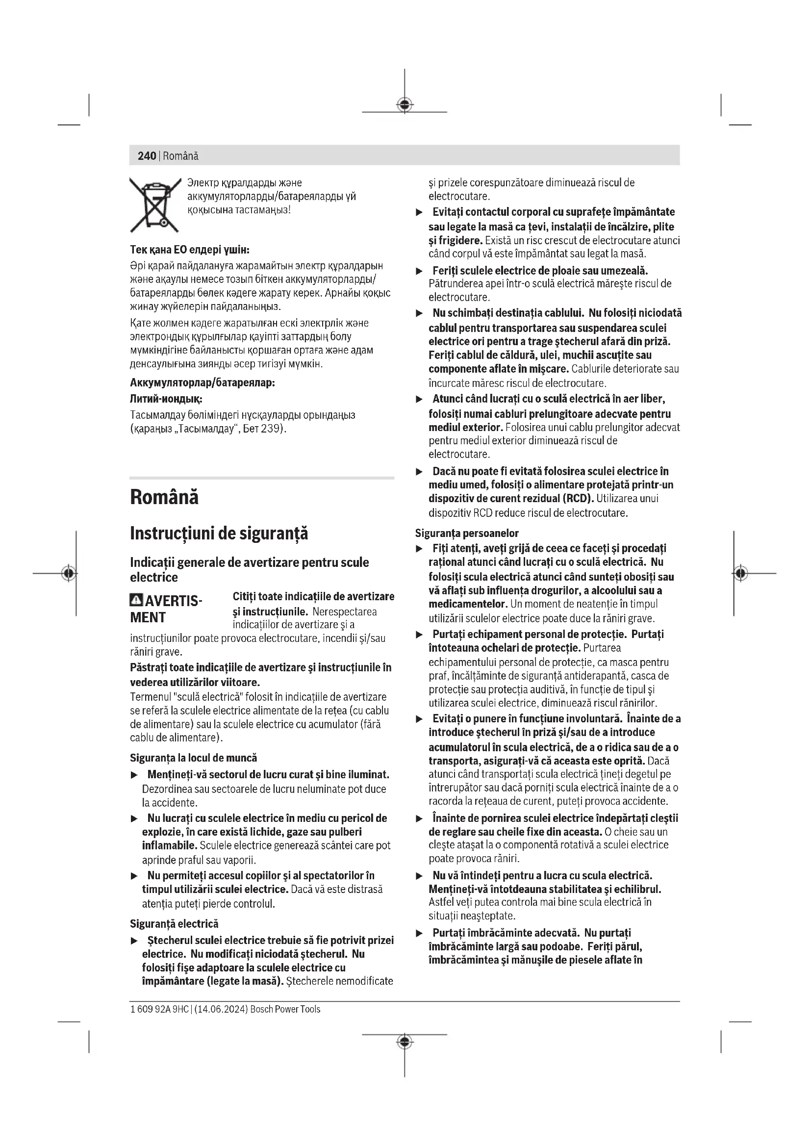 Ұсынылған литий-иондық аккумуляторлар қауіпті тауарларға қойылатын талаптарға бағынады. Пайдаланушы аккумуляторларды көшеде қосымша құжаттарсыз тасымалдай алады. Үшінші тараптар (мысалы, әуе немесе жүк тасымалдау компаниясы) орауышқа және таңбаламаға қойылатын арнайы талаптарды сақтауы керек. Жіберілетін жүкті дайындау кезінде қауіпті жүктерді тасымалдау сарапшыларымен хабарласу керек. Аккумуляторды корпусы зақымдалған болса ғана жіберіңіз. Ашық түйіспелерді желімдеңіз және аккумуляторды орамада қозғалмайтындай ораңыз. Қажет болса, қосымша ұлттық ережелерді сақтаңыз. Кәдеге жарату Электр құралдарды, аккумуляторларды, керек-жарақтарды және орау материалдарын экологиялық тұрғыдан дұрыс утилизациялауға тапсыру керек. Bosch Power Tools 1 609 92A 9HC | (14.06.2024)240 | Română Электр құралдарды және аккумуляторларды/батареяларды үй қоқысына тастамаңыз! Тек қана ЕО елдері үшін: Әрі қарай пайдалануға жарамайтын электр құралдарын және ақаулы немесе тозып біткен аккумуляторларды/ батареяларды бөлек кәдеге жарату керек. Арнайы қоқыс жинау жүйелерін пайдаланыңыз. Қате жолмен кәдеге жаратылған ескі электрлік және электрондық құрылғылар қауіпті заттардың болу мүмкіндігіне байланысты қоршаған ортаға және адам денсаулығына зиянды әсер тигізуі мүмкін. Аккумуляторлар/батареялар: Литий-иондық: Тасымалдау бөліміндегі нұсқауларды орындаңыз (қараңыз „Тасымалдау“, Бет239). Română Instrucţiuni de siguranţă Indicaţii generale de avertizare pentru scule electrice AVERTIS- MENT Citiţi toate indicaţiile de avertizare şi instrucţiunile. Nerespectarea indicaţiilor de avertizare şi a instrucţiunilor poate provoca electrocutare, incendii şi/sau răniri grave. Păstraţi toate indicaţiile de avertizare şi instrucţiunile în vederea utilizărilor viitoare. Termenul "sculă electrică" folosit în indicaţiile de avertizare se referă la sculele electrice alimentate de la reţea (cu cablu de alimentare) sau la sculele electrice cu acumulator (fără cablu de alimentare). Siguranţa la locul de muncă u Menţineţi‑vă sectorul de lucru curat şi bine iluminat. Dezordinea sau sectoarele de lucru neluminate pot duce la accidente. u Nu lucraţi cu sculele electrice în mediu cu pericol de explozie, în care există lichide, gaze sau pulberi inflamabile. Sculele electrice generează scântei care pot aprinde praful sau vaporii. u Nu permiteţi accesul copiilor şi al spectatorilor în timpul utilizării sculei electrice. Dacă vă este distrasă atenţia puteţi pierde controlul. Siguranţă electrică u Ştecherul sculei electrice trebuie să fie potrivit prizei electrice. Nu modificaţi niciodată ştecherul. Nu folosiţi fişe adaptoare la sculele electrice cu împământare (legate la masă). Ştecherele nemodificate şi prizele corespunzătoare diminuează riscul de electrocutare. u Evitaţi contactul corporal cu suprafeţe împământate sau legate la masă ca ţevi, instalaţii de încălzire, plite şi frigidere. Există un risc crescut de electrocutare atunci când corpul vă este împământat sau legat la masă. u Feriţi sculele electrice de ploaie sau umezeală. Pătrunderea apei într‑o sculă electrică măreşte riscul de electrocutare. u Nu schimbaţi destinaţia cablului. Nu folosiţi niciodată cablul pentru transportarea sau suspendarea sculei electrice ori pentru a trage ştecherul afară din priză. Feriţi cablul de căldură, ulei, muchii ascuţite sau componente aflate în mişcare. Cablurile deteriorate sau încurcate măresc riscul de electrocutare. u Atunci când lucraţi cu o sculă electrică în aer liber, folosiţi numai cabluri prelungitoare adecvate pentru mediul exterior. Folosirea unui cablu prelungitor adecvat pentru mediul exterior diminuează riscul de electrocutare. u Dacă nu poate fi evitată folosirea sculei electrice în mediu umed, folosiţi o alimentare protejată printr-un dispozitiv de curent rezidual (RCD). Utilizarea unui dispozitiv RCD reduce riscul de electrocutare. Siguranţa persoanelor u Fiţi atenţi, aveţi grijă de ceea ce faceţi şi procedaţi raţional atunci când lucraţi cu o sculă electrică. Nu folosiţi scula electrică atunci când sunteţi obosiţi sau vă aflaţi sub influenţa drogurilor, a alcoolului sau a medicamentelor. Un moment de neatenţie în timpul utilizării sculelor electrice poate duce la răniri grave. u Purtaţi echipament personal de protecţie. Purtaţi întoteauna ochelari de protecţie. Purtarea echipamentului personal de protecţie, ca masca pentru praf, încălţăminte de siguranţă antiderapantă, casca de protecţie sau protecţia auditivă, în funcţie de tipul şi utilizarea sculei electrice, diminuează riscul rănirilor. u Evitaţi o punere în funcţiune involuntară. Înainte de a introduce ştecherul în priză şi/sau de a introduce acumulatorul în scula electrică, de a o ridi