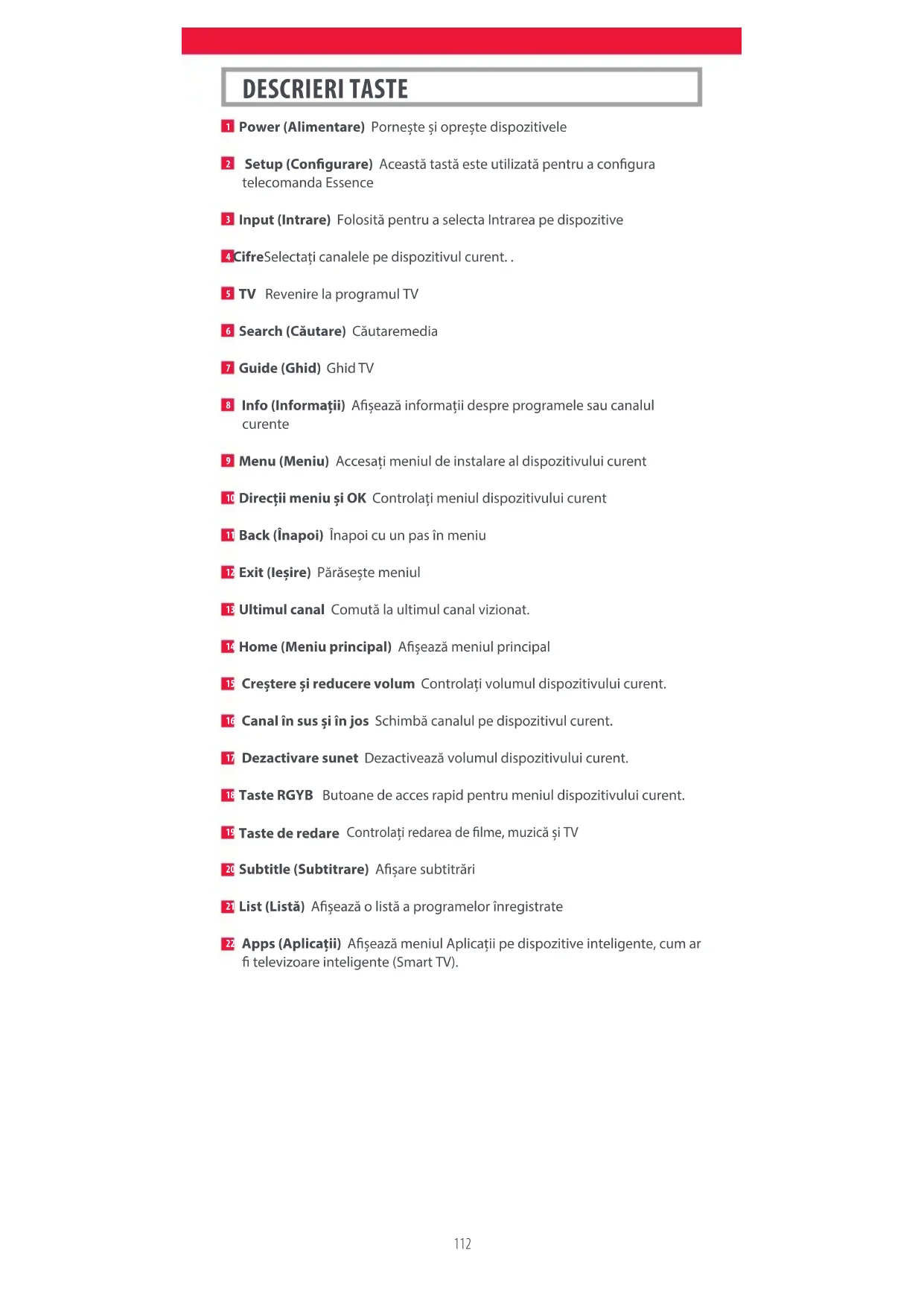 Setup (Congurare) Această tastă este utilizată pentru a congura telecomanda Essence