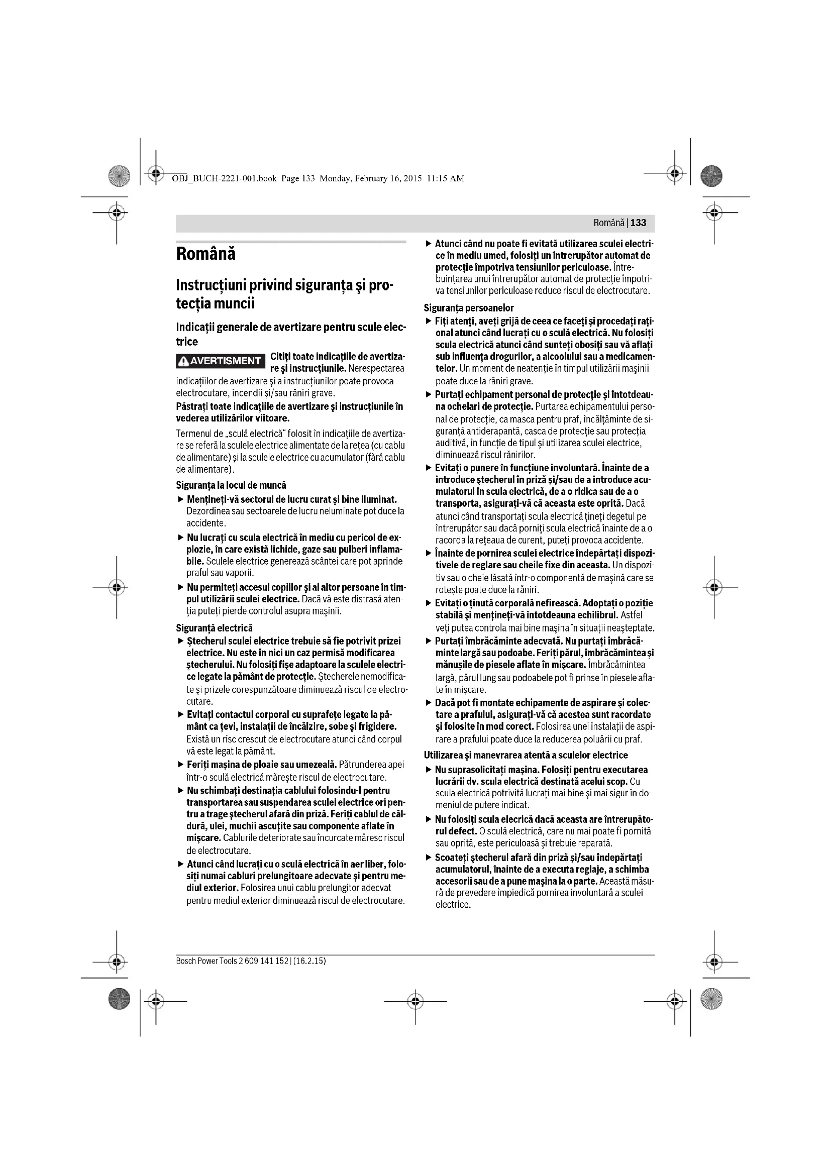 Бұл литий-иондық аккумуляторлар қауіпті тауарларға қойылатын талаптарға сай болуы керек. Пайдаланушы аккумуляторларды көшеде қосымша құжаттарсыз тасымалдай алады. Үшінші тұлғалар (мысалы, әуе көлігі немесе жіберу) орамаға және маркаларға қойылатын арнайы талаптарды сақтау керек. Жіберуге дайындау кезінде қауіпті жүктер маманына хабарласу керек. Аккумуляторды корпусы зақымдалған болса ғана жіберіңіз. Ашық түйіспелерді желімдеңіз және аккумуляторды орамада қозғалмайтындай ораңыз. Қажет болса, қосымша ұлттық ережелерді сақтаңыз. Кәдеге жарату Электр құралдарды, аккумуляторларды, керек- жарақтарды және орау материалдарын экологиялық тұрғыдан дұрыс утилизациялауға тапсыру керек. Электр құралдарды және аккумуляторларды/бата- реяларды үй қоқысына тастамаңыз! Тек қана ЕО елдері үшін: Электр және электрондық ескі құралдар бойынша 2012/19/EU директивасына және 2006/66/EC нормасына сай жарамсыз электр құралдарды, ақаулы немесе пайдаланылған аккумуляторларды/батареяларды бөлек жинау керек және экологиялық тұрғыдан дұрыс утилизациялауға тапсыру керек. Аккумуляторлар/батареялар: Литий-иондық: „Тасымалдау“ тарауындағы, 132 бетіндегі нұсқауларды орындаңыз. Техникалық өзгерістер енгізу құқығы сақталады. OBJ_BUCH-2221-001.book Page 132 Monday, February 16, 2015 11:15 AMRomână | 133 Bosch Power Tools 2 609 141 152 | (16.2.15) Română Instrucţiuni privind siguranţa şi pro- tecţia muncii Indicaţii generale de avertizare pentru scule elec- trice Citiţi toate indicaţiile de avertiza- re şi instrucţiunile. Nerespectarea indicaţiilor de avertizare şi a instrucţiunilor poate provoca electrocutare, incendii şi/sau răniri grave. Păstraţi toate indicaţiile de avertizare şi instrucţiunile în vederea utilizărilor viitoare. Termenul de „sculă electrică“ folosit în indicaţiile de avertiza- re se referă la sculele electrice alimentate de la reţea (cu cablu de alimentare) şi la sculele electrice cu acumulator (fără cablu de alimentare). Siguranţa la locul de muncă Menţineţi-vă sectorul de lucru curat şi bine iluminat. Dezordinea sau sectoarele de lucru neluminate pot duce la accidente. Nu lucraţi cu scula electrică în mediu cu pericol de ex- plozie, în care există lichide, gaze sau pulberi inflama- bile. Sculele electrice generează scântei care pot aprinde praful sau vaporii. Nu permiteţi accesul copiilor şi al altor persoane în tim- pul utilizării sculei electrice. Dacă vă este distrasă aten- ţia puteţi pierde controlul asupra maşinii. Siguranţă electrică Ştecherul sculei electrice trebuie să fie potrivit prizei electrice. Nu este în nici un caz permisă modificarea ştecherului. Nu folosiţi fişe adaptoare la sculele electri- ce legate la pământ de protecţie. Ştecherele nemodifica- te şi prizele corespunzătoare diminuează riscul de electro- cutare. Evitaţi contactul corporal cu suprafe ţe legate la pă- mânt ca ţevi, instalaţii de încălzire, sobe şi frigidere. Există un risc crescut de electrocutare atunci când corpul vă este legat la pământ. Feriţi maşina de ploaie sau umezeală. Pătrunderea apei într-o sculă electrică măreşte riscul de electrocutare. Nu schimbaţi destinaţia cablului folosindu-l pentru transportarea sau suspendarea sculei electrice ori pen- tru a trage ştecherul afară din priză. Feriţi cablul de căl- dură, ulei, muchii ascuţite sau componente aflate în mişcare. Cablurile deteriorate sau încurcate măresc riscul de electrocutare. Atunci când lucraţi cu o sculă electrică în aer liber, folo- siţi numai cabluri prelungitoare adecvate şi pentru me- diul exterior. Folosirea unui cablu prelungitor adecvat pentru mediul exterior diminuează riscul de electrocutare. Atunci când nu poate fi evitată utilizarea sculei electri- ce în mediu umed, folosiţi un întrerupător automat de protecţie împotriva tensiunilor periculoase. Între- buinţarea unui întrerupător automat de protecţie împotri- va tensiunilor periculoase reduce riscul de electrocutare. Siguranţa persoanelor Fiţi atenţi, aveţi grijă de ceea ce faceţi şi procedaţi raţi- onal atunci când lucra ţi cu o sculă electrică. Nu folosiţi scula electrică atunci când sunteţi obosiţi sau vă aflaţi sub influenţa drogurilor, a alcoolului sau a medicamen- telor. Un moment de neatenţie în timpul utilizării maşinii poate duce la răniri grave. Purtaţi echipament personal de protecţie şi întotdeau- na ochelari de protecţie. Purtarea echipamentului perso- nal de protecţie, ca masca pentru praf, încălţăminte de si- guranţă antiderapantă, casca de protecţie sau protecţia auditivă, în funcţie de tipul şi utilizarea sculei electrice, diminuează riscul rănirilor. Evitaţi o punere în funcţiune involuntară. Înainte de a introduce ştecherul în priză şi/sau de a introduce acu- mulatorul în scula electrică, de a o ridica sau de a o transporta, asiguraţi-vă că aceasta este oprită. Dacă atunci c
