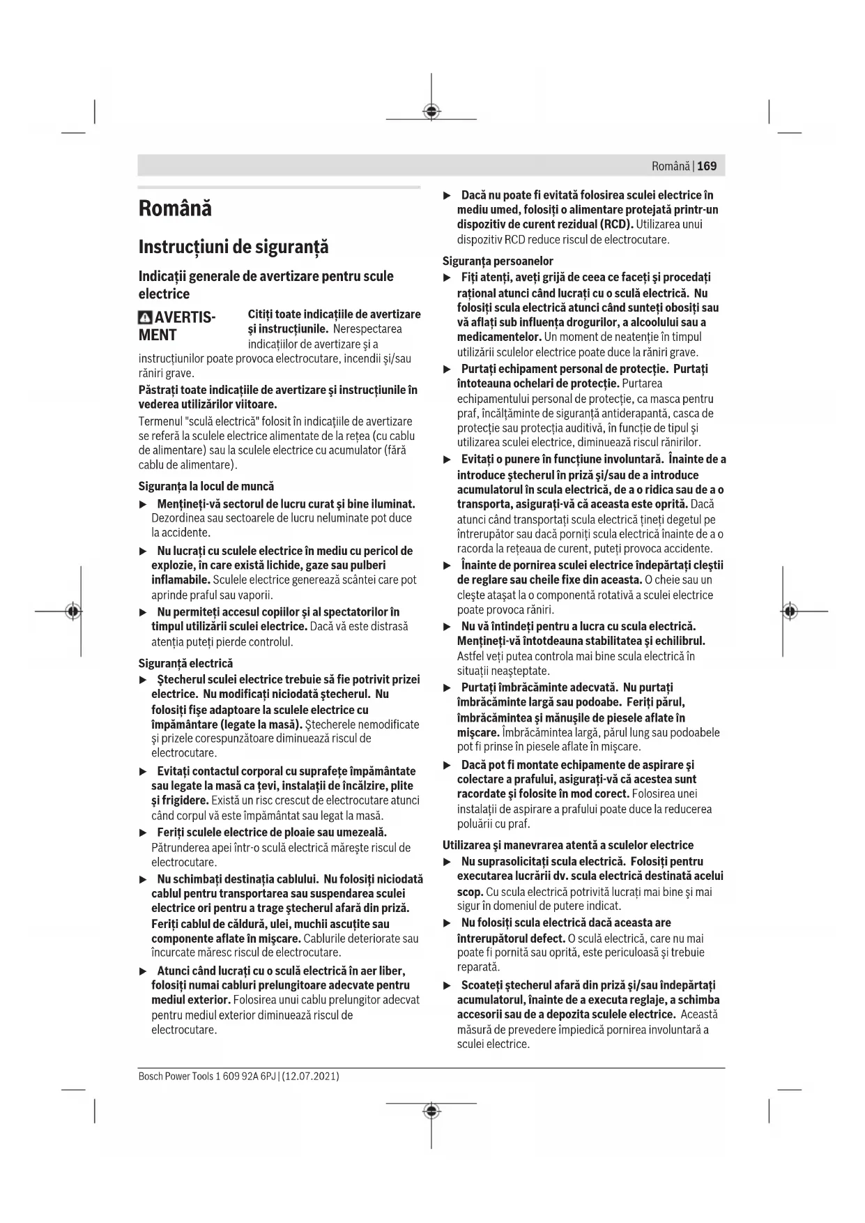 Бұл литий-иондық аккумуляторлар қауіпті тауарларға қойылатын талаптарға сай болуы керек. Пайдаланушы аккумуляторларды көшеде қосымша құжаттарсыз тасымалдай алады. Үшінші тұлғалар (мысалы, әуе көлігі немесе жіберу) орамаға және маркаларға қойылатын арнайы талаптарды сақтау керек. Жіберуге дайындау кезінде қауіпті жүктерді тасымалдау маманымен хабарласу керек. Аккумуляторды корпусы зақымдалған болса ғана жіберіңіз. Ашық түйіспелерді желімдеңіз және аккумуляторды орамада қозғалмайтындай ораңыз. Қажет болса, қосымша ұлттық ережелерді сақтаңыз. Кәдеге жарату Электр құралдарды, аккумуляторларды, керек-жарақтарды және орау материалдарын экологиялық тұрғыдан дұрыс утилизациялауға тапсыру керек. Электр құралдарды және аккумуляторларды/батареяларды үй қоқысына тастамаңыз! Тек қана ЕО елдері үшін: Еуропа 2012/19/EU ережесі бойынша жарамсыз электр құралдары және Еуропа 2006/66/EC ережесі бойынша зақымдалған немесе ескі аккумулятор/батареялар бөлек жиналып кәдеге жаратылуы қажет. Аккумуляторлар/батареялар: Литий-иондық: Тасымалдау бөліміндегі нұсқауларды орындаңыз (қараңыз „Тасымалдау“, Бет168). 1 609 92A 6PJ | (12.07.2021) Bosch Power ToolsRomână | 169 Română Instrucţiuni de siguranţă Indicaţii generale de avertizare pentru scule electrice AVERTIS- MENT Citiţi toate indicaţiile de avertizare şi instrucţiunile. Nerespectarea indicaţiilor de avertizare şi a instrucţiunilor poate provoca electrocutare, incendii şi/sau răniri grave. Păstraţi toate indicaţiile de avertizare şi instrucţiunile în vederea utilizărilor viitoare. Termenul "sculă electrică" folosit în indicaţiile de avertizare se referă la sculele electrice alimentate de la reţea (cu cablu de alimentare) sau la sculele electrice cu acumulator (fără cablu de alimentare). Siguranţa la locul de muncă u Menţineţi‑vă sectorul de lucru curat şi bine iluminat. Dezordinea sau sectoarele de lucru neluminate pot duce la accidente. u Nu lucraţi cu sculele electrice în mediu cu pericol de explozie, în care există lichide, gaze sau pulberi inflamabile. Sculele electrice generează scântei care pot aprinde praful sau vaporii. u Nu permiteţi accesul copiilor şi al spectatorilor în timpul utilizării sculei electrice. Dacă vă este distrasă atenţia puteţi pierde controlul. Siguranţă electrică u Ştecherul sculei electrice trebuie să fie potrivit prizei electrice. Nu modificaţi niciodată ştecherul. Nu folosiţi fişe adaptoare la sculele electrice cu împământare (legate la masă). Ştecherele nemodificate şi prizele corespunzătoare diminuează riscul de electrocutare. u Evitaţi contactul corporal cu suprafeţe împământate sau legate la masă ca ţevi, instalaţii de încălzire, plite şi frigidere. Există un risc crescut de electrocutare atunci când corpul vă este împământat sau legat la masă. u Feriţi sculele electrice de ploaie sau umezeală. Pătrunderea apei într‑o sculă electrică măreşte riscul de electrocutare. u Nu schimbaţi destinaţia cablului. Nu folosiţi niciodată cablul pentru transportarea sau suspendarea sculei electrice ori pentru a trage ştecherul afară din priză. Feriţi cablul de căldură, ulei, muchii ascuţite sau componente aflate în mişcare. Cablurile deteriorate sau încurcate măresc riscul de electrocutare. u Atunci când lucraţi cu o sculă electrică în aer liber, folosiţi numai cabluri prelungitoare adecvate pentru mediul exterior. Folosirea unui cablu prelungitor adecvat pentru mediul exterior diminuează riscul de electrocutare. u Dacă nu poate fi evitată folosirea sculei electrice în mediu umed, folosiţi o alimentare protejată printr-un dispozitiv de curent rezidual (RCD). Utilizarea unui dispozitiv RCD reduce riscul de electrocutare. Siguranţa persoanelor u Fiţi atenţi, aveţi grijă de ceea ce faceţi şi procedaţi raţional atunci când lucraţi cu o sculă electrică. Nu folosiţi scula electrică atunci când sunteţi obosiţi sau vă aflaţi sub influenţa drogurilor, a alcoolului sau a medicamentelor. Un moment de neatenţie în timpul utilizării sculelor electrice poate duce la răniri grave. u Purtaţi echipament personal de protecţie. Purtaţi întoteauna ochelari de protecţie. Purtarea echipamentului personal de protecţie, ca masca pentru praf, încălţăminte de siguranţă antiderapantă, casca de protecţie sau protecţia auditivă, în funcţie de tipul şi utilizarea sculei electrice, diminuează riscul rănirilor. u Evitaţi o punere în funcţiune involuntară. Înainte de a introduce ştecherul în priză şi/sau de a introduce acumulatorul în scula electrică, de a o ridica sau de a o transporta, asiguraţi‑vă că aceasta este oprită. Dacă atunci când transportaţi scula electrică ţineţi degetul pe întrerupător sau dacă porniţi scula electrică înainte de a o racorda la reţeaua de curent, puteţi provoca accidente. u Înainte de pornirea sculei electrice îndepărtaţi cleştii de reglare sau cheile fixe din aceasta. O cheie sau un cleşte ataşat la o componentă rotativ