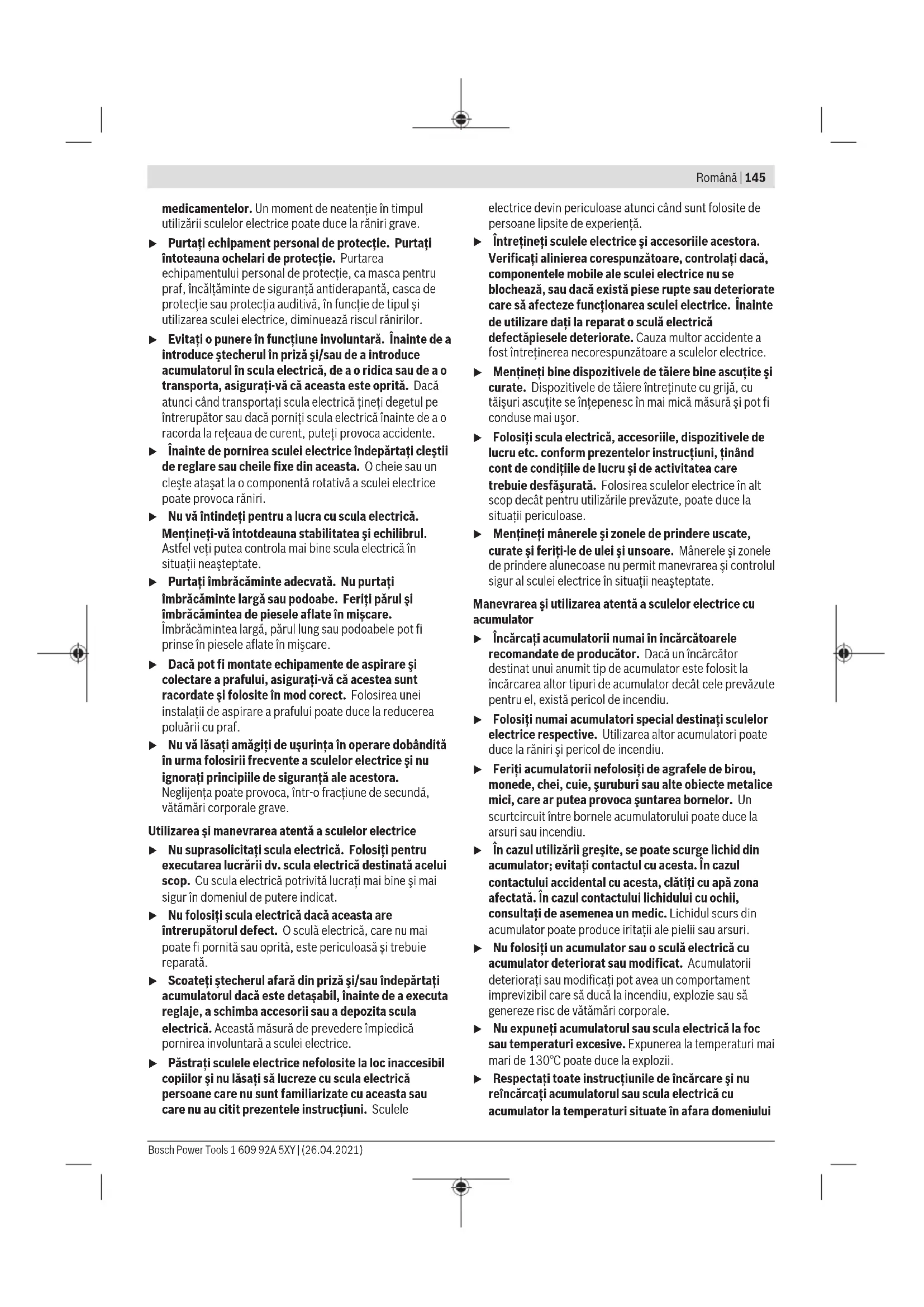 Өнімдерді сату процесінің аясында төмендегі қауіпсіздік талаптары орындалуы тиіс: – Сатушы сатып алушыға ұйымының фирмалық атауы, орналасқан жері (мекенжайы) және жұмыс режимі туралы мәліметтер беруге міндетті; – Сауда бөлмелеріндегі өнімдердің сынамалары сатып алушыға бұйымдардағы жазбалармен танысуға мүмкіндік беруі және визуалды тексерістен басқа бұйымдардың іске қосылуына әкелетін, сатып алушылар өз бетінше орындайтын ешқандай әрекеттерге жол бермеуі тиіс; – Сатушы осы бұйымдардың белгіленген талаптарға сәйкестігінің растамасы, сертификаттардың немесе сәйкестік жөніндегі мәлімдемелердің бар болуы туралы ақпаратты сатып алушыға беруге міндетті; – Идентификациялық сипаттары жоқ (жоғалған), жарамдылық мерзімі өтіп кеткен, бұзылу белгілері бар және пайдалану бойынша нұсқаулығы (кітапшасы), міндетті сәйкестік сертификаты немесе сәйкестік белгісі жоқ өнімдерді сатуға тыйым салынады. Română Instrucţiuni de siguranţă Instrucţiuni generale de siguranţă pentru scule electrice AVERTIS- MENT Citiţi toate avertizările, instrucţiunile, ilustraţiile şi specificaţiile puse la dispoziţie împreună cu această sculă electrică. Nerespectarea instrucţiunilor menţionate mai jos poate duce la electrocutare, incendiu şi/sau vătămări corporale grave. Păstraţi toate indicaţiile de avertizare şi instrucţiunile în vederea utilizărilor viitoare. Termenul "sculă electrică" folosit în indicaţiile de avertizare se referă la sculele electrice alimentate de la reţea (cu cablu de alimentare) sau la sculele electrice cu acumulator (fără cablu de alimentare). Siguranţa la locul de muncă u Menţineţi‑vă sectorul de lucru curat şi bine iluminat. Dezordinea sau sectoarele de lucru neluminate pot duce la accidente. u Nu lucraţi cu sculele electrice în mediu cu pericol de explozie, în care există lichide, gaze sau pulberi inflamabile. Sculele electrice generează scântei care pot aprinde praful sau vaporii. u Nu permiteţi accesul copiilor şi al spectatorilor în timpul utilizării sculei electrice. Dacă vă este distrasă atenţia puteţi pierde controlul. Siguranţă electrică u Ştecherul sculei electrice trebuie să fie potrivit prizei electrice. Nu modificaţi niciodată ştecherul. Nu folosiţi fişe adaptoare la sculele electrice cu împământare (legate la masă). Ştecherele nemodificate şi prizele corespunzătoare diminuează riscul de electrocutare. u Evitaţi contactul corporal cu suprafeţe împământate sau legate la masă ca ţevi, instalaţii de încălzire, plite şi frigidere. Există un risc crescut de electrocutare atunci când corpul vă este împământat sau legat la masă. u Feriţi sculele electrice de ploaie sau umezeală. Pătrunderea apei într‑o sculă electrică măreşte riscul de electrocutare. u Nu schimbaţi destinaţia cablului. Nu folosiţi niciodată cablul pentru transportarea sau suspendarea sculei electrice ori pentru a trage ştecherul afară din priză. Feriţi cablul de căldură, ulei, muchii ascuţite sau componente aflate în mişcare. Cablurile deteriorate sau încurcate măresc riscul de electrocutare. u Atunci când lucraţi cu o sculă electrică în aer liber, folosiţi numai cabluri prelungitoare adecvate pentru mediul exterior. Folosirea unui cablu prelungitor adecvat pentru mediul exterior diminuează riscul de electrocutare. u Dacă nu poate fi evitată folosirea sculei electrice în mediu umed, folosiţi o alimentare protejată printr-un dispozitiv de curent rezidual (RCD). Utilizarea unui dispozitiv RCD reduce riscul de electrocutare. Siguranţa persoanelor u Fiţi atenţi, aveţi grijă de ceea ce faceţi şi procedaţi raţional atunci când lucraţi cu o sculă electrică. Nu folosiţi scula electrică atunci când sunteţi obosiţi sau vă aflaţi sub influenţa drogurilor, a alcoolului sau a 1 609 92A 5XY | (26.04.2021) Bosch Power ToolsRomână | 145 medicamentelor. Un moment de neatenţie în timpul utilizării sculelor electrice poate duce la răniri grave. u Purtaţi echipament personal de protecţie. Purtaţi întoteauna ochelari de protecţie. Purtarea echipamentului personal de protecţie, ca masca pentru praf, încălţăminte de siguranţă antiderapantă, casca de protecţie sau protecţia auditivă, în funcţie de tipul şi utilizarea sculei electrice, diminuează riscul rănirilor. u Evitaţi o punere în funcţiune involuntară. Înainte de a introduce ştecherul în priză şi/sau de a introduce acumulatorul în scula electrică, de a o ridica sau de a o transporta, asiguraţi‑vă că aceasta este oprită. Dacă atunci când transportaţi scula electrică ţineţi degetul pe întrerupător sau dacă porniţi scula electrică înainte de a o racorda la reţeaua de curent, puteţi provoca accidente. u Înainte de pornirea sculei electrice îndepărtaţi cleştii de reglare sau cheile fixe din aceasta. O cheie sau un cleşte ataşat la o componentă rotativă a sculei electrice poate provoca răniri. u Nu vă întindeţi pentru a lucra cu scula electrică. Menţineţi-vă întotdeauna stabilitatea şi echilibrul. Astfel veţi putea controla mai bine scula electrică în situaţii neaşteptate. u Purtaţi îmbrăcăminte adecvată.