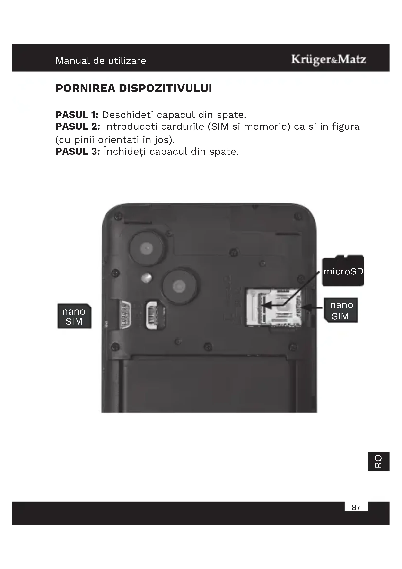 PORNIREA DISPOZITIVULUI PASUL 1: Deschideti capacul din spate. PASUL 2: Introduceti cardurile (SIM si memorie) ca si in gura (cu pinii orientati in jos). PASUL 3: Închideți capacul din spate. microSD nano SIM nano SIMManual de utilizare
