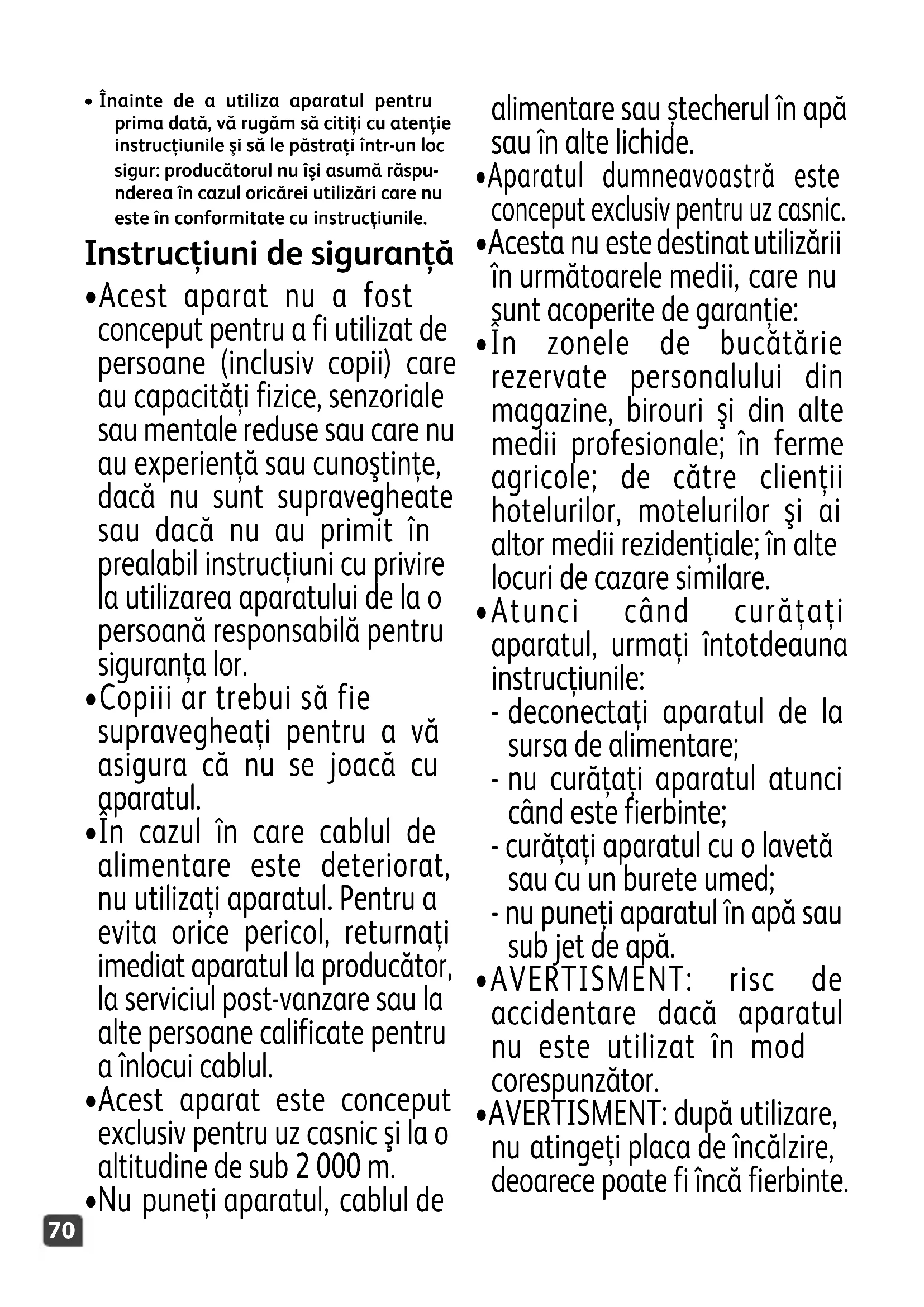 - Înainte de a utiliza aparatul pentru prima dată, vă rugăm să citiţi cu atenţie instrucţiunile şi să le păstraţi într-un loc sigur: producătorul nu îşi asumă răspu- nderea în cazul oricărei utilizări care nu este în conformitate cu instrucţiunile. Instrucţiuni de siguranţă