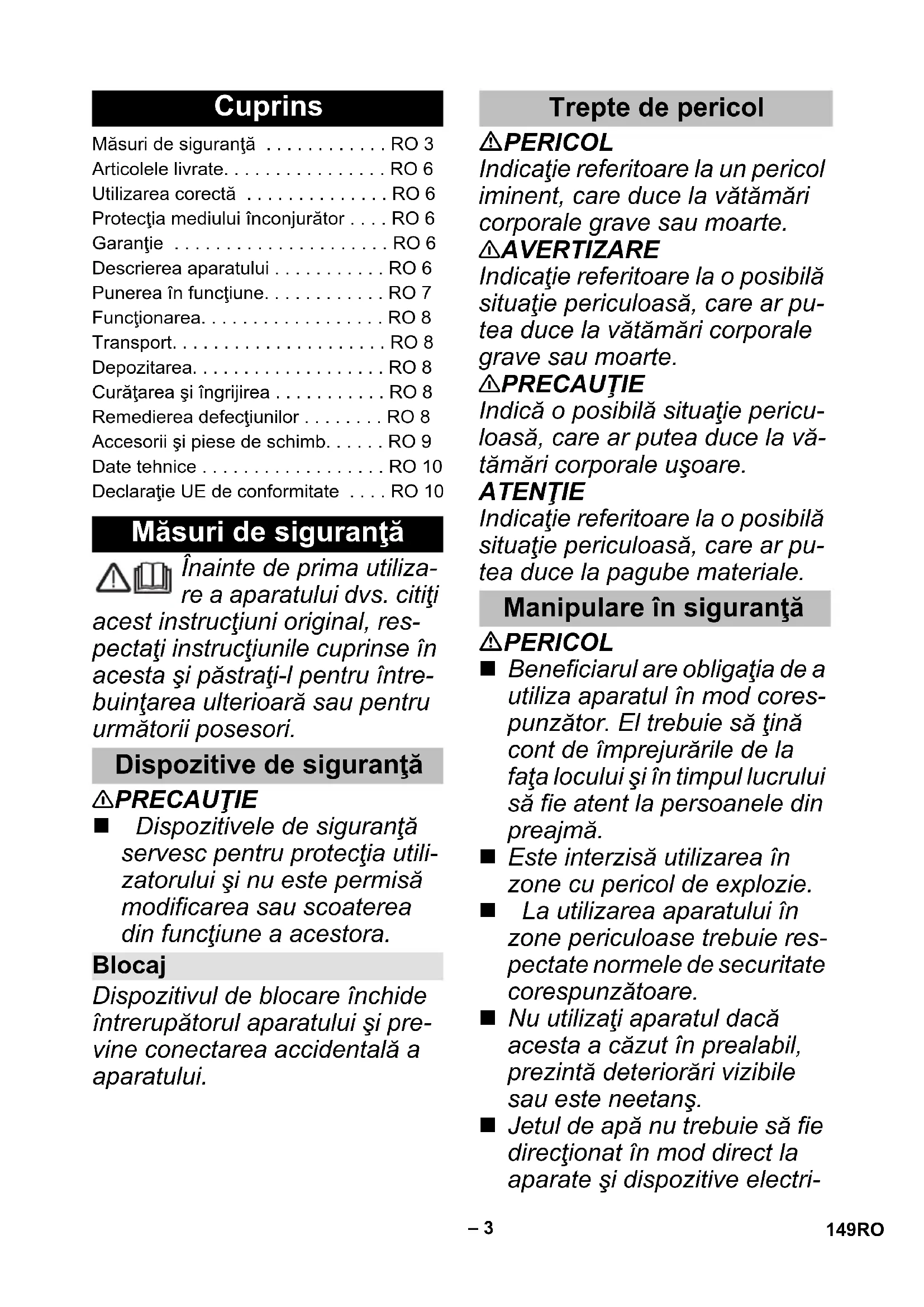 Masa (bez zestawu akumulatorów) 0,16 kg Deklaracja zgodności UE Produkt: Myjka ciśnieniowa (zasilana akumulatorowo) Typ: 1.328-000 1.328-1xx Obowiązujące dyrektywy UE 2014/35/UE 2014/35/UE 2014/30/UE 2014/30/UE 2011/65/UE 2011/65/UE 2000/14/WE – Zastosowane normy zharmonizowane EN 60335–1 EN 60335–1 – EN 60335-2-29 EN 60335–2–54 EN 60335–2–54 EN 62233: 2008 EN 62233: 2008 EN 55014–1:2017 EN 55014–1:2017 EN 55014–2: 2015 EN 55014–2: 2015 – EN 61000–3–2: 2014 – EN 61000–3–3: 2013 EN 50581 EN 50581 Zastosowana metoda oceny zgodności 2000/14/WE: Załącznik V Poziom mocy akustycznej dB(A) Zmierzony: 82 Gwarantowany: 84 Chairman of the Board of Management Director Regulatory Affairs & Certification 148 PL– 3 Înainte de prima utiliza- re a aparatului dvs. citiţi acest instrucţiuni original, res- pectaţi instrucţiunile cuprinse în acesta şi păstraţi-l pentru între- buinţarea ulterioară sau pentru următorii posesori. 몇 PRECAUŢIE Dispozitivele de siguranţă servesc pentru protecţia utili- zatorului şi nu este permisă modificarea sau scoaterea din funcţiune a acestora. Dispozitivul de blocare închide întrerupătorul aparatului şi pre- vine conectarea accidentală a aparatului. PERICOL Indicaţie referitoare la un pericol iminent, care duce la vătămări corporale grave sau moarte. 몇 AVERTIZARE Indicaţie referitoare la o posibilă situaţie periculoasă, care ar pu- tea duce la vătămări corporale grave sau moarte. 몇 PRECAUŢIE Indică o posibilă situaţie pericu- loasă, care ar putea duce la vă- tămări corporale uşoare. ATENŢIE Indicaţie referitoare la o posibilă situaţie periculoasă, care ar pu- tea duce la pagube materiale. PERICOL Beneficiarul are obligaţia de a utiliza aparatul în mod cores- punzător. El trebuie să ţină cont de împrejurările de la faţa locului şi în timpul lucrului să fie atent la persoanele din preajmă. Este interzisă utilizarea în zone cu pericol de explozie. La utilizarea aparatului în zone periculoase trebuie res- pectate normele de securitate corespunzătoare. Nu utilizaţi aparatul dacă acesta a căzut în prealabil, prezintă deteriorări vizibile sau este neetanş. Jetul de apă nu trebuie să fie direcţionat în mod direct la aparate şi dispozitive electri- Cuprins Măsuri de siguranţă . . . . . . . . . . . . RO 3 Articolele livrate. . . . . . . . . . . . . . . . RO 6 Utilizarea corectă . . . . . . . . . . . . . . RO 6 Protecţia mediului înconjurător . . . . RO 6 Garanţie . . . . . . . . . . . . . . . . . . . . . RO 6 Descrierea aparatului . . . . . . . . . . . RO 6 Punerea în funcţiune. . . . . . . . . . . . RO 7 Funcţionarea. . . . . . . . . . . . . . . . . . RO 8 Transport. . . . . . . . . . . . . . . . . . . . . RO 8 Depozitarea. . . . . . . . . . . . . . . . . . . RO 8 Curăţarea şi îngrijirea . . . . . . . . . . . RO 8 Remedierea defecţiunilor . . . . . . . . RO 8 Accesorii şi piese de schimb. . . . . . RO 9 Date tehnice . . . . . . . . . . . . . . . . . . RO 10 Declaraţie UE de conformitate . . . . RO 10 Măsuri de siguranţă Dispozitive de siguranţă Blocaj Trepte de pericol Manipulare în siguranţă 149RO– 4 ce care includ componente electrice. Nu stropiţi obiecte care conţin materiale periculoase (de ex. azbest). 몇 AVERTIZARE Nu este permisă utilizarea aparatului de către copii sau persoane neinstruite. Aparatul nu este destinat pentru a fi folosit de persoane cu capacităţi psihice, senzori- ale sau mintale limitate sau de persoane, care nu dispun de experienţa şi/sau cunoş- tinţa necesară, cu excepţia acelor cazuri, în care ele sunt supravegheate de o persoa- nă responsabilă de siguranţa lor sau au fost instruite de că- tre această persoană în pri- vinţa utilizării aparatului şi sunt conştiente de pericolele care rezultă din aceasta. Nu lăsaţi copiii să se joace cu aparatul. Nu lăsaţi copii nesuprave- gheaţi, pentru a vă asigura, că nu se joacă cu aparatul. Puneţi aparatul în func ţiune şi depozitaţi-l doar conform de- scrierilor şi a figurilor! Nu îndreptaţi niciodată jetul înspre persoane, animale sau obiecte libere! Aparatul conţine piese electri- ce, nu spălaţi de aceea apa- ratul sun apă curentă! Conform prevederilor aplica- bile, aparatul nu trebuie să fie utilizat niciodată fără separa- tor de sistem pentru reţeaua de apă potabilă. Asiguraţi-vă că racordul instalaţiei dvs. de apă la care veţi conecta apa- ratul, este dotat cu separator de sistem conform EN 12729 tip BA. Apa, care curge printr-un se- parator de sistem este clasifi- cată ca fiind nepotabilă. 몇 PRECAUŢIE Aparatul poate fi deteriorat în timpul funcţionării uscate. Nu lăsaţi aparatul nesuprave- gheat în timp ce acesta se află în funcţiune. ATENŢIE Nu puneţi aparatul în funcţiu- ne sub temperaturi de 0 °C. Simboluri pe aparat Aparatul nu poate fi racor- dat direct la reţeaua publi- că de alimentare cu apă. 150 RO– 5 PERICOL Înainte de fiecare utilizare ve- rificaţi dacă ştecărul de reţea, cablul de legătură, adaptorul acumulatorului şi acumulato- rul prezintă semne de deteri- orare. Folosirea aparatelor deteriorate este interzisă; aparatele deteriorate trebuie înlocuite. Desfacerea încărcătorului este interzisă. Încărcătorul deteriorat sau defect trebuie înlocuit. Nu folosiţi încărcătorul în me- dii în care există pericolul de explozie. Nu apucaţi niciodată fişa de alimentare şi priza cu mâinile ude. Nu folosiţi încărcătorul dacă este murdar sau umed. Nu încărcaţi baterii, pericol de explozie. 몇 PRECAUŢIE Tensiunea de alimentare tre- buie să corespundă tensiunii indicate pe plăcuţa de tip a în- cărcătorului. Folosiţi încărcătorul numai pentru încărcarea acumulato- rilor aprobaţi. Încărcarea setului de acumu- latori este permisă doar cu în- cărcătorul original livrat sau cu un încărcător aprobat de KÄRCHER. ATENŢ