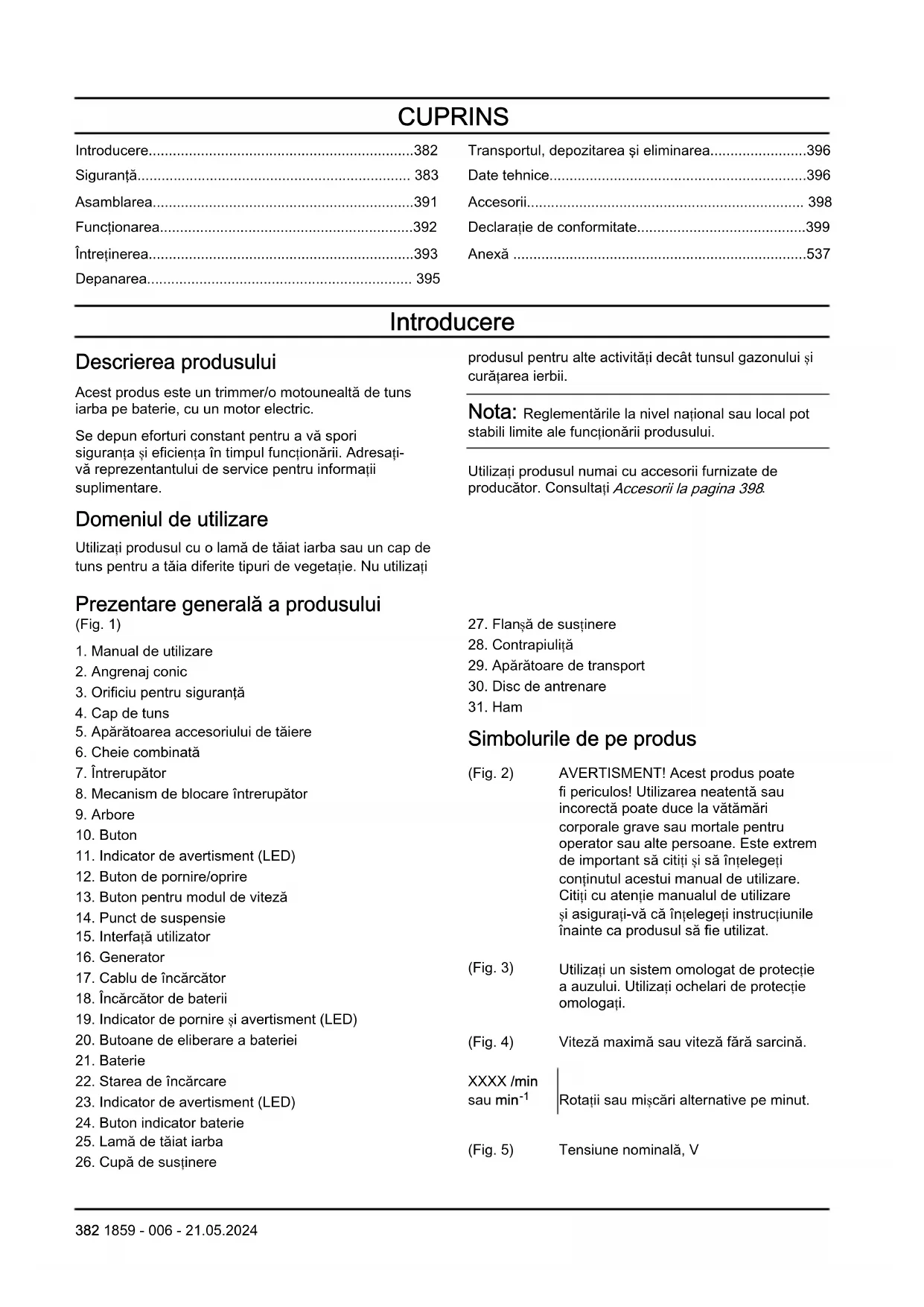 - Anexă Introducere Descrierea produsului Acest produs este un trimmer/o motounealtă de tuns iarba pe baterie, cu un motor electric. Se depun eforturi constant pentru a vă spori siguranța și eficiența în timpul funcționării. Adresați- vă reprezentantului de service pentru informații suplimentare. Domeniul de utilizare Utilizați produsul cu o lamă de tăiat iarba sau un cap de tuns pentru a tăia diferite tipuri de vegetație. Nu utilizați produsul pentru alte activități decât tunsul gazonului și curățarea ierbii. Nota: Reglementările la nivel național sau local pot stabili limite ale funcționării produsului. Utilizați produsul numai cu accesorii furnizate de producător. Consultați Accesorii la pagina 398 p. 537