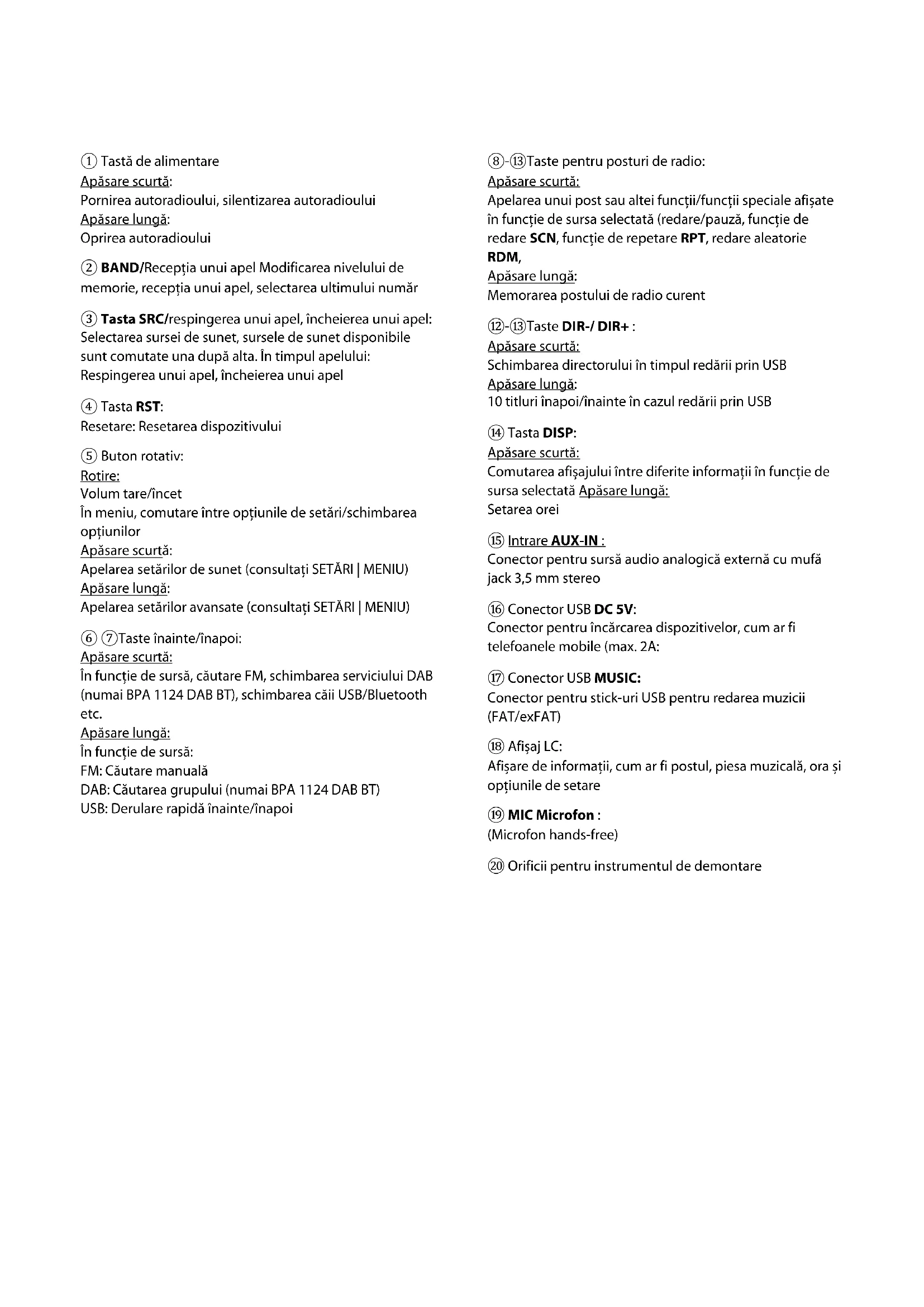 Apăsare scurtă: Pornirea autoradioului, silentizarea autoradioului Apăsare lungă: Oprirea autoradioului ② BAND/Recepția unui apel Modificarea nivelului de memorie, recepția unui apel, selectarea ultimului număr ③ Tasta SRC/respingerea unui apel, încheierea unui apel: Selectarea sursei de sunet, sursele de sunet disponibile sunt comutate una după alta. În timpul apelului: Respingerea unui apel, încheierea unui apel ④ Tasta RST: Resetare: Resetarea dispozitivului ⑤ Buton rotativ: Rotire: Volum tare/încet În meniu, comutare între opțiunile de setări/schimbarea opțiunilor Apăsare scurtă: Apelarea setărilor de sunet (consultați SETĂRI | MENIU) Apăsare lungă: Apelarea setărilor avansate (consultați SETĂRI | MENIU) ⑥ ⑦Taste înainte/înapoi: Apăsare scurtă: În funcție de sursă, căutare FM, schimbarea serviciului DAB (numai BPA 1124 DAB BT), schimbarea căii USB/Bluetooth etc. Apăsare lungă: În funcție de sursă: FM: Căutare manuală DAB: Căutarea grupului (numai BPA 1124 DAB BT) USB: Derulare rapidă înainte/înapoi ⑧-⑬Taste pentru posturi de radio: Apăsare scurtă: Apelarea unui post sau altei funcții/funcții speciale afișate în funcție de sursa selectată (redare/pauză, funcție de redare SCN, funcție de repetare RPT, redare aleatorie RDM, Apăsare lungă: Memorarea postului de radio curent ⑫-⑬Taste DIR-/ DIR+ : Apăsare scurtă: Schimbarea directorului în timpul redării prin USB Apăsare lungă: 10 titluri înapoi/înainte în cazul redării prin USB ⑭ Tasta DISP: Apăsare scurtă: Comutarea afișajului între diferite informații în funcție de sursa selectată Apăsare lungă: Setarea orei ⑮ Intrare AUX-IN : Conector pentru sursă audio analogică externă cu mufă jack 3,5 mm stereo ⑯ Conector USB DC 5V: Conector pentru încărcarea dispozitivelor, cum ar fi telefoanele mobile (max. 2A: ⑰ Conector USB MUSIC: Conector pentru stick-uri USB pentru redarea muzicii (FAT/exFAT) ⑱ Afișaj LC: Afișare de informații, cum ar fi postul, piesa muzicală, ora și opțiunile de setare ⑲ MIC Microfon : (Microfon hands-free) ⑳ Orificii pentru instrumentul de demontareRO