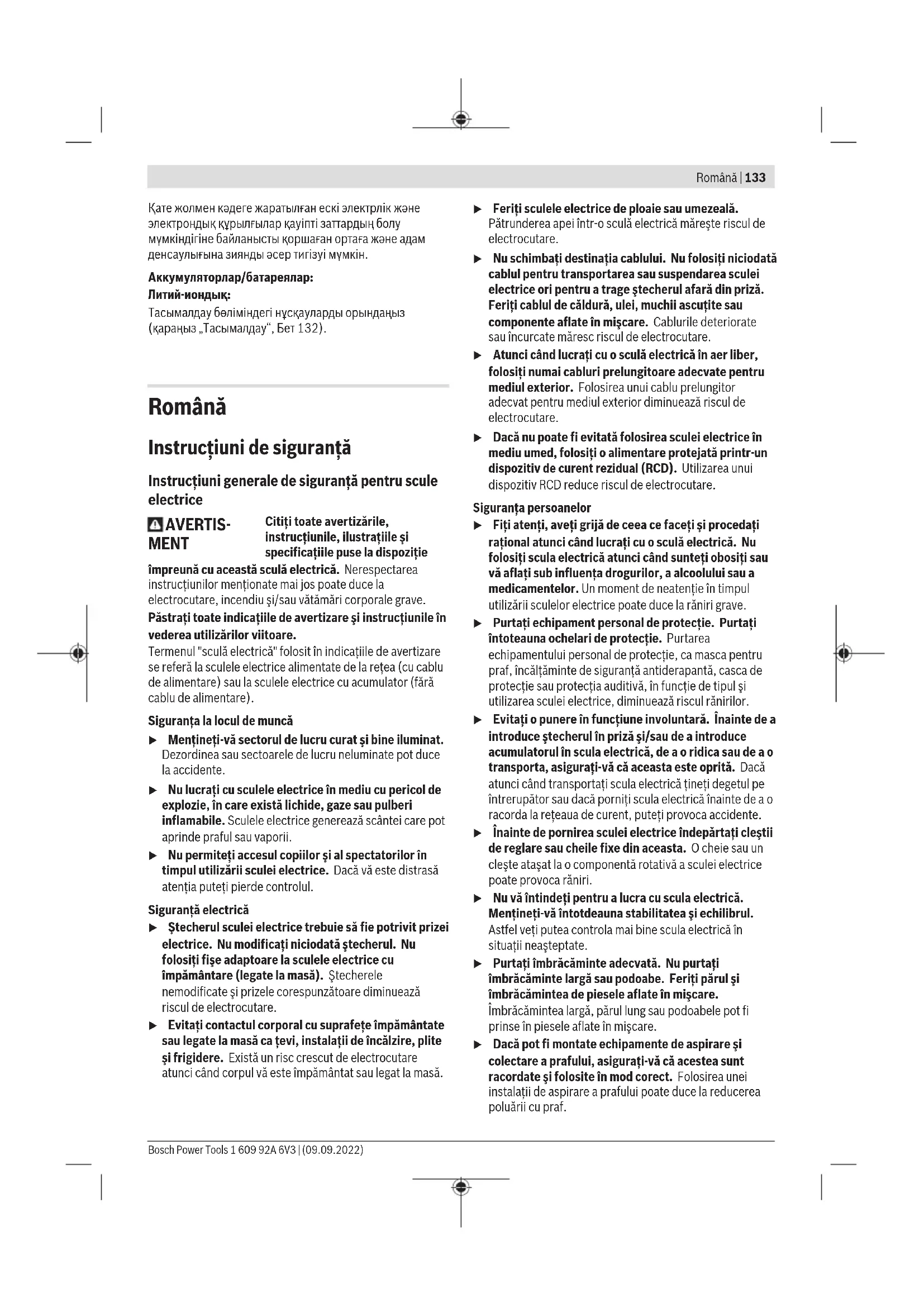 Ұсынылған литий-иондық аккумуляторлар қауіпті тауарларға қойылатын талаптарға бағынады. Пайдаланушы аккумуляторларды көшеде қосымша құжаттарсыз тасымалдай алады. Үшінші тұлғалар (мысалы, әуе көлігі немесе жіберу) орамаға және маркаларға қойылатын арнайы талаптарды сақтау керек. Жіберуге дайындау кезінде қауіпті жүктерді тасымалдау маманымен хабарласу керек. Аккумуляторды корпусы зақымдалған болса ғана жіберіңіз. Ашық түйіспелерді желімдеңіз және аккумуляторды орамада қозғалмайтындай ораңыз. Қажет болса, қосымша ұлттық ережелерді сақтаңыз. Кәдеге жарату Электр құралдарды, аккумуляторларды, керек-жарақтарды және орау материалдарын экологиялық тұрғыдан дұрыс утилизациялауға тапсыру керек. Электр құралдарды және аккумуляторларды/батареяларды үй қоқысына тастамаңыз! Тек қана ЕО елдері үшін: Ескі электрлік және электрондық құрылғылар туралы 2012/19/EU еуропалық директивасы және оның ұлттық заңнамада қолданылуы бойынша пайдалануға бұдан былай жарамсыз электрлік құралдарды және 2006/66/ ЕC еуропалық директивасы бойынша зақымдалған немесе ескірген аккумуляторларды/батареяларды бөлек жинап, қоршаған орта үшін қауіпсіз жолмен қайта өңдеуге жіберу қажет. 1 609 92A 6V3 | (09.09.2022) Bosch Power ToolsRomână | 133 Қате жолмен кәдеге жаратылған ескі электрлік және электрондық құрылғылар қауіпті заттардың болу мүмкіндігіне байланысты қоршаған ортаға және адам денсаулығына зиянды әсер тигізуі мүмкін. Аккумуляторлар/батареялар: Литий-иондық: Тасымалдау бөліміндегі нұсқауларды орындаңыз (қараңыз „Тасымалдау“, Бет132). Română Instrucţiuni de siguranţă Instrucţiuni generale de siguranţă pentru scule electrice AVERTIS- MENT Citiţi toate avertizările, instrucţiunile, ilustraţiile şi specificaţiile puse la dispoziţie împreună cu această sculă electrică. Nerespectarea instrucţiunilor menţionate mai jos poate duce la electrocutare, incendiu şi/sau vătămări corporale grave. Păstraţi toate indicaţiile de avertizare şi instrucţiunile în vederea utilizărilor viitoare. Termenul "sculă electrică" folosit în indicaţiile de avertizare se referă la sculele electrice alimentate de la reţea (cu cablu de alimentare) sau la sculele electrice cu acumulator (fără cablu de alimentare). Siguranţa la locul de muncă u Menţineţi‑vă sectorul de lucru curat şi bine iluminat. Dezordinea sau sectoarele de lucru neluminate pot duce la accidente. u Nu lucraţi cu sculele electrice în mediu cu pericol de explozie, în care există lichide, gaze sau pulberi inflamabile. Sculele electrice generează scântei care pot aprinde praful sau vaporii. u Nu permiteţi accesul copiilor şi al spectatorilor în timpul utilizării sculei electrice. Dacă vă este distrasă atenţia puteţi pierde controlul. Siguranţă electrică u Ştecherul sculei electrice trebuie să fie potrivit prizei electrice. Nu modificaţi niciodată ştecherul. Nu folosiţi fişe adaptoare la sculele electrice cu împământare (legate la masă). Ştecherele nemodificate şi prizele corespunzătoare diminuează riscul de electrocutare. u Evitaţi contactul corporal cu suprafeţe împământate sau legate la masă ca ţevi, instalaţii de încălzire, plite şi frigidere. Există un risc crescut de electrocutare atunci când corpul vă este împământat sau legat la masă. u Feriţi sculele electrice de ploaie sau umezeală. Pătrunderea apei într‑o sculă electrică măreşte riscul de electrocutare. u Nu schimbaţi destinaţia cablului. Nu folosiţi niciodată cablul pentru transportarea sau suspendarea sculei electrice ori pentru a trage ştecherul afară din priză. Feriţi cablul de căldură, ulei, muchii ascuţite sau componente aflate în mişcare. Cablurile deteriorate sau încurcate măresc riscul de electrocutare. u Atunci când lucraţi cu o sculă electrică în aer liber, folosiţi numai cabluri prelungitoare adecvate pentru mediul exterior. Folosirea unui cablu prelungitor adecvat pentru mediul exterior diminuează riscul de electrocutare. u Dacă nu poate fi evitată folosirea sculei electrice în mediu umed, folosiţi o alimentare protejată printr-un dispozitiv de curent rezidual (RCD). Utilizarea unui dispozitiv RCD reduce riscul de electrocutare. Siguranţa persoanelor u Fiţi atenţi, aveţi grijă de ceea ce faceţi şi procedaţi raţional atunci când lucraţi cu o sculă electrică. Nu folosiţi scula electrică atunci când sunteţi obosiţi sau vă aflaţi sub influenţa drogurilor, a alcoolului sau a medicamentelor. Un moment de neatenţie în timpul utilizării sculelor electrice poate duce la răniri grave. u Purtaţi echipament personal de protecţie. Purtaţi întoteauna ochelari de protecţie. Purtarea echipamentului personal de protecţie, ca masca pentru p