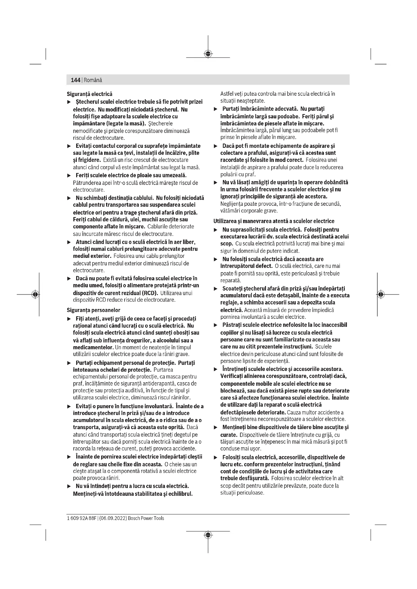 Ұсынылған литий-иондық аккумуляторлар қауіпті тауарларға қойылатын талаптарға бағынады. Пайдаланушы аккумуляторларды көшеде қосымша құжаттарсыз тасымалдай алады. Үшінші тұлғалар (мысалы, әуе көлігі немесе жіберу) орамаға және маркаларға қойылатын арнайы талаптарды сақтау керек. Жіберуге дайындау кезінде қауіпті жүктерді тасымалдау маманымен хабарласу керек. Аккумуляторды корпусы зақымдалған болса ғана жіберіңіз. Ашық түйіспелерді желімдеңіз және аккумуляторды орамада қозғалмайтындай ораңыз. Қажет болса, қосымша ұлттық ережелерді сақтаңыз. Кәдеге жарату Электр құралдарды, аккумуляторларды, керек-жарақтарды және орау материалдарын экологиялық тұрғыдан дұрыс утилизациялауға тапсыру керек. Электр құралдарды және аккумуляторларды/батареяларды үй қоқысына тастамаңыз! Тек қана ЕО елдері үшін: Ескі электрлік және электрондық құрылғылар туралы 2012/19/EU еуропалық директивасы және оның ұлттық заңнамада қолданылуы бойынша пайдалануға бұдан былай жарамсыз электрлік құралдарды және 2006/66/ ЕC еуропалық директивасы бойынша зақымдалған немесе ескірген аккумуляторларды/батареяларды бөлек жинап, қоршаған орта үшін қауіпсіз жолмен қайта өңдеуге жіберу қажет. Қате жолмен кәдеге жаратылған ескі электрлік және электрондық құрылғылар қауіпті заттардың болу мүмкіндігіне байланысты қоршаған ортаға және адам денсаулығына зиянды әсер тигізуі мүмкін. Аккумуляторлар/батареялар: Литий-иондық: Тасымалдау бөліміндегі нұсқауларды орындаңыз (қараңыз „Тасымалдау“, Бет143). Română Instrucţiuni de siguranţă Instrucţiuni generale de siguranţă pentru scule electrice AVERTIS- MENT Citiţi toate avertizările, instrucţiunile, ilustraţiile şi specificaţiile puse la dispoziţie împreună cu această sculă electrică. Nerespectarea instrucţiunilor menţionate mai jos poate duce la electrocutare, incendiu şi/sau vătămări corporale grave. Păstraţi toate indicaţiile de avertizare şi instrucţiunile în vederea utilizărilor viitoare. Termenul "sculă electrică" folosit în indicaţiile de avertizare se referă la sculele electrice alimentate de la reţea (cu cablu de alimentare) sau la sculele electrice cu acumulator (fără cablu de alimentare). Siguranţa la locul de muncă u Menţineţi‑vă sectorul de lucru curat şi bine iluminat. Dezordinea sau sectoarele de lucru neluminate pot duce la accidente. u Nu lucraţi cu sculele electrice în mediu cu pericol de explozie, în care există lichide, gaze sau pulberi inflamabile. Sculele electrice generează scântei care pot aprinde praful sau vaporii. u Nu permiteţi accesul copiilor şi al spectatorilor în timpul utilizării sculei electrice. Dacă vă este distrasă atenţia puteţi pierde controlul. Bosch Power Tools 1 609 92A 88F | (06.09.2022)144 | Română Siguranţă electrică u Ştecherul sculei electrice trebuie să fie potrivit prizei electrice. Nu modificaţi niciodată ştecherul. Nu folosiţi fişe adaptoare la sculele electrice cu împământare (legate la masă). Ştecherele nemodificate şi prizele corespunzătoare diminuează riscul de electrocutare. u Evitaţi contactul corporal cu suprafeţe împământate sau legate la masă ca ţevi, instalaţii de încălzire, plite şi frigidere. Există un risc crescut de electrocutare atunci când corpul vă este împământat sau legat la masă. u Feriţi sculele electrice de ploaie sau umezeală. Pătrunderea apei într‑o sculă electrică măreşte riscul de electrocutare. u Nu schimbaţi destinaţia cablului. Nu folosiţi niciodată cablul pentru transportarea sau suspendarea sculei electrice ori pentru a trage ştecherul afară din priză. Feriţi cablul de căldură, ulei, muchii ascuţite sau componente aflate în mişcare. Cablurile deteriorate sau încurcate măresc riscul de electrocutare. u Atunci când lucraţi cu o sculă electrică în aer liber, folosiţi numai cabluri prelungitoare adecvate pentru mediul exterior. Folosirea unui cablu prelungitor adecvat pentru mediul exterior diminuează riscul de electrocutare. u Dacă nu poate fi evitată folosirea sculei electrice în mediu umed, folosiţi o alimentare protejată printr-un dispozitiv de curent rezidual (RCD). Utilizarea unui dispozitiv RCD reduce riscul de electrocutare. Siguranţa persoanelor u Fiţi atenţi, aveţi grijă de ceea ce faceţi şi procedaţi raţional atunci când lucraţi cu o sculă electrică. Nu folosiţi scula electrică atunci când sunteţi obosiţi sau vă aflaţi sub influenţa drogurilor, a alcoolului sau a medicamentelor. Un moment de neatenţie în timpul utilizării sculelor electrice poate duce la răniri grave. u Purtaţi echipament personal de protecţie. Purtaţi întoteauna ochelari de protecţie. Purtarea echipamentului personal de protecţie, ca masca pentru p