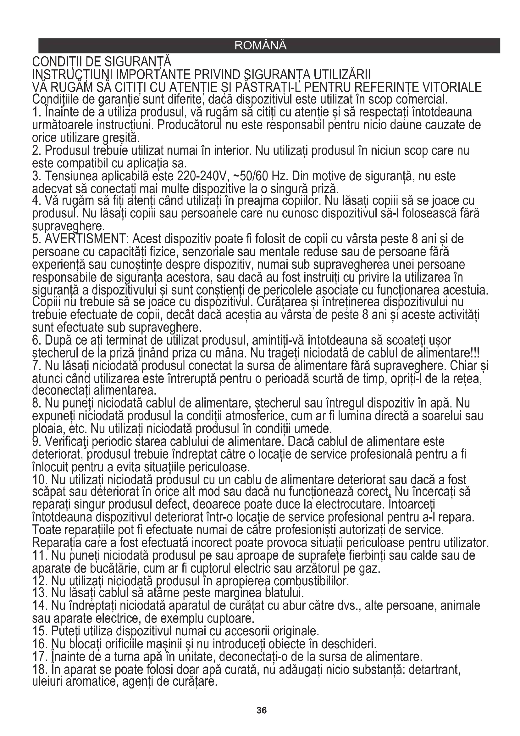 INSTRUCȚIUNI IMPORTANTE PRIVIND SIGURANȚA UTILIZĂRII VĂ RUGĂM SĂ CITIȚI CU ATENȚIE ȘI PĂSTRAȚI-L PENTRU REFERINȚE VITORIALE Condițiile de garanție sunt diferite, dacă dispozitivul este utilizat în scop comercial.