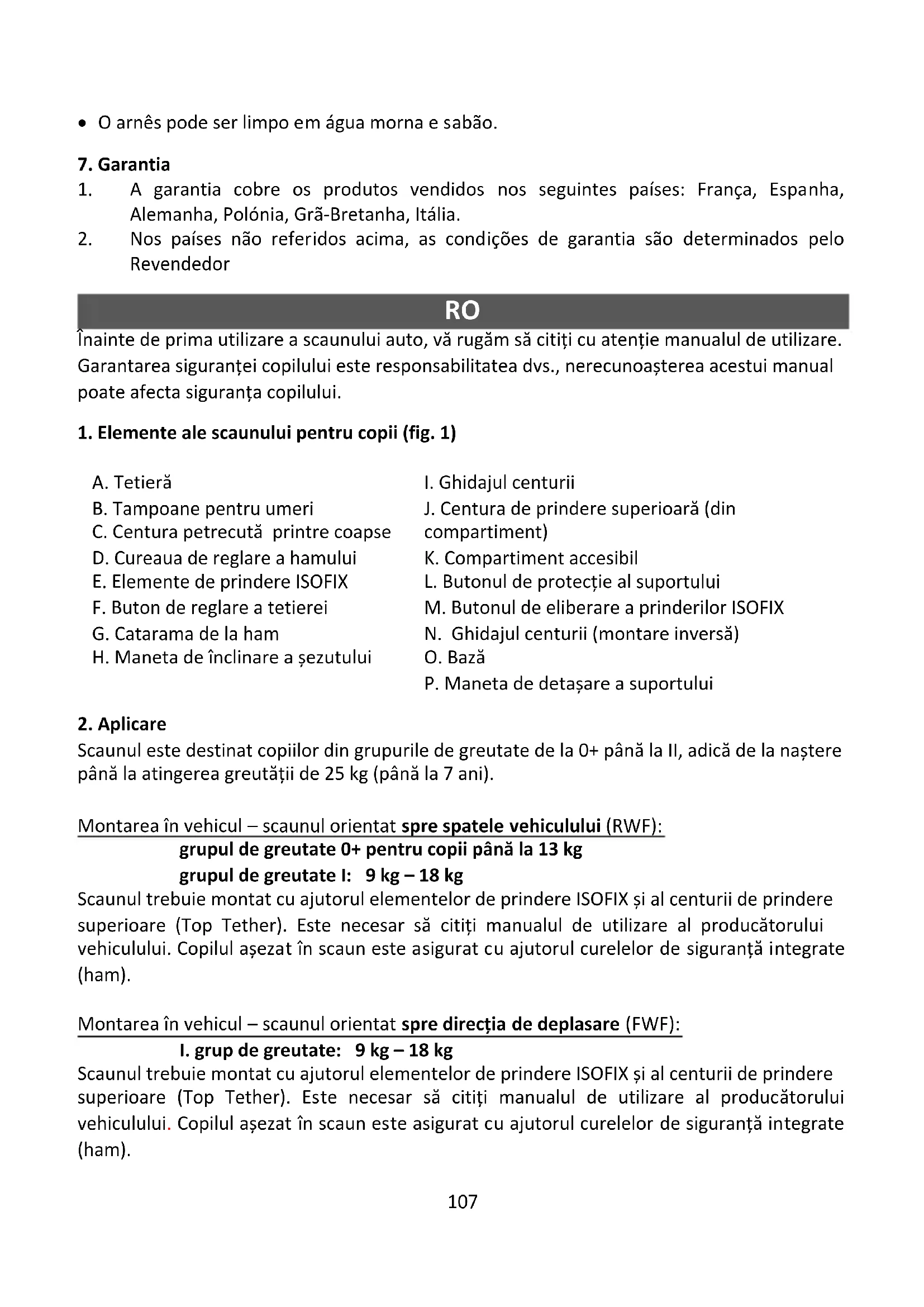 Scaunul trebuie montat cu ajutorul elementelor de prindere ISOFIX și al centurii de prindere superioare (Top Tether). Este necesar să citiți manualul de utilizare al producătorului vehiculului. Copilul așezat în scaun este asigurat cu ajutorul curelelor de siguranță integrate (ham).108