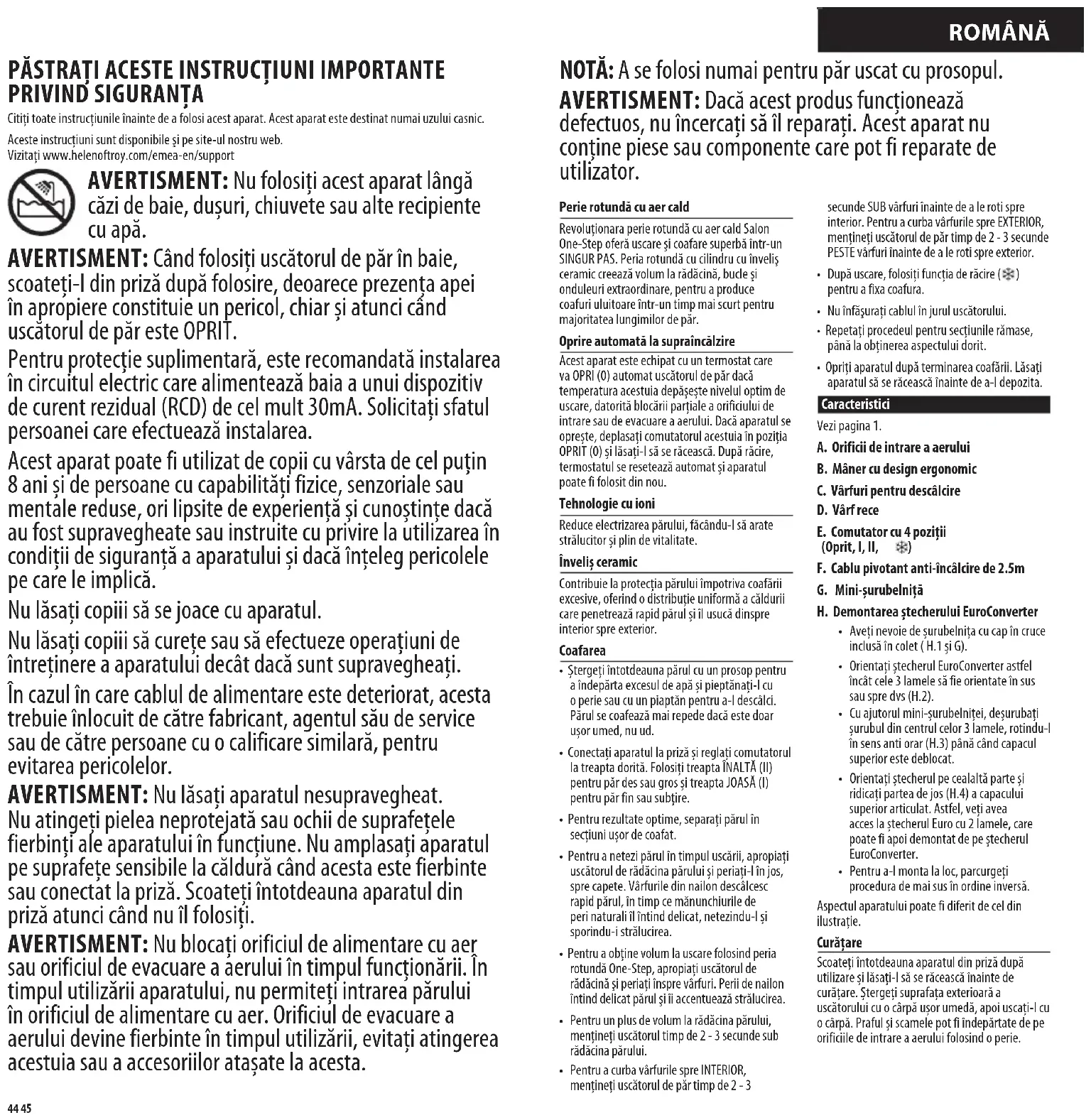 Citiți toate instrucțiunile înainte de a folosi acest aparat. Acest aparat este destinat numai uzului casnic. Aceste instrucțiuni sunt disponibile şi pe site-ul nostru web. Vizitați www.helenoftroy.com/emea-en/support AVERTISMENT: Nu folosiți acest aparat lângă căzi de baie, dușuri, chiuvete sau alte recipiente cu apă. AVERTISMENT: Când folosiți uscătorul de păr în baie, scoateți-l din priză după folosire, deoarece prezența apei în apropiere constituie un pericol, chiar și atunci când uscătorul de păr este OPRIT. Pentru protecție suplimentară, este recomandată instalarea în circuitul electric care alimentează baia a unui dispozitiv de curent rezidual (RCD) de cel mult 30mA. Solicitați sfatul persoanei care efectuează instalarea. Acest aparat poate fi utilizat de copii cu vârsta de cel puțin 8 ani și de persoane cu capabilități fizice, senzoriale sau mentale reduse, ori lipsite de experiență și cunoștințe dacă au fost supravegheate sau instruite cu privire la utilizarea în condiții de siguranță a aparatului și dacă înțeleg pericolele pe care le implică. Nu lăsați copiii să se joace cu aparatul. Nu lăsați copiii să curețe sau să efectueze operațiuni de întreținere a aparatului decât dacă sunt supravegheați. În cazul în care cablul de alimentare este deteriorat, acesta trebuie înlocuit de către fabricant, agentul său de service sau de către persoane cu o calificare similară, pentru evitarea pericolelor. AVERTISMENT: Nu lăsați aparatul nesupravegheat. Nu atingeți pielea neprotejată sau ochii de suprafețele fierbinți ale aparatului în funcțiune. Nu amplasați aparatul pe suprafețe sensibile la căldură când acesta este fierbinte sau conectat la priză. Scoateți întotdeauna aparatul din priză atunci când nu îl folosiți. AVERTISMENT: Nu blocați orificiul de alimentare cu aer sau orificiul de evacuare a aerului în timpul funcționării. În timpul utilizării aparatului, nu permiteți intrarea părului în orificiul de alimentare cu aer. Orificiul de evacuare a aerului devine fierbinte în timpul utilizării, evitați atingerea acestuia sau a accesoriilor atașate la acesta. NOTĂ: A se folosi numai pentru păr uscat cu prosopul. AVERTISMENT: Dacă acest produs funcționează defectuos, nu încercați să îl reparați. Acest aparat nu conține piese sau componente care pot fi reparate de utilizator. ROMÂNĂ Perie rotundă cu aer cald Revoluționara perie rotundă cu aer cald Salon One-Step oferă uscare şi coafare superbă într-un SINGUR PAS. Peria rotundă cu cilindru cu înveliş ceramic creează volum la rădăcină, bucle şi onduleuri extraordinare, pentru a produce coafuri uluitoare într-un timp mai scurt pentru majoritatea lungimilor de păr. Oprire automată la supraîncălzire Acest aparat este echipat cu un termostat care va OPRI (0) automat uscătorul de păr dacă temperatura acestuia depășește nivelul optim de uscare, datorită blocării parțiale a orificiului de intrare sau de evacuare a aerului. Dacă aparatul se oprește, deplasați comutatorul acestuia în poziția OPRIT (0) și lăsați-l să se răcească. După răcire, termostatul se resetează automat și aparatul poate fi folosit din nou. Tehnologie cu ioni Reduce electrizarea părului, făcându-l să arate strălucitor și plin de vitalitate. Înveliș ceramic Contribuie la protecția părului împotriva coafării excesive, oferind o distribuție uniformă a căldurii care penetrează rapid părul și îl usucă dinspre interior spre exterior. Coafarea