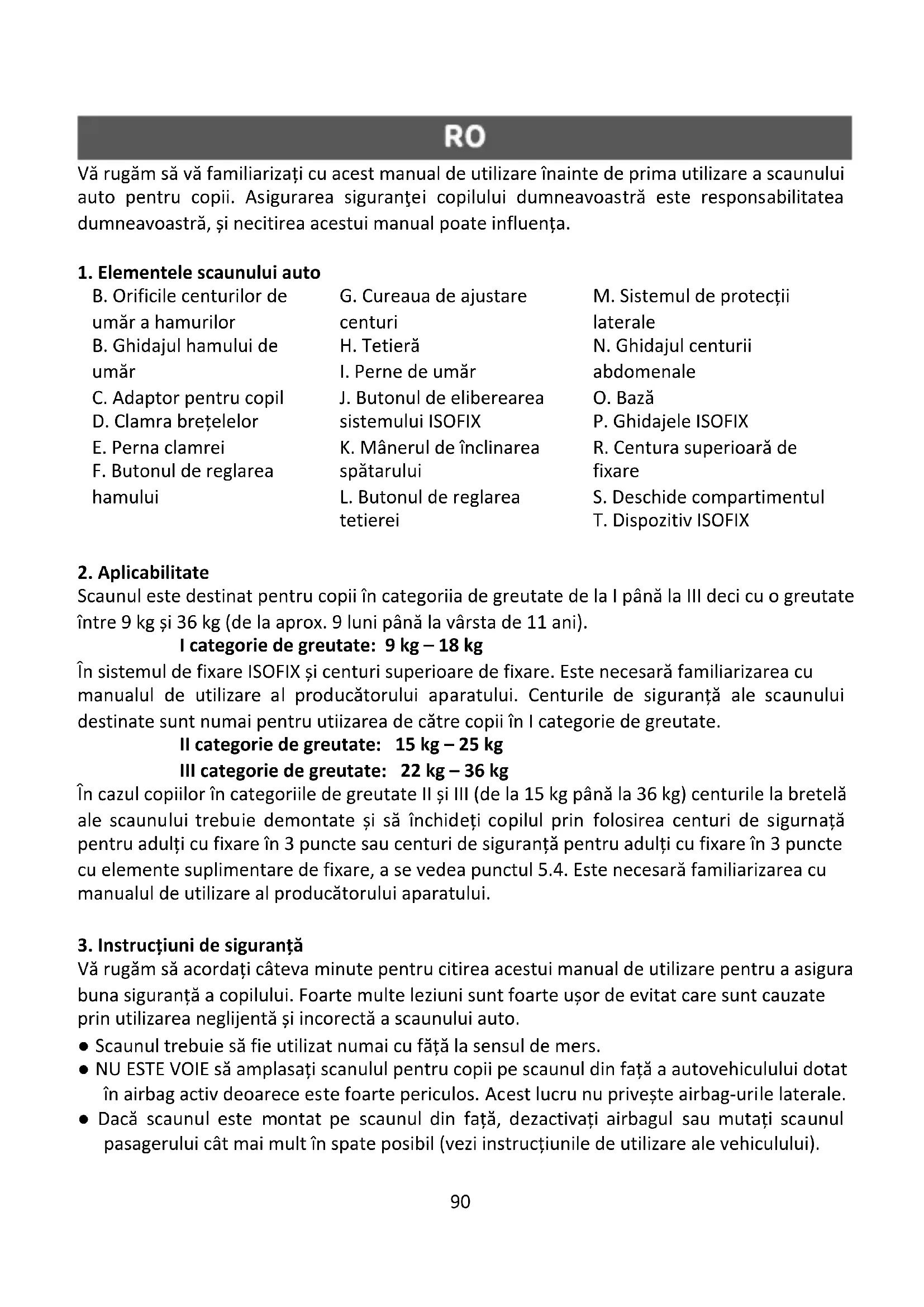 Vă rugăm să acordați câteva minute pentru citirea acestui manual de utilizare pentru a asigura buna siguranță a copilului. Foarte multe leziuni sunt foarte ușor de evitat care sunt cauzate prin utilizarea neglijentă și incorectă a scaunului auto. ● Scaunul trebuie să fie utilizat numai cu făță la sensul de mers. ● NU ESTE VOIE să amplasați scanulul pentru copii pe scaunul din față a autovehiculului dotat în airbag activ deoarece este foarte periculos. Acest lucru nu privește airbag-urile laterale. ● Dacă scaunul este montat pe scaunul din față, dezactivați airbagul sau mutați scaunul pasagerului cât mai mult în spate posibil (vezi instrucțiunile de utilizare ale vehiculului).91 ● Se recomandă montarea scaunului numai pe locurile din spate ale masinii. ● Pentru informații privind adecvarea scaunului vehiculului cu scaunul pentru copii, puteți găsi în manualul de utilizare al vehiculului. ● Acest sistem poate fi folosit doar pentru vehicule omologate și echipate cu centuri de siguranță transversale/cu prindere în 3 puncte/statice/cu retractor, omologate în temeiul Regulamentului CEE-ONU nr. 16 sau al altor standarde echivalente. ● Țineți minte pnetru ca toate centurile sistemului de siguranță pe vehicul să fie bine strânse, orice curele folosite pentru legarea copilului pe scaun să fie reglate la statura copilului, iar curelele să nu fie răsucite; ● Scaunul trebuie înlocuit, dacă este supus unor greutăți bruște care acționează în timpul unui accident rutier. ● Scaunul nu pote fi supus niciunei modificări. ● Sacunul pentru copil trebuie protejat împotriva acționări directe a soarelui, altfel elementele încălzite pot duce la arsuri la copilul dumneavoastră. ● Nu lăsați niciodată copilul nesupravegheat. ● Asigurați-vă că bagajele și alte elemente sunt bine fixate, în special pe raftul din spate sub parbriz, deoarece acestea pot provoca vătămări corporale în caz de coliziune ● Scaunul nu poate fi utilizat fără husă. ● A nu se utiliza huse alternative, decăt cele recomandate de către producător, deoarece face parte intergrală a sistemului de siguranţă a scaunului. ● Se recomandă păstrarea manualului de utilizare a scaunului pe toată perioada utilizări. ● A nu se folosi alte puncte de fixare, decât punctele descrise în manualul de utilizare și marcate pe scaunul pentru copii. ● Toate elementele rigide și componentele din plastic ale unui sistem de siguranță pentru copii trebuie amplasate și instalate în așa fel încât, în timpul utilizării zilnice a vehiculului, să nu poată fi blocate de vreun scaun mobil sau de vreo ușă a vehiculului; ● Frecvent verificați starea tehnică a centurilor de sigurnță, în mod special atrageți atenția na punctele de fixare, cusăturile, și elementele de reglare. ● Întrerupeți utilizarea scanului, dacă elementele lui se consideră deteriorate sau slăbite după accident. ● În cazul apariției unei situații de urgență este important ca să desprindeți rapid centurile de sigurnță/ Înseamnă că butonul de eliberarea centuriilor nu este complet asigurat, asigurați- vă că copilul dumneavoastră știe că nu trebuie să se joace cu catarama. ● A nu se folosi scaunul în casă. Nu este destinat pentru utilizarea casnică și trebuie să fie folosit numai în timpul călătoriei cu mașina. ● Spătarul scaunului trebuie să se bazeze pliat pe scaunul autovehiculului. Asigurați-vă că tetiera nu creează o distanță nedorită între scaun și bancheta din spate a vehiculului. Unele tetiere reprezintă un obstacol în calea instalării scaunului și, prin urmare, trebuie mai întâi demontate. ● Catarama centuri de siguranță pentru adulți nu trebuie să se afle prea aproape în partea de jos a cotierul scaunului. În caz de îndoială cu privire la acest punct, contactați producătorul scaunului.92 ● Trebuie să dați un exemplu bun pentru copil dumneavoastră și să închideți întodeauna centurile de siguranță. Chiar și un adult care nu poartă centuri de siguranță poate prezenta un risc pentru copil. ● Înainte de orice deplasare cu mașina asiguraţi-vă că scaunul este corect fixat. ● Fixați scaunul cu centurile de siguranță chiar și atunci când nu îl utilizați. Scaunul neefixat poate provoca rănirea pasagerilor chiar și în cazul unei frânări de urgență