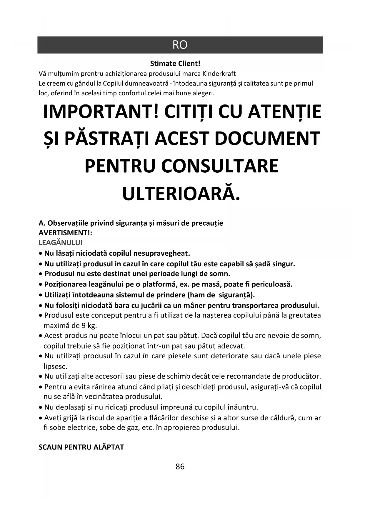 PENTRU CONSULTARE ULTERIOARĂ. A. Observațiile privind siguranța și măsuri de precauție AVERTISMENT!: LEAGĂNULUI