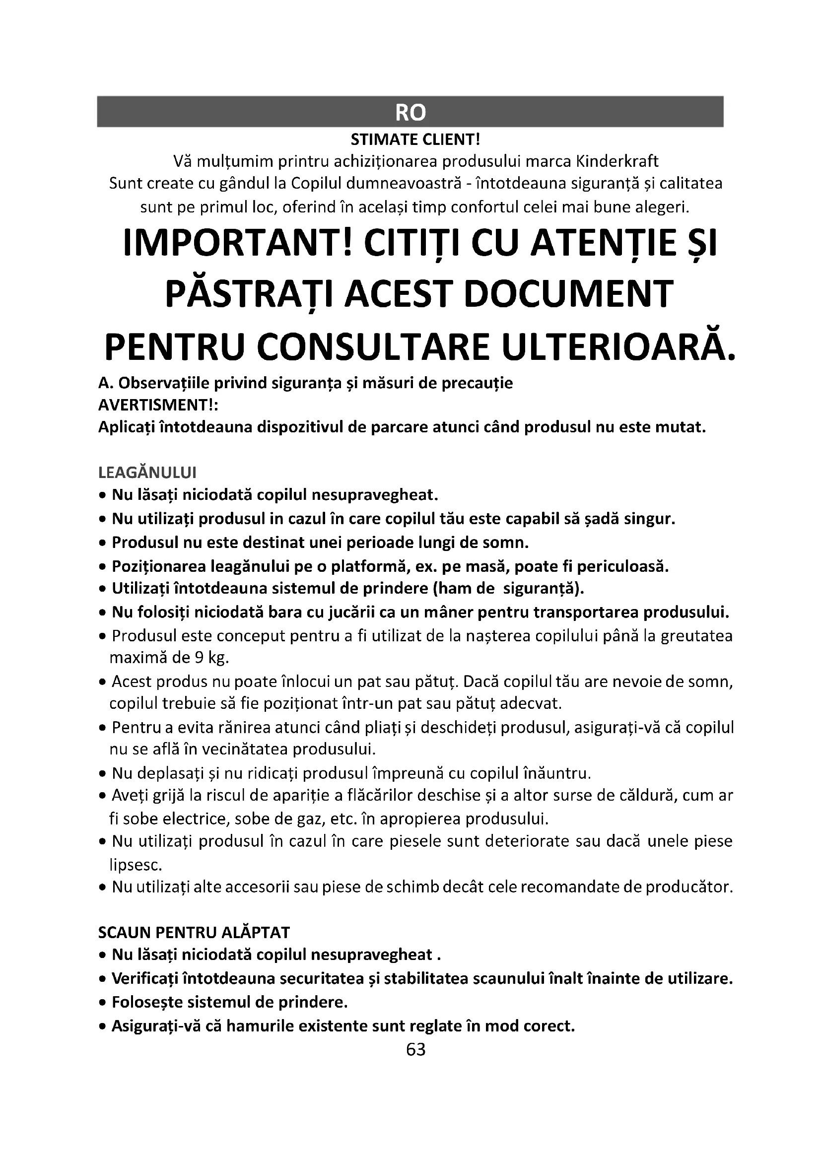 PENTRU CONSULTARE ULTERIOARĂ. A. Observațiile privind siguranța și măsuri de precauție AVERTISMENT!: Aplicați întotdeauna dispozitivul de parcare atunci când produsul nu este mutat. LEAGĂNULUI