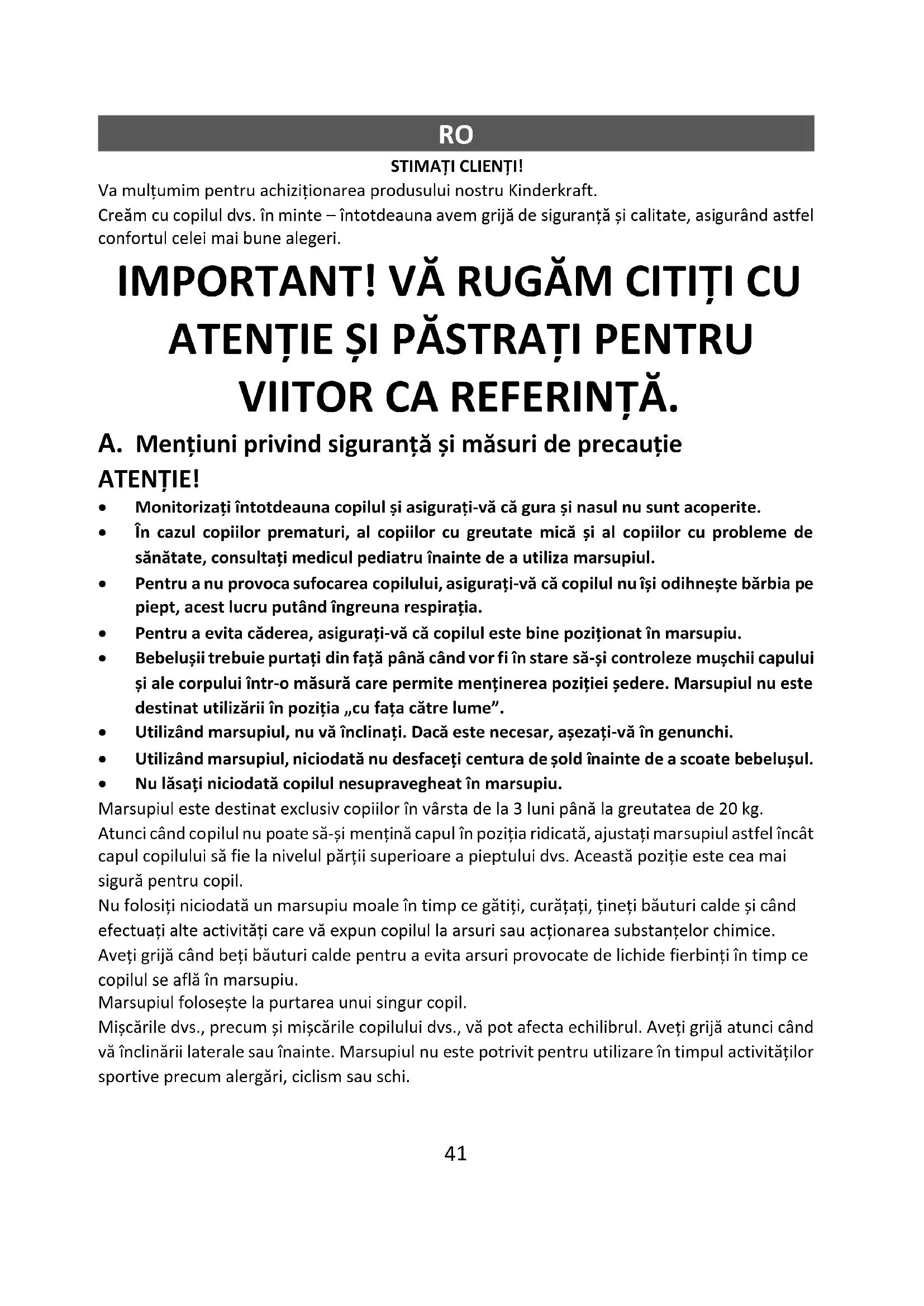 STIMAȚI CLIENȚI! Va mulțumim pentru achiziționarea produsului nostru Kinderkraft. Creăm cu copilul dvs. în minte – întotdeauna avem grijă de siguranță și calitate, asigurând astfel confortul celei mai bune alegeri. IMPORTANT! VĂ RUGĂM CITIȚI CU ATENȚIE ȘI PĂSTRAȚI PENTRU VIITOR CA REFERINȚĂ. A. Mențiuni privind siguranță și măsuri de precauție ATENȚIE!