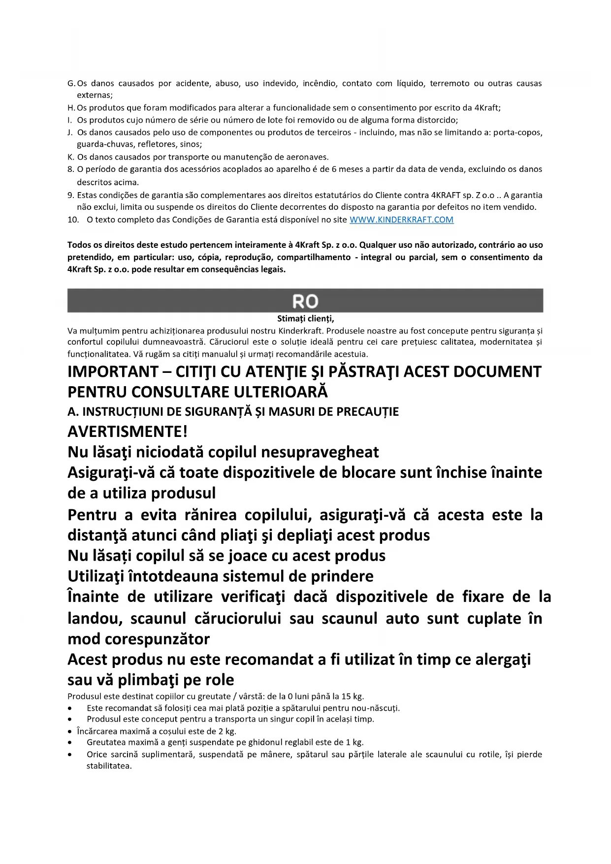 Todos os direitos deste estudo pertencem inteiramente à 4Kraft Sp. z o.o. Qualquer uso não autorizado, contrário ao uso pretendido, em particular: uso, cópia, reprodução, compartilhamento - integral ou parcial, sem o consentimento da 4Kraft Sp. z o.o. pode resultar em consequências legais. Stimați clienți, Va mulțumim pentru achiziționarea produsului nostru Kinderkraft. Produsele noastre au fost concepute pentru siguranța și confortul copilului dumneavoastră. Căruciorul este o soluție ideală pentru cei care prețuiesc calitatea, modernitatea și funcționalitatea. Vă rugăm sa citiți manualul și urmați recomandările acestuia. IMPORTANT – CITIŢI CU ATENŢIE ŞI PĂSTRAŢI ACEST DOCUMENT