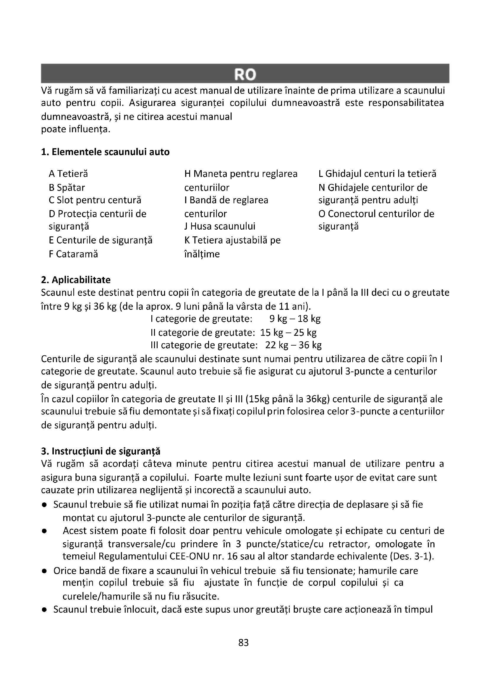 Vă rugăm să acordați câteva minute pentru citirea acestui manual de utilizare pentru a asigura buna siguranță a copilului. Foarte multe leziuni sunt foarte ușor de evitat care sunt cauzate prin utilizarea neglijentă și incorectă a scaunului auto. ● Scaunul trebuie să fie utilizat numai în poziția față către direcția de deplasare și să fie montat cu ajutorul 3-puncte ale centurilor de siguranță. ● Acest sistem poate fi folosit doar pentru vehicule omologate și echipate cu centuri de siguranță transversale/cu prindere în 3 puncte/statice/cu retractor, omologate în temeiul Regulamentului CEE-ONU nr. 16 sau al altor standarde echivalente (Des. 3-1). ● Orice bandă de fixare a scaunului în vehicul trebuie să fiu tensionate; hamurile care mențin copilul trebuie să fiu ajustate în funcție de corpul copilului și ca curelele/hamurile să nu fiu răsucite. ● Scaunul trebuie înlocuit, dacă este supus unor greutăți bruște care acționează în timpul84 unui accident rutier. ● Scaunul nu poate fi supus niciunei modificări. ● Scaunul pentru copil trebuie protejat împotriva acționări directe a soarelui, altfel elementele încălzite pot duce la arsuri la copilul dumneavoastră. ● Niciodată nu lăsați copilul nesupravegheat în scaun. ● Bagajele, sau alte obiecte care pot cauza riscul în timpul unui accident trebuie să fiu în mod corespunzător asigurate împotriva deplasări. ● Scaunul nu poate fi utilizat fără husă. ● A nu se utiliza huse alternative, decât cele recomandate de către producător, deoarece face parte integrală a sistemului de siguranță a scaunului. ● Se recomandă păstrarea manualului de utilizare a scaunului pe toată perioada utilizări. ● A nu se folosi alte puncte de fixare, decât punctele descrise în manualul de utilizare și marcate pe scaunul pentru copii. ● Toate elementele rigide și componentele din plastic ale scaunului pentru copii unui trebuie amplasate și instalate în așa fel încât, în timpul utilizării zilnice a vehiculului, să nu poată fi blocate de vreun scaun mobil sau de vreo ușă a vehiculului; ● Frecvent verificați starea tehnică a centurilor de siguranță, în mod special atrageți atenția na punctele de fixare, cusăturile, și elementele de reglare. ● Întrerupeți utilizarea scaunului, dacă elementele lui se consideră deteriorate sau slăbite după accident. ● În cazul apariției unei situații de urgență este important ca să desprindeți rapid centurile de siguranță/ Înseamnă că butonul de eliberarea centuriilor nu este complet asigurat, asigurați-vă că copilul dumneavoastră știe că nu trebuie să se joace cu catarama. ● Înainte de fiecare utilizare asigurați-vă că toate piesele sunt fixate și nici una dintre ele nu împiedică în deplasarea șezătorului și închiderea ușii. ● A nu se folosi scaunul în casă. Nu este destinat pentru utilizarea casnică și trebuie să fie folosit numai în timpul călătoriei cu mașina. ● Se recomandă montarea scaunului numai pe locurile din spate ale mașinii. ● Înainte de orice deplasare cu mașina asigurați-vă că scaunul este corect fixat. ● Spătarul scaunului trebuie să se bazeze pliat pe scaunul autovehiculului. Dacă este necesar, ajustați înălțimea tetierei la scaunul autovehiculului. ● Catarama centuri de siguranță pentru adulți nu trebuie să se afle prea aproape în partea de jos a cotierul scaunului. În caz de îndoieli privind acestui punct, contactați-vă cu producătorul scaunului (Des. 3-2). ● Când călătoriți scaunul este gol, trebuie de fiecare dată să îl prindeți cu centura de siguranță pentru adulți.