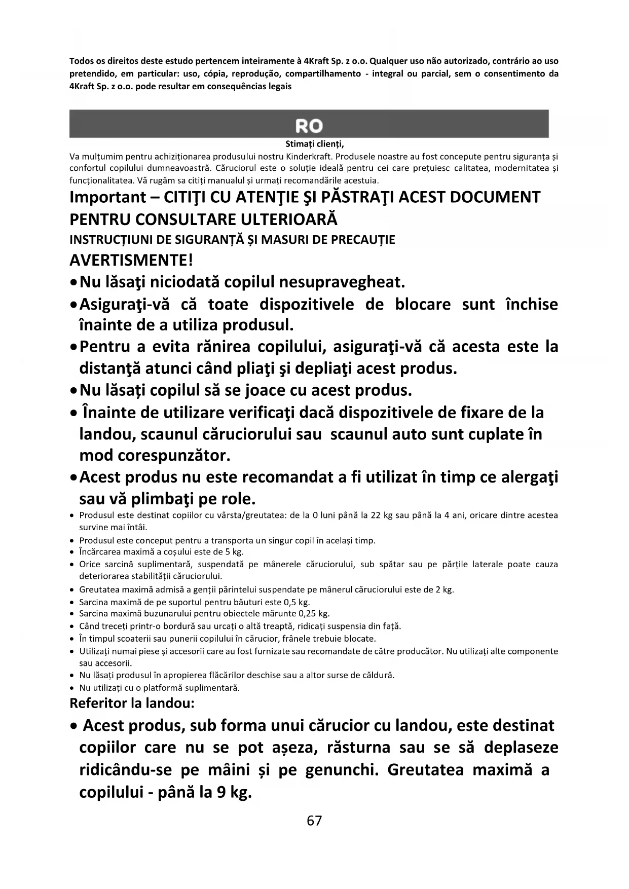 Todos os direitos deste estudo pertencem inteiramente à 4Kraft Sp. z o.o. Qualquer uso não autorizado, contrário ao uso pretendido, em particular: uso, cópia, reprodução, compartilhamento - integral ou parcial, sem o consentimento da 4Kraft Sp. z o.o. pode resultar em consequências legais Stimați clienți, Va mulțumim pentru achiziționarea produsului nostru Kinderkraft. Produsele noastre au fost concepute pentru siguranța și confortul copilului dumneavoastră. Căruciorul este o soluție ideală pentru cei care prețuiesc calitatea, modernitatea și funcționalitatea. Vă rugăm sa citiți manualul și urmați recomandările acestuia. Important – CITIŢI CU ATENŢIE ŞI PĂSTRAŢI ACEST DOCUMENT