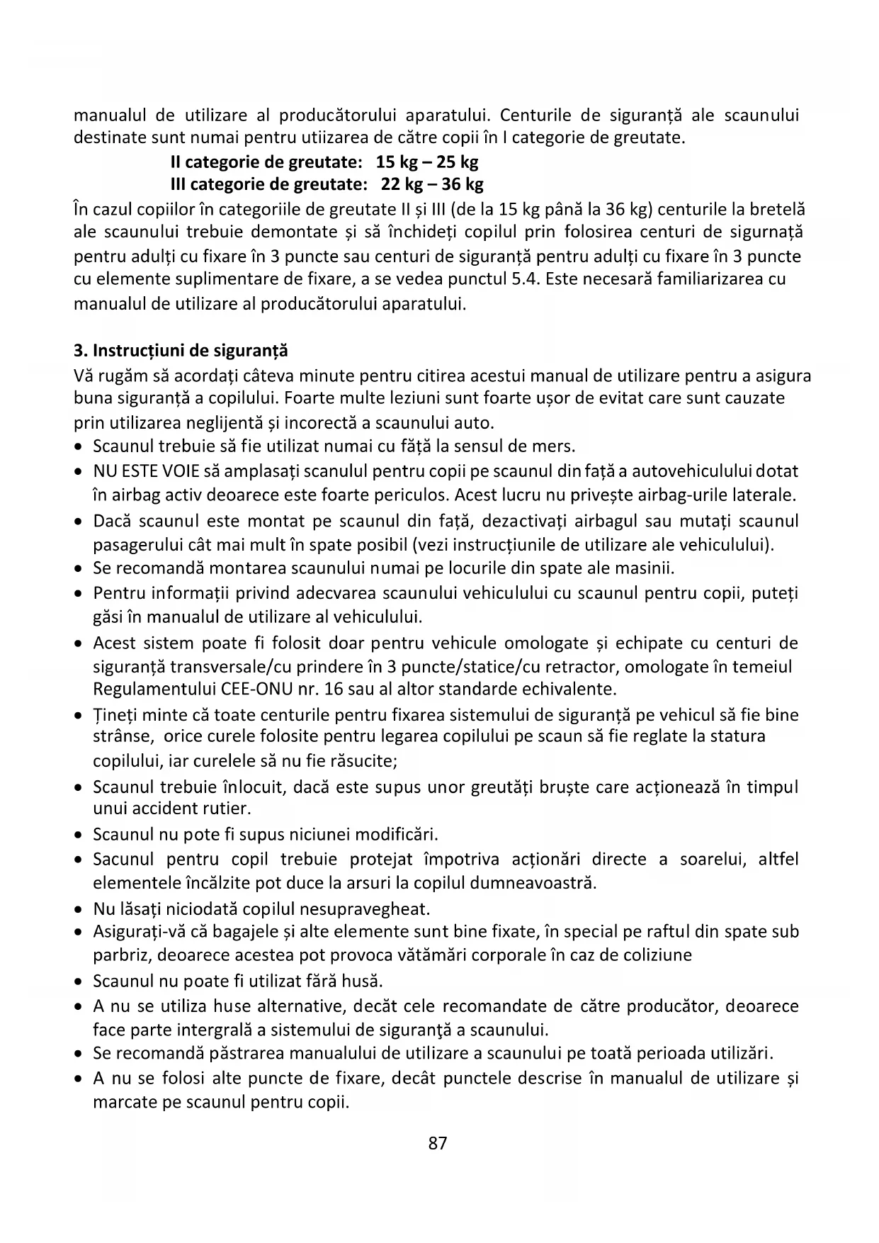Scaunul este destinat pentru copii în categoriia de greutate de la I până la III deci cu o greutate între 9 kg și 36 kg (de la aprox. 9 luni până la vârsta de 11 ani). I categorie de greutate: 9 kg – 18 kg În sistemul de fixare ISOFIX și centuri superioare de fixare. Este necesară familiarizarea cu87 manualul de utilizare al producătorului aparatului. Centurile de siguranță ale scaunului destinate sunt numai pentru utiizarea de către copii în I categorie de greutate. II categorie de greutate: 15 kg – 25 kg III categorie de greutate: 22 kg – 36 kg În cazul copiilor în categoriile de greutate II și III (de la 15 kg până la 36 kg) centurile la bretelă ale scaunului trebuie demontate și să închideți copilul prin folosirea centuri de sigurnață pentru adulți cu fixare în 3 puncte sau centuri de siguranță pentru adulți cu fixare în 3 puncte cu elemente suplimentare de fixare, a se vedea punctul 5.4. Este necesară familiarizarea cu manualul de utilizare al producătorului aparatului.