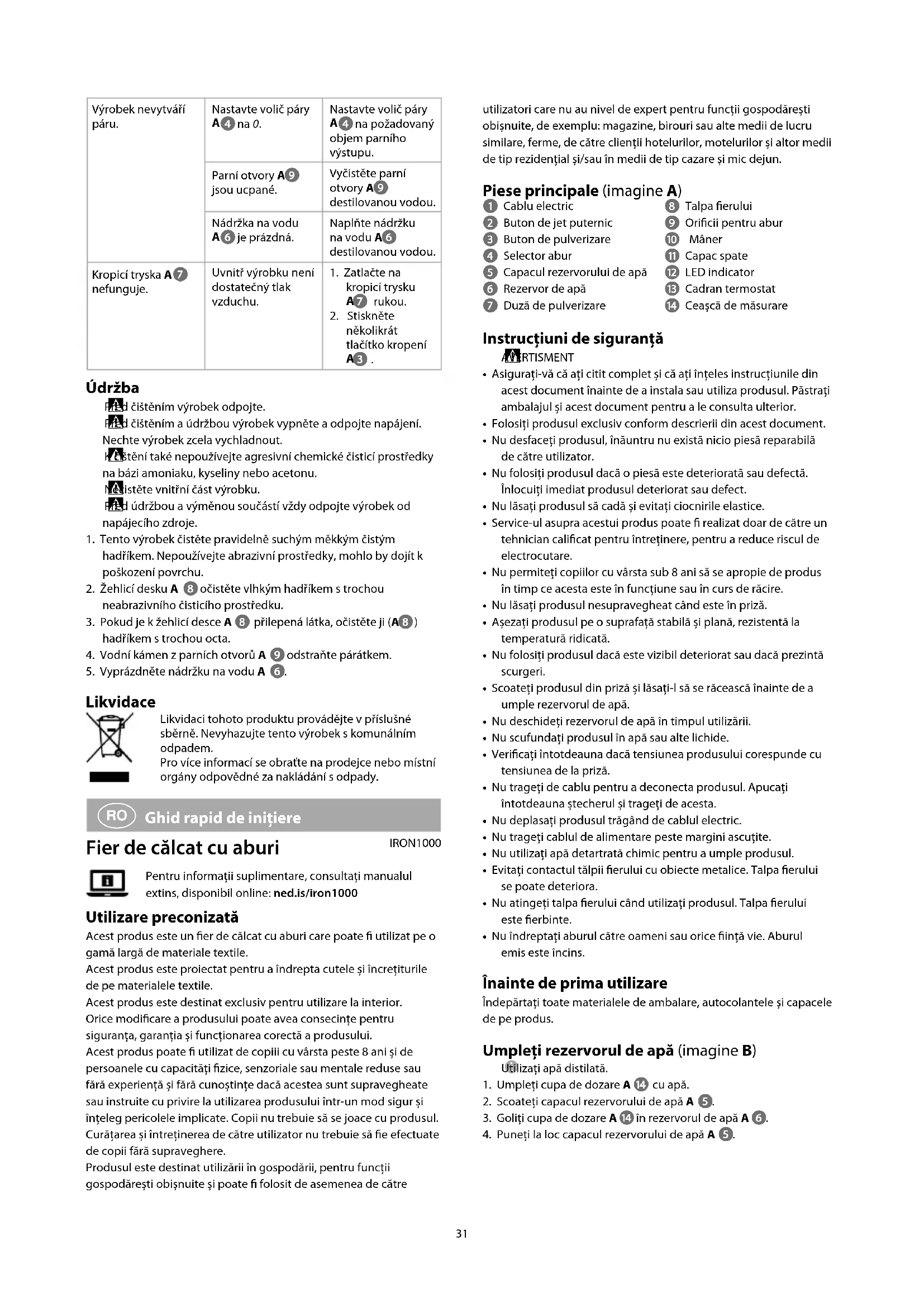 Ghid rapid de inițiere Fier de călcat cu aburi IRON1000Pentru informații suplimentare, consultați manualul extins, disponibil online: ned.is/iron1000 Utilizare preconizată Acest produs este un er de călcat cu aburi care poate utilizat pe o gamă largă de materiale textile.Acest produs este proiectat pentru a îndrepta cutele și încrețiturile de pe materialele textile.Acest produs este destinat exclusiv pentru utilizare la interior.Orice modicare a produsului poate avea consecințe pentru siguranța, garanția și funcționarea corectă a produsului.Acest produs poate utilizat de copiii cu vârsta peste 8 ani și de persoanele cu capacități zice, senzoriale sau mentale reduse sau fără experiență și fără cunoștințe dacă acestea sunt supravegheate sau instruite cu privire la utilizarea produsului într-un mod sigur și înțeleg pericolele implicate. Copii nu trebuie să se joace cu produsul. Curățarea și întreținerea de către utilizator nu trebuie să e efectuate de copii fără supraveghere.Produsul este destinat utilizării în gospodării, pentru funcții gospodărești obișnuite și poate folosit de asemenea de către32 Remedierea defecțiunilor Problemă Cauza posibilă Posibilă soluție Produsul nu produce căldură. Cadranul termostatului A