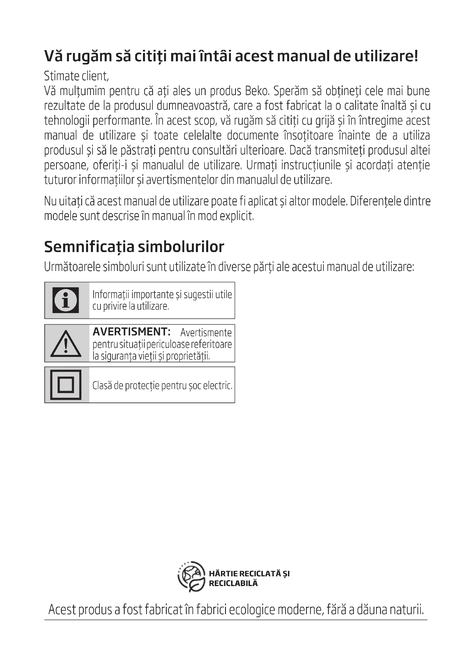 Prima di contattare l’assistenza tecnica, al ne di agevolare la gestione della chiamata, è necessario avere a portata di mano il modello del prodotto e il documento scale di acquisto.Vă rugăm să citiți mai întâi acest manual de utilizare! Stimate client, Vă mulțumim pentru că ați ales un produs Beko. Sperăm să obțineți cele mai bune rezultate de la produsul dumneavoastră, care a fost fabricat la o calitate înaltă și cu tehnologii performante. În acest scop, vă rugăm să citiți cu grijă și în întregime acest manual de utilizare și toate celelalte documente însoțitoare înainte de a utiliza produsul și să le păstrați pentru consultări ulterioare. Dacă transmiteți produsul altei persoane, oferiți-i și manualul de utilizare. Urmați instrucțiunile și acordați atenție tuturor informațiilor și avertismentelor din manualul de utilizare. Nu uitați că acest manual de utilizare poate fi aplicat și altor modele. Diferențele dintre modele sunt descrise în manual în mod explicit. Semnificația simbolurilor Următoarele simboluri sunt utilizate în diverse părți ale acestui manual de utilizare: