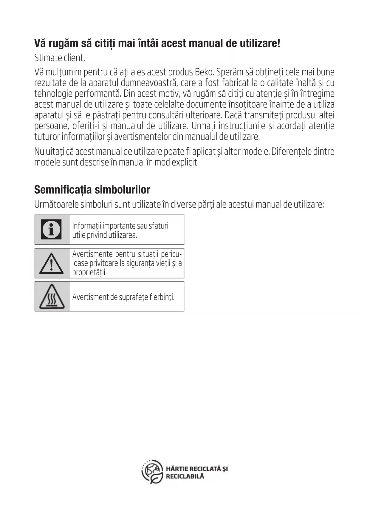 - Изпускането на уреда ще го направи неработещо или ще причини трайни повреди.Vă rugăm să citiți mai întâi acest manual de utilizare! Stimate client, Vă mulțumim pentru că ați ales acest produs Beko. Sperăm să obțineți cele mai bune rezultate de la aparatul dumneavoastră, care a fost fabricat la o calitate înaltă și cu tehnologie performantă. Din acest motiv, vă rugăm să citiți cu atenție și în întregime acest manual de utilizare și toate celelalte documente însoțitoare înainte de a utiliza aparatul și să le păstrați pentru consultări ulterioare. Dacă transmiteți produsul altei persoane, oferiți-i și manualul de utilizare. Urmați instrucțiunile și acordați atenție tuturor informațiilor și avertismentelor din manualul de utilizare. Nu uitați că acest manual de utilizare poate fi aplicat și altor modele. Diferențele dintre modele sunt descrise în manual în mod explicit. Semnificația simbolurilor Următoarele simboluri sunt utilizate în diverse părți ale acestui manual de utilizare:
