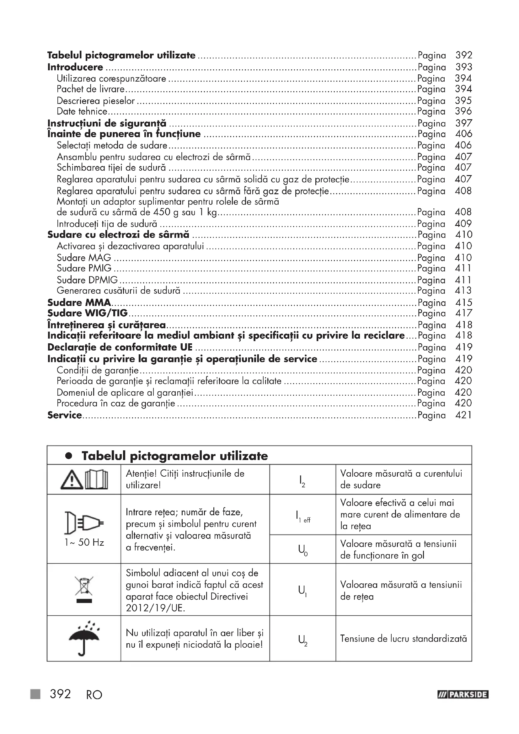z Întreținerea și curățarea INDICAȚIE: În vederea unei funcționări ireproșabile, precum și pentru respectarea cerințelor de siguranță, aparatul de sudură trebuie întreținut și revizuit periodic. Utilizarea necorespunzătoare sau greșită poate duce la defectarea aparatului. Solicitați ca reparațiile să fie efectuate numai de electricieni calificați. Înainte de efectua la aparatul de sudură lucrări de întreținere, decuplați alimentarea cu curent de la rețea și dezactivați de la întrerupătorul principal aparatul. Curățați periodic aparatul de sudură și accesoriile folosind aer, vată de curățat sau o perie. În cazul unei defecțiuni sau dacă este necesară înlocuirea unor componente ale aparatului, apelați la personal de specialitate, calificat. z Indicații referitoare la mediul ambiant și specificații cu privire la reciclare NU ARUNCAȚI ECHIPAMENTELE ELECTRICE ÎMPREUNĂ CU GUNOIUL MENAJER! RECUPERAREA MATERIEI PRIME ÎN LOCUL ELIMINĂRII DEȘEURILOR! În conformitate cu Directiva europeană 2012/19/UE, aparatele electrice trebuie colectate separat și reciclate. Simbolul coșului de gunoi barat înseamnă că acest aparat nu trebuie eliminat împreună cu deșeurile menajere la sfârșitul duratei sale de funcționare. Aparatul trebuie dus la punctele de colectare, la centrele de reciclare sau la companiile de eliminare a deșeurilor. Vom elimina gratuit dispozitivele defecte returnate. În plus, distribuitorii de echipamente electrice și electronice, precum și distribuitorii de produse alimentare sunt obligați să preia înapoi echipamentele. LIDL vă oferă opțiuni de returnare direct în magazine și piețe. Returnarea și eliminarea sunt gratuite pentru dumneavoastră. Atunci când achiziționați un aparat nou, aveți dreptul de a returna gratuit un aparat vechi corespunzător. În plus, aveți opțiunea de a returna gratuit (până la trei) aparate vechi care nu depășesc 25 cm în orice dimensiune, indiferent de achiziționarea unui aparat nou. Vă rugăm să ștergeți toate datele personale înainte de a returna echipamentul. Înainte de a returna aparatul, vă rugăm să scoateți bateriile sau acumulatorii care nu sunt încorporați în aparatul vechi, precum și lămpile care pot fi scoase fără a le deteriora și sa le duceți la un punct de colectare separat. Bateriile cu conținut nociv sunt marcate cu simboluri suplimentare care indică interdicția eliminării la gunoiul menajer. Simbolurile chimice ale metalelor grele sunt următoarele: Cd = cadmiu, Hg = mercur, Pb = plumb. Predați bateriile uzate la o unitate de reciclare din localitatea dumneavoastră sau returnați-le comerciantului. Vă îndepliniți astfel obligațiile legale și aduceți o contribuție importantă la protejarea mediului înconjurător. Respectați marcajul de pe diversele materiale de ambalare și separați-le separat, dacă este cazul. Materialele de ambalare sunt marcate cu abrevierile (a) și cifrele (b), cu următoarea semnificație: 1-7: plastic, 20-22: hârtie și carton, 80-98: materiale compozite.RO