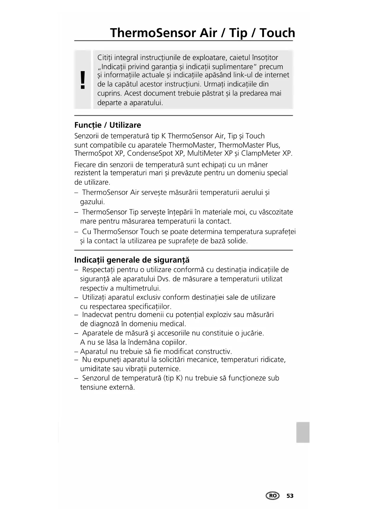 Senzorii de temperatură tip K ThermoSensor Air, Tip și Touch sunt compatibile cu aparatele ThermoMaster, ThermoMaster Plus, ThermoSpot XP, CondenseSpot XP, MultiMeter XP și ClampMeter XP. Fiecare din senzorii de temperatură sunt echipați cu un mâner rezistent la temperaturi mari și prevăzute pentru un domeniu special de utilizare. – ThermoSensor Air servește măsurării temperaturii aerului și gazului. – ThermoSensor Tip servește înțepării în materiale moi, cu vâscozitate mare pentru măsurarea temperaturii la contact. – Cu ThermoSensor Touch se poate determina temperatura suprafeței și la contact la utilizarea pe suprafețe de bază solide. – Respectați pentru o utilizare conformă cu destinația indicațiile de siguranță ale aparatului Dvs. de măsurare a temperaturii utilizat respectiv a multimetrului. – Utilizaţi aparatul exclusiv conform destinaţiei sale de utilizare cu respectarea specicaţiilor. – Inadecvat pentru domenii cu potențial exploziv sau măsurări de diagnoză în domeniu medical. – Aparatele de măsură şi accesoriile nu constituie o jucărie. A nu se lăsa la îndemâna copiilor. – Aparatul nu trebuie să e modicat constructiv. – Nu expuneţi aparatul la solicitări mecanice, temperaturi ridicate, umiditate sau vibraţii puternice. – Senzorul de temperatură (tip K) nu trebuie să funcționeze sub tensiune externă. Indicaţii generale de siguranţă Funcţie / Utilizare Citiți integral instrucțiunile de exploatare, caietul însoțitor „Indicații privind garanția și indicații suplimentare“ precum și informațiile actuale și indicațiile apăsând link-ul de internet de la capătul acestor instrucțiuni. Urmați indicațiile din cuprins. Acest document trebuie păstrat și la predarea mai departe a aparatului.