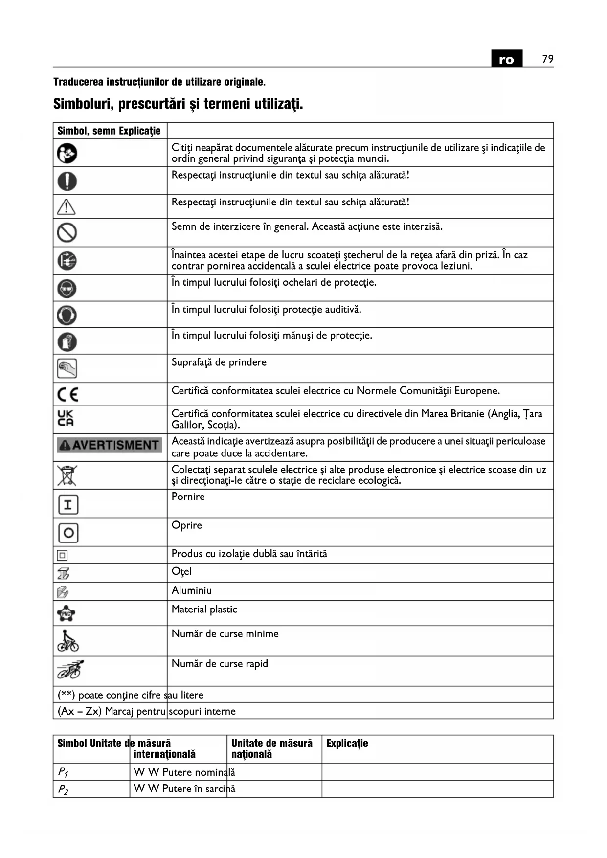 Traducerea instrucțiunilor de utilizare originale. Simboluri, prescurtări şi termeni utilizaţi. Simbol, semn Explicaţie Citiţi neapărat documentele alăturate precum instrucţiunile de utilizare şi indicaţiile de ordin general privind siguranţa şi potecţia muncii. Respectaţi instrucţiunile din textul sau schiţa alăturată! Respectaţi instrucţiunile din textul sau schiţa alăturată! Semn de interzicere în general. Această acţiune este interzisă. Înaintea acestei etape de lucru scoateţi ştecherul de la reţea afară din priză. În caz contrar pornirea accidentală a sculei electrice poate provoca leziuni. În timpul lucrului folosiţi ochelari de protecţie. În timpul lucrului folosiţi protecţie auditivă. În timpul lucrului folosiţi mănuşi de protecţie. Suprafaţă de prindere Certifică conformitatea sculei electrice cu Normele Comunităţii Europene. Certifică conformitatea sculei electrice cu directivele din Marea Britanie (Anglia, Țara Galilor, Scoția). Această indicaţie avertizează asupra posibilităţii de producere a unei situaţii periculoase care poate duce la accidentare. Colectaţi separat sculele electrice şi alte produse electronice şi electrice scoase din uz şi direcţionaţi-le către o staţie de reciclare ecologică. Pornire Oprire Produs cu izolaţie dublă sau întărită Oţel Aluminiu Material plastic Număr de curse minime Număr de curse rapid (**) poate conţine cifre sau litere (Ax – Zx) Marcaj pentru scopuri interne Simbol Unitate de măsură internaţională Unitate de măsură naţională Explicaţie
