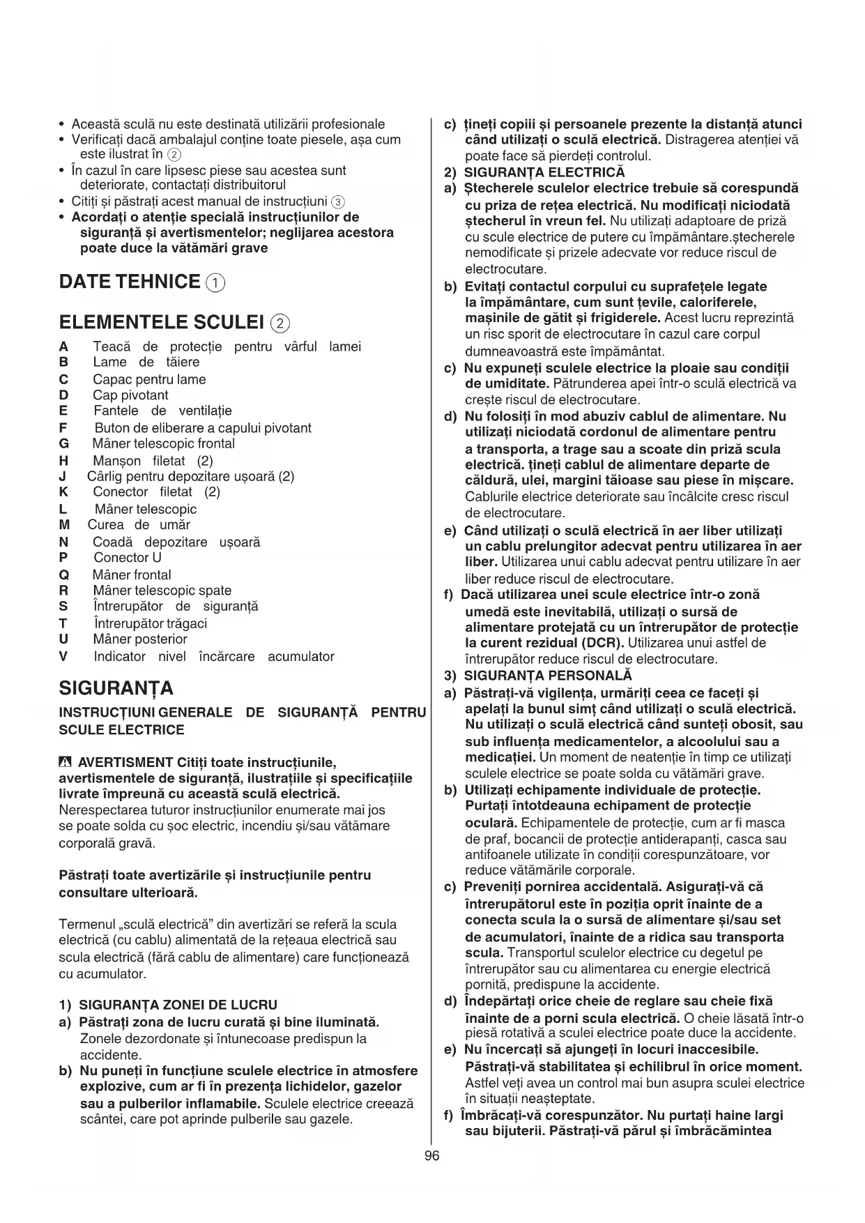 - Acordaţi o atenţie specială instrucţiunilor de siguranţă și avertismentelor; neglijarea acestora poate duce la vătămări grave DATE TEHNICE 1 ELEMENTELE SCULEI 2 A Teacă de protecţie pentru vârful lamei B Lame de tăiere C Capac pentru lame D Cap pivotant E Fantele de ventilaţie F Buton de eliberare a capului pivotant G Mâner telescopic frontal H Manșon letat (2)
