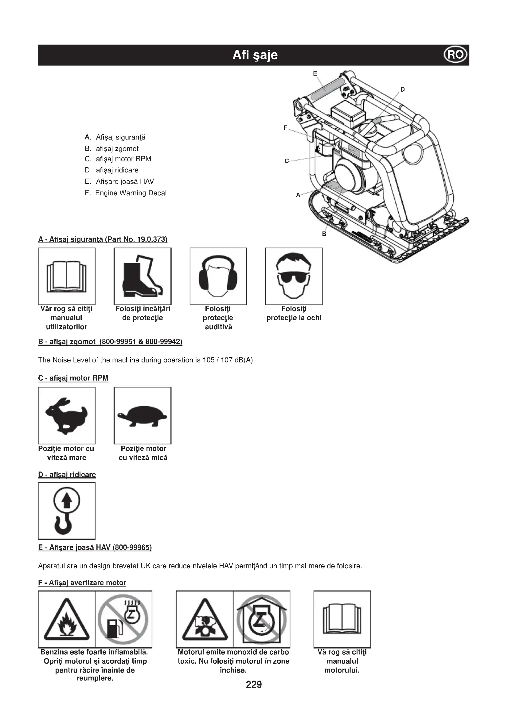 A - A¿ úaj siguranĠă (Part No. 19.0.373) Văr rog să citiĠi manualul utilizatorilor FolosiĠi încălĠări de protecĠie FolosiĠi protecĠie auditivă FolosiĠi protecĠie la ochi B - a¿ úaj zgomot (800-99951 & 800-99942) The Noise Level of the machine during operation is 105 / 107 dB(A) C - a¿ úaj motor RPM A. A¿ úaj siguranĠă B. a¿ úaj zgomot C. a¿ úaj motor RPM D a¿ úaj ridicare E. A¿ úare joasă HAV F. Engine Warning Decal PoziĠie motor cu viteză mare PoziĠie motor cu viteză mică D - a¿ úaj ridicare E - A¿ úare joasă HAV (800-99965) Aparatul are un design brevetat UK care reduce nivelele HAV permiĠând un timp mai mare de folosire. F - A¿ úaj avertizare motor Vă rog să citiĠi manualul motorului. Benzina este foarte inÀ amabilă. OpriĠi motorul úi acordaĠi timp pentru răcire înainte de reumplere. Motorul emite monoxid de carbo toxic. Nu folosiĠi motorul în zone închise.